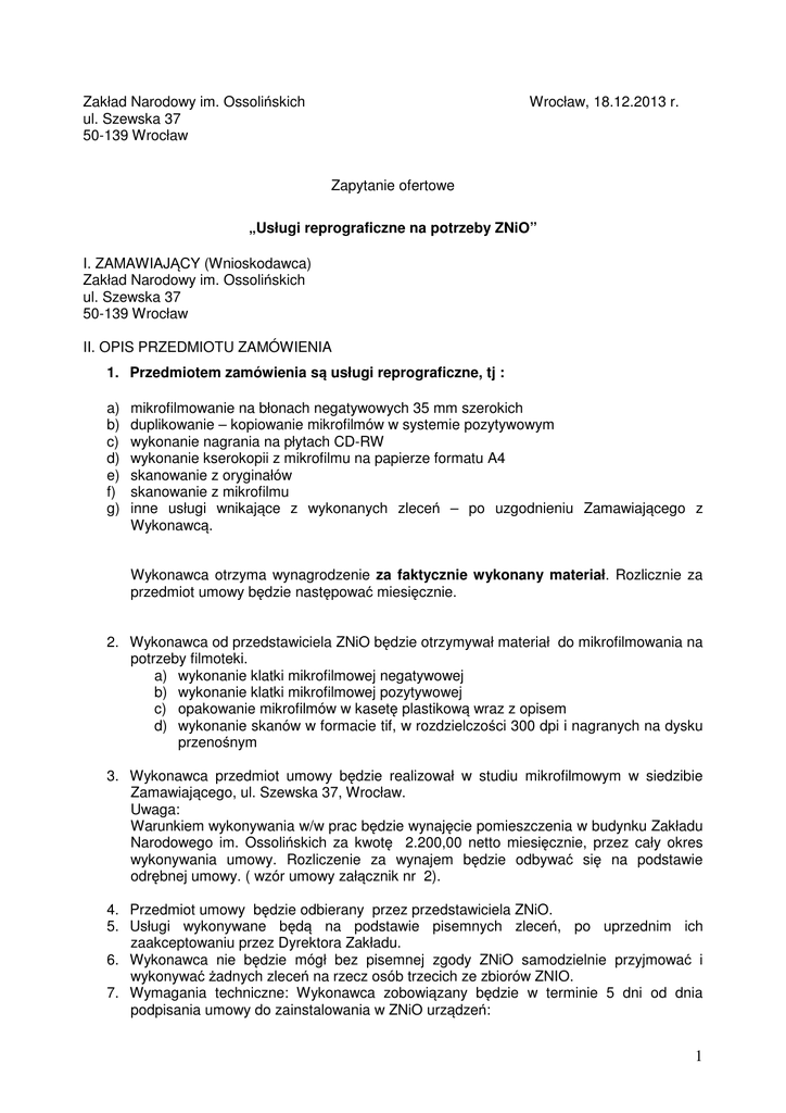 Zapytanie ofertowe - Zakład Narodowy im. Ossolińskich