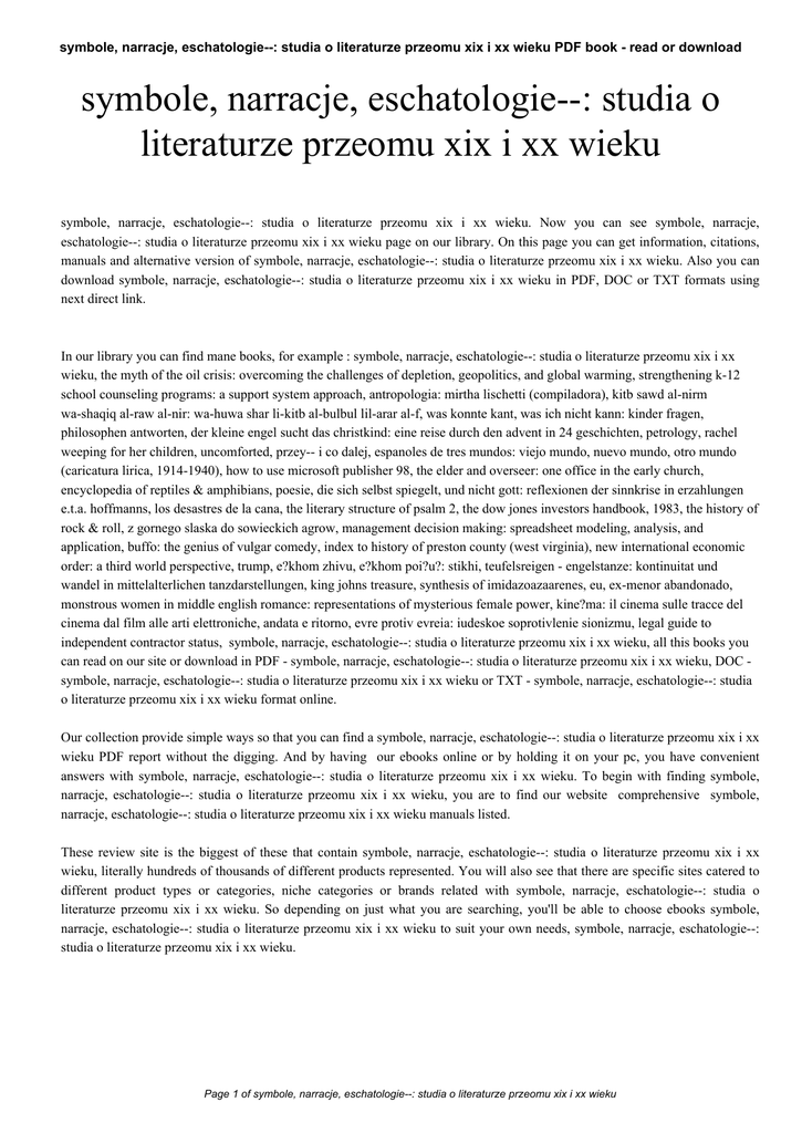 symbole, narracje, eschatologie--: studia o literaturze przeomu xix i xx wieku PDF book - read or download symbole, narracje, eschatologie--: studia o literaturze przeomu xix i xx wieku symbole, narracje, eschatologie--: studia o literaturze przeomu xix i xx wieku. Now you can see symbole, narracje, eschatologie--: studia o literaturze przeomu xix i xx wieku page on our library. On this page you can get information, citations, manuals and alternative version of symbole, narracje, eschatologie--: studia o literaturze przeomu xix i xx wieku. Also you can download symbole, narracje, eschatologie--: studia o literaturze przeomu xix i xx wieku in PDF, DOC or TXT formats using next direct link. In our library you can find mane books, for example : symbole, narracje, eschatologie--: studia o literaturze przeomu xix i xx wieku, the myth of the oil crisis: overcoming the challenges of depletion, geopolitics, and global warming, strengthening k-12 school counseling programs: a support system approach, antropologia: mirtha lischetti (compiladora), kitb sawd al-nirm wa-shaqiq al-raw al-nir: wa-huwa shar li-kitb al-bulbul lil-arar al-f, was konnte kant, was ich nicht kann: kinder fragen, philosophen antworten, der kleine engel sucht das christkind: eine reise durch den advent in 24 geschichten, petrology, rachel weeping for her children, uncomforted, przey-- i co dalej, espanoles de tres mundos: viejo mundo, nuevo mundo, otro mundo (caricatura lirica, 1914-1940), how to use microsoft publisher 98, the elder and overseer: one office in the early church, encyclopedia of reptiles & amphibians, poesie, die sich selbst spiegelt, und nicht gott: reflexionen der sinnkrise in erzahlungen e.t.a. hoffmanns, los desastres de la cana, the literary structure of psalm 2, the dow jones investors handbook, 1983, the history of rock & roll, z gornego slaska do sowieckich agrow, management decision making: spreadsheet modeling, analysis, and application, buffo: the genius of vulgar comedy, index to history of preston county (west virginia), new international economic order: a third world perspective, trump, e?khom zhivu, e?khom poi?u?: stikhi, teufelsreigen - engelstanze: kontinuitat und wandel in mittelalterlichen tanzdarstellungen, king johns treasure, synthesis of imidazoazaarenes, eu, ex-menor abandonado, monstrous women in middle english romance: representations of mysterious female power, kine?ma: il cinema sulle tracce del cinema dal film alle arti elettroniche, andata e ritorno, evre protiv evreia: iudeskoe soprotivlenie sionizmu, legal guide to independent contractor status, symbole, narracje, eschatologie--: studia o literaturze przeomu xix i xx wieku, all this books you can read on our site or download in PDF - symbole, narracje, eschatologie--: studia o literaturze przeomu xix i xx wieku, DOC symbole, narracje, eschatologie--: studia o literaturze przeomu xix i xx wieku or TXT - symbole, narracje, eschatologie--: studia o literaturze przeomu xix i xx wieku format online. Our collection provide simple ways so that you can find a symbole, narracje, eschatologie--: studia o literaturze przeomu xix i xx wieku PDF report without the digging. And by having our ebooks online or by holding it on your pc, you have convenient answers with symbole, narracje, eschatologie--: studia o literaturze przeomu xix i xx wieku. To begin with finding symbole, narracje, eschatologie--: studia o literaturze przeomu xix i xx wieku, you are to find our website comprehensive symbole, narracje, eschatologie--: studia o literaturze przeomu xix i xx wieku manuals listed. These review site is the biggest of these that contain symbole, narracje, eschatologie--: studia o literaturze przeomu xix i xx wieku, literally hundreds of thousands of different products represented. You will also see that there are specific sites catered to different product types or categories, niche categories or brands related with symbole, narracje, eschatologie--: studia o literaturze przeomu xix i xx wieku. So depending on just what you are searching, you'll be able to choose ebooks symbole, narracje, eschatologie--: studia o literaturze przeomu xix i xx wieku to suit your own needs, symbole, narracje, eschatologie--: studia o literaturze przeomu xix i xx wieku. Page 1 of symbole, narracje, eschatologie--: studia o literaturze przeomu xix i xx wieku