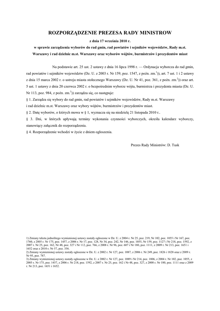 ROZPORZĄDZENIE PREZESA RADY MINISTROW z dnia 17 września 2010 r. w sprawie zarządzenia wyborów do rad gmin, rad powiatów i sejmików województw, Rady m.st. Warszawy i rad dzielnic m.st. Warszawy oraz wyborów wójtów, burmistrzów i prezydentów miast Na podstawie art. 25 ust. 2 ustawy z dnia 16 lipca 1998 r. — Ordynacja wyborcza do rad gmin, rad powiatów i sejmików województw (Dz. U. z 2003 r. Nr 159, poz. 1547, z poźn. zm.1)), art. 7 ust. 1 i 2 ustawy z dnia 15 marca 2002 r. o ustroju miasta stołecznego Warszawy (Dz. U. Nr 41, poz. 361, z poźn. zm.2)) oraz art. 5 ust. 1 ustawy z dnia 20 czerwca 2002 r. o bezpośrednim wyborze wójta, burmistrza i prezydenta miasta (Dz. U. Nr 113, poz. 984, z poźn. zm.3)) zarządza się, co następuje: § 1. Zarządza się wybory do rad gmin, rad powiatów i sejmików województw, Rady m.st. Warszawy i rad dzielnic m.st. Warszawy oraz wybory wójtów, burmistrzów i prezydentów miast. § 2. Datę wyborów, o których mowa w § 1, wyznacza się na niedzielę 21 listopada 2010 r.. § 3. Dni, w których upływają terminy wykonania czynności wyborczych, określa kalendarz wyborczy, stanowiący załącznik do rozporządzenia. § 4. Rozporządzenie wchodzi w Ŝycie z dniem ogłoszenia. Prezes Rady Ministrów: D. Tusk 1) Zmiany tekstu jednolitego wymienionej ustawy zostały ogłoszone w Dz. U. z 2004 r. Nr 25, poz. 219, Nr 102, poz. 1055 i Nr 167, poz. 1760, z 2005 r. Nr 175, poz. 1457, z 2006 r. Nr 17, poz. 128, Nr 34, poz. 242, Nr 146, poz. 1055, Nr 159, poz. 1127 i Nr 218, poz. 1592, z 2007 r. Nr 25, poz. 162, Nr 48, poz. 327 i Nr 112, poz. 766, z 2008 r. Nr 96, poz. 607 i Nr 180, poz. 1111, z 2009 r. Nr 213, poz. 1651 i 1652 oraz z 2010 r. Nr 57, poz. 356. 2) Zmiany wymienionej ustawy zostały ogłoszone w Dz. U. z 2002 r. Nr 127, poz. 1087, z 2006 r. Nr 249, poz. 1826 i 1828 oraz z 2009 r. Nr 95, poz. 787. 3) Zmiany wymienionej ustawy zostały ogłoszone w Dz. U. z 2002 r. Nr 127, poz. 1089 i Nr 214, poz. 1806, z 2004 r. Nr 102, poz. 1055, z 2005 r. Nr 175, poz. 1457, z 2006 r. Nr 218, poz. 1592, z 2007 r. Nr 25, poz. 162 i Nr 48, poz. 327, z 2008 r. Nr 180, poz. 1111 oraz z 2009 r. Nr 213, poz. 1651 i 1652. Załącznik do rozporządzenia Prezesa Rady Ministrów z dnia 17 września 2010 r. KALENDARZ WYBORCZY Termin wykonania czynności wyborczej do 2 października 2010 r. • • do 4 października 2010 r. • do 7 października 2010 r. do 22 października 2010 r. do godz. 24.00 • • do 27 października 2010 r. • • do godz. 24.00 do 29 października 2010 r. • do 31 października 2010 r. • • do 6 listopada 2010 r. • od 6 listopada 2010 r. • do 7 listopada 2010 r. • • Treść czynności wyborczej podanie do publicznej wiadomości, w formie obwieszczenie, informacji o okręgach wyborczych, ich granicach, numerach i liczbie radnych wybieranych w kaŜdym okręgu wyborczym oraz o wyznaczonej siedzibie terytorialnej komisji wyborczej dla wyborów do rad gmin, rad powiatów i sejmików województw, Rady m. st. Warszawy i rad dzielnic m. st. Warszawy oraz wyborów wójtów, burmistrzów i prezydentów miast, zawiadomienie odpowiednio Państwowej Komisji Wyborczej lub właściwego komisarza wyborczego o utworzeniu komitetu wyborczego oraz o zamiarze zgłaszania kandydatów na radnych zgłaszanie komisarzom wyborczym kandydatów na członków terytorialnych komisji wyborczych powołanie przez komisarza wyborczego terytorialnych komisji wyborczych zgłaszanie terytorialnym komisjom wyborczym list kandydatów na radnych, odrębnie dla kaŜdego okręgu wyborczego dla wyborów do rad gmin, rad powiatów i sejmików województw, Rady m. st. Warszawy i rad dzielnic m. st. Warszawy przyznanie przez Państwową Komisję Wyborczą jednolitych numerów dla list tych komitetów wyborczych, które zarejestrowały listy kandydatów w ponad połowie okręgów w wyborach do wszystkich sejmików województw, zgłaszanie gminnym komisjom wyborczym kandydatów na wójtów, burmistrzów i prezydentów miast przyznanie przez komisarza wyborczego, wykonującego zadania o charakterze ogólnowojewódzkim, numerów dla list tych komitetów wyborczych, które zarejestrowały co najmniej jedną listę kandydatów w wyborach do sejmiku województwa i nie został im przyznany numer przez Państwową Komisję Wyborczą przyznanie przez komisarza wyborczego numerów dla list tych komitetów wyborczych, które zarejestrowały co najmniej jedną listę kandydatów w wyborach do rady powiatu i nie został im przyznany numer przez Państwową Komisję Wyborczą ani przez komisarza wyborczego, wykonującego zadania o charakterze ogólnowojewódzkim podanie do publicznej wiadomości, w formie obwieszczenia, informacji o numerach i granicach obwodów głosowania oraz o wyznaczonych siedzibach obwodowych komisji wyborczych rozplakatowanie obwieszczeń: a) właściwych terytorialnych komisji wyborczych o zarejestrowanych listach kandydatów na radnych zawierających numery list, skróty nazw komitetów, dane o kandydatach umieszczone w zgłoszeniach list wraz z ewentualnymi oznaczeniami kandydatów oraz treść oświadczeń lustracyjnych stwierdzających fakt pracy lub słuŜby w organach bezpieczeństwa państwa lub współpracy z nimi, b) gminnych komisji wyborczych o zarejestrowanych listach kandydatów na wójtów, burmistrzów i prezydentów miast, na których umieszczone są, w kolejności alfabetycznej nazwisk: nazwiska, imiona, wiek, wykształcenie, miejsce zamieszkania, nazwa komitetu zgłaszającego kandydata, nazwa partii politycznej, do której naleŜy kandydat oraz treść oświadczeń lustracyjnych stwierdzających fakt pracy lub słuŜby w organach bezpieczeństwa państwa lub współpracy z nimi, nieodpłatne rozpowszechnianie audycji wyborczych w programach telewizji publicznej i publicznego radia powołanie przez gminną komisję wyborczą obwodowych komisji wyborczych, sporządzenie spisu wyborców w urzędzie gminy do 11 listopada 2010 r. do 16 