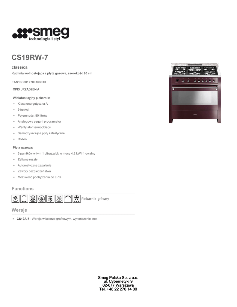 CS19RW-7 classica Kuchnia wolnostojąca z płytą gazowa, szerokość 90 cm EAN13: 8017709163013 OPIS URZĄDZENIA Wielofunkcyjny piekarnik: Klasa energetyczna A 9 funkcji Pojemność: 80 litrów Analogowy zegar i programator Wentylator termoobiegu Samoczyszczące płyty katalityczne Rożen Płyta gazowa: 6 palników w tym 1 ultraszybki o mocy 4,2 kW i 1 owalny Żeliwne ruszty Automatyczne zapalanie Zawory bezpieczeństwa Możliwość podłączenia do LPG Functions Piekarnik główny Wersje CS19A-7 - Wersja w kolorze grafitowym, wykończenie inox Smeg Polska Sp. z o.o. ul. Cybernetyki 9 02-677 Warszawa Tel. +48 22 276 14 00 CS19RW-7 classica Opera 90x60 cm czerwone wino rodzaj płyty kuchennej: gazowa rodzaj piekarnika: elektryczny klasa energochłonności A Piekarnik główny WENTYLATOR, GRZAŁKA DOLNA: Dodanie dolnej grzałki do wymuszonego obiegu podnosi temperaturę w dolnej części potrawy, zapewniając jej skuteczniejsze pieczenie środka bez przypiekania powierzchni. GRZAŁKA GÓRNA I DOLNA: Włączenie tych 2 grzałek stosuje się w pieczeniu tradycyjnym, odpowiednim do przygotowanie potraw wymagających delikatnego podgrzewania, jak np. pieczenie ciasta. Piekarnik powinien zostać wstępnie nagrzany do wymaganej temperatury, a naczynie ustawione po środku. Jest to metoda , która najlepiej sprawdza się w przypadku większych, pojedynczych wypieków. WENTYLATOR, GRZAŁKA GÓRNA I DOLNA: Grzałki w połączeniu z wentylatorem zapewniają równomierną temperaturę w całej komorze. Jest to metoda dająca podobne efekty do pieczenia tradycyjnego. Mniej wydajna od użycia wentylatora i 3 grzalek. Najlepsza do wypieku ciast. WENTYLATOR, GRZAŁKA PIERŚCIENIOWA: Grzałka w połączeniu z wentylatorem zapewniają równomierną temperaturę w całej komorze, na wszystkich półkach. Podczas pieczenia potraw ponad 20 minut, niepotrzebne jest stosowanie wstepnego rozgrzania piekarnika. Jest to metoda dająca oszczędność energii, kótszy czas podgrzewania. idealna do odgrzewania zimnych potraw. WENTYLATOR I GRZAŁKA GRILLA: Pieczenie przy uzyciu tej funkcji musi przebiegać przy zamkniętych drzwiczkach. Wentylator łagodzi silne grzanie grilla, jednocześnie zapewniając doskonałe grillowanie bez potrzeby odwracania pieczonej potrawy. Otrzymujemy potrawę doskonale przypieczoną, a zarazem soczystą. Najlepsze efekty zapewnia pieczenie na dwóch górnych półkach. Dolna część piekarnika może być w tym czasie wykorzystana do podgrzania innych potraw. WENTYLATOR, GRZAŁKA PIERŚCIENIOWA I DOLNA: Dodanie grzałki dolnej powoduje dostarczenie dodatkowego ciepła do spodu potrawy niezbędnego do jej podgrzania. GRZAŁKA GRILLA: Funkcja uzywana do szybkiego podgrzewania. Aby uzyskać najlepsze rezultaty należy małe potrawy umieścić na górnej półce, a potrawy większe - na dolnej (np. mięso, lub kiełbasę). Najlepsze efekty uzyskuje się przy zamkniętych drzwiczkach, chyba że przepis podpowiada co innego. Blokada grzałek: Po wybraniu tej funkcji, urządzenie wyłacza grzałki nawet wtedy jeśli jest nastawiony termostat. Smeg Polska Sp. z o.o. ul. Cybernetyki 9 02-677 Warszawa Tel. +48 22 276 14 00 CS19RW-7 classica Opera 90x60 cm czerwone wino rodzaj płyty kuchennej: gazowa rodzaj piekarnika: elektryczny klasa energochłonności A Smeg Polska Sp. z o.o. ul. Cybernetyki 9 02-677 Warszawa Tel. +48 22 276 14 00