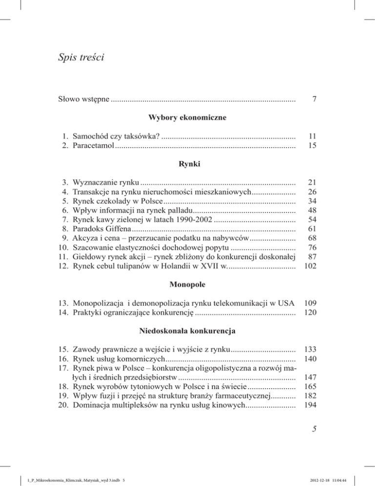 Spis treści Słowo wstępne.........................................................................................7 Wybory ekonomiczne 1. Samochód czy taksówka?................................................................. 2. Paracetamol....................................................................................... 11 15 Rynki 3. Wyznaczanie rynku........................................................................... 21 4. Transakcje na rynku nieruchomości mieszkaniowych...................... 26 5. Rynek czekolady w Polsce................................................................34 6. Wpływ informacji na rynek palladu..................................................48 7. Rynek kawy zielonej w latach 1990-2002........................................ 54 8. Paradoks Giffena............................................................................... 61 9. Akcyza i cena – przerzucanie podatku na nabywców....................... 68 10. Szacowanie elastyczności dochodowej popytu................................ 76 11. Giełdowy rynek akcji – rynek zbliżony do konkurencji doskonałej.87 12. Rynek cebul tulipanów w Holandii w XVII w.................................. 102 Monopole 13. Monopolizacja i demonopolizacja rynku telekomunikacji w USA. 109 14. Praktyki ograniczające konkurencję................................................. 120 Niedoskonała konkurencja 15. Zawody prawnicze a wejście i wyjście z rynku................................ 16. Rynek usług komorniczych............................................................... 17. Rynek piwa w Polsce – konkurencja oligopolistyczna a rozwój małych i średnich przedsiębiorstw......................................................... 18. Rynek wyrobów tytoniowych w Polsce i na świecie........................ 19. Wpływ fuzji i przejęć na strukturę branży farmaceutycznej............. 20. Dominacja multipleksów na rynku usług kinowych......................... 1_P_Mikroekonomia_Klimczak, Matysiak_wyd 3.indb 5 133 140 147 165 182 194 5 2012-12-18 11:04:44 21. Przeprawa promowa przez Odrę....................................................... 206 22. Skuteczność polityki kartelowej na przykładzie OPEC.................... 209 23. Cykl życia samochodu osobowego................................................... 219 Rynki czynników produkcji 24. Rynek ropy naftowej......................................................................... 227 Alternatywne teorie przedsiębiorstwa 25. Granica między przedsiębiorstwem a rynkiem................................. 237 Państwo na rynkach 26. Konkurencja na rynku usług transportu samochodowego i kolejowego w Polsce................................................................................... 249 27. Czy cukier nie poddaje się prawom rynku?...................................... 260 1_P_Mikroekonomia_Klimczak, Matysiak_wyd 3.indb 6 2012-12-18 11:04:44 Słowo wstępne Prezentujemy Czytelnikowi publikację dydaktyczną stanowiącą trzecią część pakietu podręczników akademickich służących do studiowania mikroekonomii. Uzupełnia ona podręcznik Bożeny Klimczak pt. Mikroekonomia oraz zbiór pytań i zadań pt. Mikroekonomia – ćwiczenia autorstwa Bożeny Borkowskiej i Bożeny Klimczak. Podręcznik pt. Mikroekonomia – studia przypadków jest wynikiem pracy zespołu Katedry Mikroekonomii i Ekonomii Instytucjonalnej Akademii Ekonomicznej we Wrocławiu. Pod redakcją Bożeny Klimczak i Andrzeja Matysiaka zostały opracowane przypadki służące do studiowania rzeczywistości gospodarczej z perspektywy wiedzy naukowej o podejmowaniu decyzji przez podmioty uczestniczące w rynkach oraz o funkcjonowaniu rynków, którą to wiedzę daje mikroekonomia. Zastosowanie metody przypadków do studiowania ma długą tradycję: stosowali ją Sokrates i Arystoteles. W czasach nowożytnych studiowanie przypadków rozpowszechniło się w szkołach prawa i biznesu. Metoda przypadków w nauczaniu prawa polega na studiowaniu spraw rozstrzygniętych przez wymiar sprawiedliwości. Studenci prawa, poznając materiały sądowe, przebieg rozpraw i orzecznictwo w określonych sprawach, uczą się, na czym polega zastosowanie ustawodawstwa i procedur w praktyce sądowej. Metoda przypadków w nauczaniu zarządzania służy rozwijaniu umiejętności studentów do formułowania problemów decyzyjnych i do uzasadniania konkretnych decyzji. Sukcesy pedagogiczne odnoszone w wyniku zastosowania metody przypadków w nauczaniu prawa i zarządzania spowodowały wzrost zainteresowania tą metodą. Obecnie stosuje się ją w naukach społecznych, a także w filozofii i etyce. Przypadki zebrane w podręczniku prezentowanym Czytelnikowi różnią się od przypadków, które analizują studenci prawa i zarządzania. Jest w nich zawarty opis realnego zdarzenia lub ciągu zdarzeń, w których uczestniczą nabywcy i sprzedawcy, konsumenci i producenci, działający na realnym rynku. Opis zdarzeń jest skupiony wokół problemu, który w mikroekonomii opisano i wyjaśniono za pomocą stosownych metod naukowych. Studiowanie takich przypadków polega na rozpoznaniu problemu, dobraniu odpowiednich pojęć, wskaźników i innych narzędzi opisu przedstawionych zdarzeń oraz na spraw 1_P_Mikroekonomia_Klimczak, Matysiak_wyd 3.indb 7 7 2012-12-18 11:04:44 dzeniu, czy zdarzenia przedstawione w przypadku mogą być wyjaśnione za pomocą twierdzeń mikroekonomii. W studiowaniu przypadków pomocne są pytania zamieszczone po każdej z analiz. Właściwe studiowanie przypadków polega na dyskusji w grupie studentów, przebiegającej pod kierunkiem nauczyciela akademickiego. Efektem dydaktycznym indywidualnej i zbiorowej pracy nad przypadkami jest przybliżenie studentom rzeczywistości gospodarczej z perspektywy mikroekonomii. Jedną z podstawowych zasad dydaktycznych jest zasada stopniowania trudności. Zastosowano ją w konstruowaniu poszczególnych przypadków. Rozważania zamieszczone w 