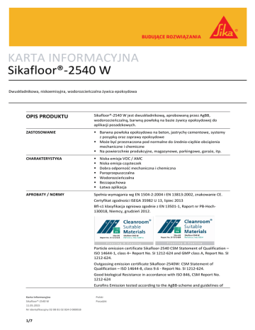 KARTA INFORMACYJNA Sikafloor®‐2540 W Dwuskładnikowa, niskoemisyjna, wodorozcieńczalna żywica epoksydowa OPIS PRODUKTU Sikafloor®‐2540 W jest dwuskładnikową, aprobowaną przez AgBB, wodorozcieńczalną, barwną powłoką na bazie żywicy epoksydowej do aplikacji posadzkowych. ZASTOSOWANIE Barwna powłoka epoksydowa na beton, jastrychy cementowe, systemy z posypką oraz zaprawy epoksydowe Może być przeznaczona pod normalne do średnio‐ciężkie obciążenia mechaniczne i chemiczne Na powierzchnie produkcyjne, magazynowe, parkingowe, garaże, itp. CHARAKTERYSTYKA APROBATY / NORMY Spełnia wymagania wg EN 1504‐2:2004 i EN 13813:2002, znakowanie CE. Niska emisja VOC / AMC Niska emisja cząsteczek Dobra odporność mechaniczna i chemiczna Paroprzepuszczalna Wodorozcieńczalna Bezzapachowa Łatwa aplikacja Certyfikat zgodności ISEGA 35982 U 13, lipiec 2013 Bfl‐s1 klasyfikacja ogniowa zgodnie z EN 13501‐1, Raport nr PB‐Hoch‐ 130018, Niemcy, grudzień 2012. Particle emission certificate Sikafloor‐2540 CSM Statement of Qualification – ISO 14644‐1, class 4– Report No. SI 1212‐624 and GMP class A, Report No. SI 1212‐624. Outgassing emission certificate Sikafloor‐2540W: CSM Statement of Qualification – ISO 14644‐8, class 9.6 ‐ Report No. SI 1212‐624. Good biological Resistance in accordance with ISO 846, CSM Report No. 1212‐624 Eurofins Emission tested according to the AgBB‐scheme and guidelines of Karta Informacyjna Polski Sikafloor®‐2540 W 11.05.2015 Posadzki Nr identyfikacyjny 02 08 01 02 024 0 000018 1/7 the DiBt (AgBB – Committee for Health‐related Evaluation of Building Products, DiBt – German Institute for Building Technology). Sampling, testing and evaluation were performed according to ISO‐16000, Report No. G20152B. Eurofins Emission tested according to the Emicode EC1+‐scheme, Report No. G19919B Eurofins Emission tested according to M1 Protocol, Report No. 392‐2014‐ 00087005D Eurofins Emission tested according to French Label,Report No. 392‐2014‐ 00087005A DANE PRODUKTU POSTAĆ / KOLORY Składnik A: Składnik B: barwna ciecz bezbarwna ciecz Materiał dostępny w szerokiej palecie kolorów. OPAKOWANIA 18 kg Składnik A: Składnik B: 13,0 kg 5,0 kg 6 kg Składnik A: Składnik B: 4,3 kg 1,7 kg SKŁADOWANIE Produkt przechowywany w oryginalnie zamkniętych opakowaniach, w temperaturze od+ 5°C do + 30°C, chroniony przed wilgocią najlepiej użyć w ciągu 12 miesięcy od daty produkcji. Chronić przed mrozem. DANE TECHNICZNE BAZA CHEMICZNA Wodorozcieńczalna żywica epoksydowa GĘSTOŚĆ Składnik A: ~ 1,33 kg/dm3 (+20°C) (PN‐EN ISO 2811‐1) 3 Składnik B: ~ 1,09 kg/dm (+20°C) Składnik A + B: ~ 1,22 kg/dm3 (+20°C) ZAWARTOŚĆ CZĘŚCI STAŁYCH ~ 43% (objętościowo) / ~ 55% wagowo ODPORNOŚĆ NA ŚCIERANIE ~ 63 mg (CS 10/1000/1000) (14 dni/ +23°C) REAKCJA NA OGIEŃ Bfl ‐ s1 ODPORNOŚĆ CHEMICZNA Materiał odporny na działanie wielu substancji chemicznych. W celu uzyskania szczegółowych informacji należy skontaktować się z przedstawicielem firmy Sika. ODPORNOŚĆ TERMICZNA Rodzaj narażenia * Metoda Tabera (DIN 53109) (PN‐EN 13501‐1) Odporność w środowisku suchym Stałe +60°C Średnio‐trwałe do 7 dni +80°C Krótkotrwałe do 8 h +100°C Dopuszczalne jest okazjonalne, krótkotrwałe obciążenie termiczne do +80°, w atmosferze wilgotnej/mokrej (np. w czasie czyszczenia parą wodną). * Bez jednoczesnych obciążeń mechanicznych i/lub chemicznych. Karta Informacyjna Polski Sikafloor®‐2540 W Posadzki 11.05.2015 Nr identyfikacyjny 02 08 01 02 024 0 000018 2/7 INFORMACJE O SYSTEMIE STRUKTURA SYSTEMU Uniwersalny system powłokowy nakładany wałkiem: Gruntowanie: 1 x Sikafloor®‐156 + 10% wagowo rozcieńczalnika C (podłoża niechłonne) 1 x Sikafloor®‐2540W + 5% wagowo wody (podłoża o normalnej chłonności) 1 x Sikafloor®‐156 (mocno chłonne podłoża) Zamknięcie gładkie: Zamknięcie tektura: 1 ‐ 2 x Sikafloor®‐2540 W 1 ‐ 2 x Sikafloor®‐2540 W + 2% wagowo Extender T Warstwa zamykająca dla systemów z posypką: 2 x Sikafloor®‐2540 W Uwaga: Przy cięższych ekspozycjach użyć Sikafloor®‐156/‐161 do gruntowania i 2 warstw Sikafloor®‐2540 W. ZUŻYCIE Warstwa Gruntowanie Materiał Zużycie Sikafloor®‐156/‐161/‐141 + 10% wag rozcieńczalnika C 0,3 ‐ 0,5 kg/m² Sikafloor®‐156/‐161/‐141 0,3 ‐ 0,5 kg/m² Sikafloor®‐2540 W +5% wody 0,2 ‐ 0,3 kg/m² Drobna zaprawa wyrównująca (szorstkość podłoża <1 mm) ‐ jeśli wymagana 1 cz. Sikafloor®‐2540 W + 0,5 cz. piasku kwarcowego (0,1 ‐ 0,3 mm) 1,5 kg/m² Średnia zaprawa wyrównująca (szorstkość podłoża do2 mm) ‐ jeśli wymagana 1 cz. Sikafloor®‐2540 W + 1 cz. piasku kwarcowego (0,1 ‐ 0,3 mm) 1,8 kg/m² Zamknięcie gładkie 1‐2 Sikafloor®‐2540 W 0,2 ‐ 0,3 kg/m²/warstwę Zamknięcie tekstura 1‐2 x Sikafloor®‐2540 W + 2% Extender T 0,2 ‐ 0,3 kg/m²/warstwę Zamknięcie w systemie z posypką 2 x Sikafloor®‐2540 W 0,4 ‐ 0,6 kg/m² Są to wartości teoretyczne, wielkości w czasie aplikacji mogą być wyższe ze względu na: porowatość i nierówności podłoża, straty podczas nanoszenia. JAKOŚĆ PODŁOŻA Podłoże musi mieć odpowiednią wytrzymałość na ściskanie (minimum 25 MPa). Powierzchnia musi być czysta, równa, szczelna, sucha, o lekko szorstkiej fakturze i oczyszczona z luźnych cząsteczek, brudu, pyłu, olei, pozostałości starych powłok i innych zanieczyszczeń. Próba „pull off” nie powinna dać wyniku poniżej 1,5 MPa. W razie wątpliwości należy wykonać pole próbne. PRZYGOTOWANIE PODŁOŻA Fragmenty podłoża o niewystarczającej wytrzymałości, mleczko cementowe oraz fragmenty zanieczyszczone olejami musi zostać usunięte mechanicznie, np. przez śrutowanie lub frezowanie. Należy uzyskać powierzchnię o otwartej teksturze. Słaby beton musi zostać usunięty, a usterki podłoża takie jak ubytki i nieciągłości muszą być w pe