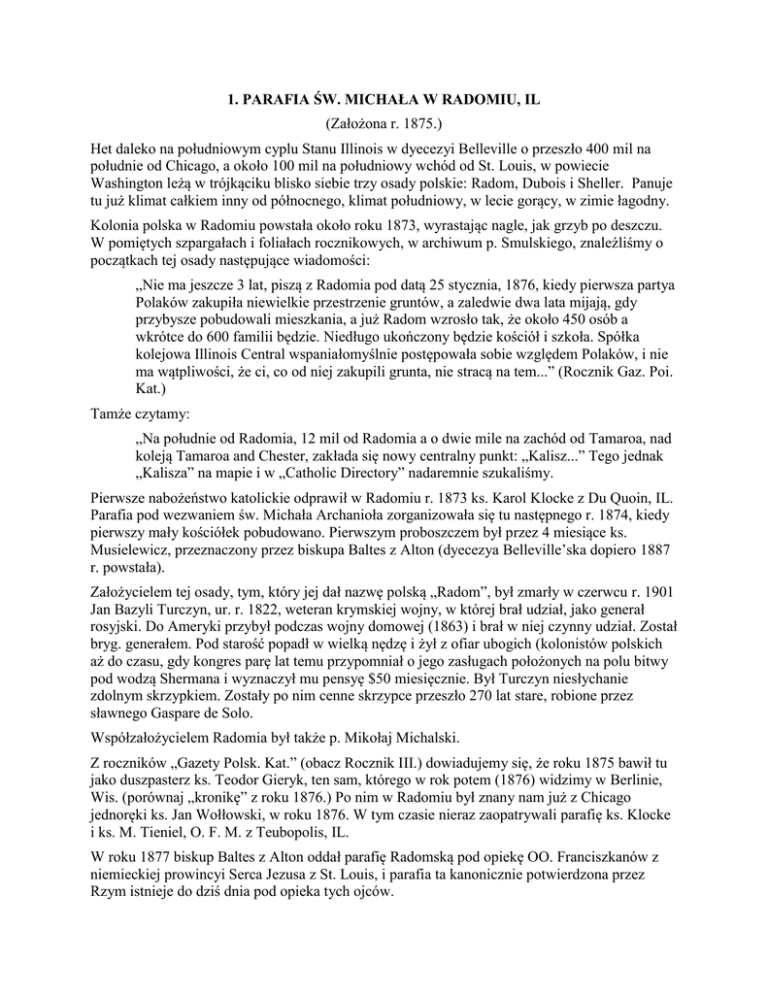 1. PARAFIA ŚW. MICHAŁA W RADOMIU, IL (Założona r. 1875.) Het daleko na południowym cyplu Stanu Illinois w dyecezyi Belleville o przeszło 400 mil na południe od Chicago, a około 100 mil na południowy wchód od St. Louis, w powiecie Washington leżą w trójkąciku blisko siebie trzy osady polskie: Radom, Dubois i Sheller. Panuje tu już klimat całkiem inny od północnego, klimat południowy, w lecie gorący, w zimie łagodny. Kolonia polska w Radomiu powstała około roku 1873, wyrastając nagle, jak grzyb po deszczu. W pomiętych szpargałach i foliałach rocznikowych, w archiwum p. Smulskiego, znaleźliśmy o początkach tej osady następujące wiadomości: „Nie ma jeszcze 3 lat, piszą z Radomia pod datą 25 stycznia, 1876, kiedy pierwsza partya Polaków zakupiła niewielkie przestrzenie gruntów, a zaledwie dwa lata mijają, gdy przybysze pobudowali mieszkania, a już Radom wzrosło tak, że około 450 osób a wkrótce do 600 familii będzie. Niedługo ukończony będzie kościół i szkoła. Spółka kolejowa Illinois Central wspaniałomyślnie postępowała sobie względem Polaków, i nie ma wątpliwości, że ci, co od niej zakupili grunta, nie stracą na tem...” (Rocznik Gaz. Poi. Kat.) Tamże czytamy: „Na południe od Radomia, 12 mil od Radomia a o dwie mile na zachód od Tamaroa, nad koleją Tamaroa and Chester, zakłada się nowy centralny punkt: „Kalisz...” Tego jednak „Kalisza” na mapie i w „Catholic Directory” nadaremnie szukaliśmy. Pierwsze nabożeństwo katolickie odprawił w Radomiu r. 1873 ks. Karol Klocke z Du Quoin, IL. Parafia pod wezwaniem św. Michała Archanioła zorganizowała się tu następnego r. 1874, kiedy pierwszy mały kościółek pobudowano. Pierwszym proboszczem był przez 4 miesiące ks. Musielewicz, przeznaczony przez biskupa Baltes z Alton (dyecezya Belleville’ska dopiero 1887 r. powstała). Założycielem tej osady, tym, który jej dał nazwę polską „Radom”, był zmarły w czerwcu r. 1901 Jan Bazyli Turczyn, ur. r. 1822, weteran krymskiej wojny, w której brał udział, jako generał rosyjski. Do Ameryki przybył podczas wojny domowej (1863) i brał w niej czynny udział. Został bryg. generałem. Pod starość popadł w wielką nędzę i żył z ofiar ubogich (kolonistów polskich aż do czasu, gdy kongres parę lat temu przypomniał o jego zasługach położonych na polu bitwy pod wodzą Shermana i wyznaczył mu pensyę $50 miesięcznie. Był Turczyn niesłychanie zdolnym skrzypkiem. Zostały po nim cenne skrzypce przeszło 270 lat stare, robione przez sławnego Gaspare de Solo. Współzałożycielem Radomia był także p. Mikołaj Michalski. Z roczników „Gazety Polsk. Kat.” (obacz Rocznik III.) dowiadujemy się, że roku 1875 bawił tu jako duszpasterz ks. Teodor Gieryk, ten sam, którego w rok potem (1876) widzimy w Berlinie, Wis. (porównaj „kronikę” z roku 1876.) Po nim w Radomiu był znany nam już z Chicago jednoręki ks. Jan Wołłowski, w roku 1876. W tym czasie nieraz zaopatrywali parafię ks. Klocke i ks. M. Tieniel, O. F. M. z Teubopolis, IL. W roku 1877 biskup Baltes z Alton oddał parafię Radomską pod opiekę OO. Franciszkanów z niemieckiej prowincyi Serca Jezusa z St. Louis, i parafia ta kanonicznie potwierdzona przez Rzym istnieje do dziś dnia pod opieka tych ojców. Klasztor franciszkański OO. Reformatów w Radomiu stanął w roku 1877. A oto przełożeni i proboszczowie, jacy rządzili kolejno i klasztorem i parafią: O. Dezydery Liss, OFM O. Marek Thienel, OFM O. Urban Stanowski, OFM O. Leon Brandys, OFM - O. Cebulla, OFM O. Łukasz Mieżowski, OFM - 1877—1881 1881—1882, umarł w Cleveland r. 1904 1882—1885, później proboszcz w St. Louis 1885—1887, bardzo lubiany przez wszystkich, umarł w Radomiu 7 maja 1887 1887—1894 1894 – Tym proboszczom pomagali następujący ojcowie: O. Szneider ThomaS, OFM O. Urban Stanowski, OFM O. Anastazy Czech, OFM - 1878—1881 1881-1882 1882 (tylko 3 miesiące; umarł w szpitalu w Omaha, Nebr., bardzo lubiany przez ludzi, był proboszczem w Duncan, Nebr. przez 14 lat i dziekanem dyecezyi Omahaskiej dekanatu Columbus O. Cyryl Augustyński, OFM 1882—1885 O. Damian Koziołek, OFM 1885—1887 bardzo popularny osobliwie na Bald Hill, IL, małej stacyjce, doglądanej przez niego z Radomia O. Łukasz Mieżowski, OFM 1887—1894 dojeżdżał do Du bois, gdzie wybudował dom dla sióstr, szkołę i kupił rolę na cmentarz O. Władysław Czech, OFM 1894—1895 pobudował w Dubois plebanię O. Teobald Kałamaja OFM 1895—1896 O. Rembert Stanowski, OFM 1896—1898 sprowadził piękne 2 wielkie dzwony O. Remigiusz Berendt, OFM Missyonarz Apostolski od r. 1898 aż do naszych czasów. W r. 1902 przybył tu także O. Menander Jaroszewicz, OFM, który po 5 miesięcznej pracy w Radomiu i Sheller został sparaliżowany. Radomska okolica i parafia jest jedną z najpiękniejszych na farmach. Parafia posiada piękny kościół, plebanię murowaną za $10,000, dom dla sióstr za $9,000, szkołę za $8,000, wielki dom dla dzieci, które się stołują, i wielką salę na przedstawienia. Najwięcej pobudowano za sprężystych rządów O. Łukasza Mieżowskiego. W Radomiu wszystko po polsku— młodzi i starzy mówią po polsku. Z Polaków adwokatem, sędzią i pisarkiem obwodowym (Township), oraz agentem kolei Illinois Central jest Michał Pawłowski; J. Klix konstablem a syn Teodor poczmistrzem; Jan Dawicki i Nikrant budowniczymi. W szkole uczy 5 Sióstr Notre Damek około 200 dzieci. Historya Polska w Ameryce, X. Wacław Kruszka, t. X, Milwaukee, Wis. 1907, s. 185-188