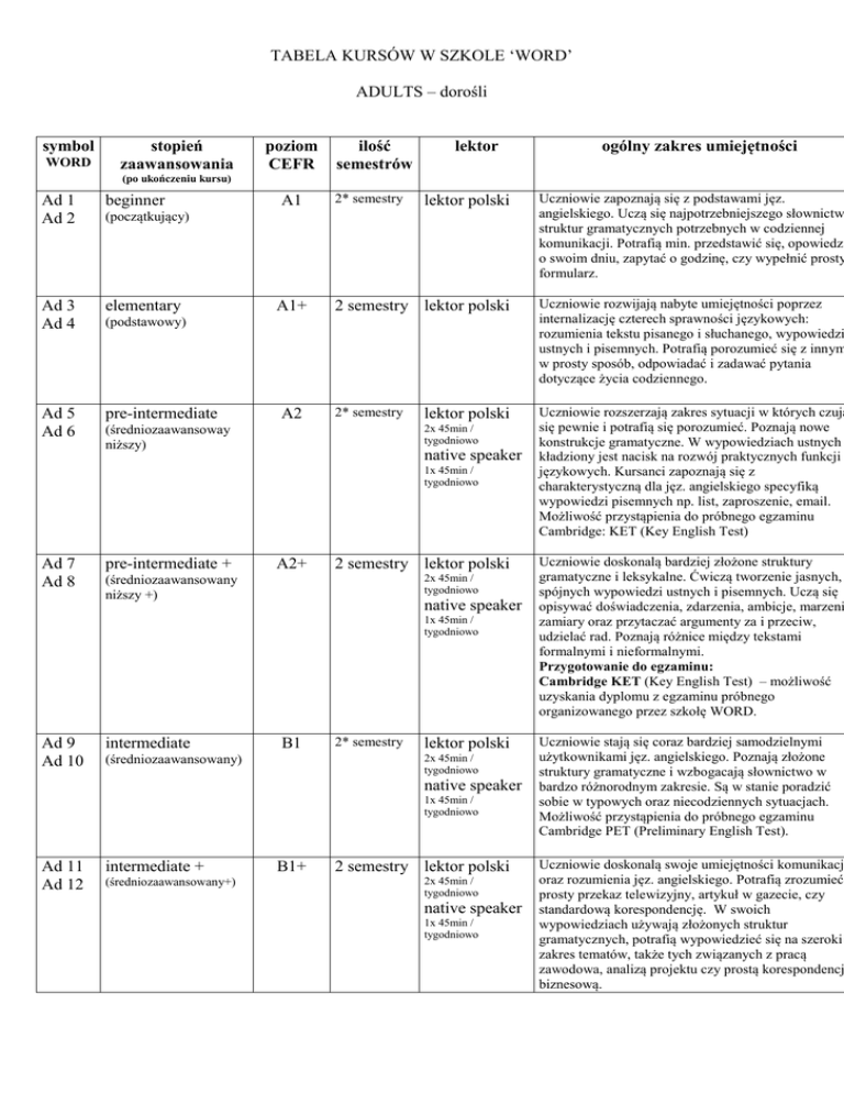 TABELA KURSÓW W SZKOLE ‘WORD’ ADULTS – dorośli symbol WORD stopień zaawansowania poziom CEFR ilość semestrów lektor ogólny zakres umiejętności (po ukończeniu kursu) Ad 1 Ad 2 beginner Ad 3 Ad 4 elementary Ad 5 Ad 6 pre-intermediate A1 lektor polski Uczniowie zapoznają się z podstawami jęz. angielskiego. Uczą się najpotrzebniejszego słownictw struktur gramatycznych potrzebnych w codziennej komunikacji. Potrafią min. przedstawić się, opowiedzi o swoim dniu, zapytać o godzinę, czy wypełnić prosty formularz. 2 semestry lektor polski Uczniowie rozwijają nabyte umiejętności poprzez internalizację czterech sprawności językowych: rozumienia tekstu pisanego i słuchanego, wypowiedzi ustnych i pisemnych. Potrafią porozumieć się z innym w prosty sposób, odpowiadać i zadawać pytania dotyczące życia codziennego. 2* semestry Uczniowie rozszerzają zakres sytuacji w których czują się pewnie i potrafią się porozumieć. Poznają nowe konstrukcje gramatyczne. W wypowiedziach ustnych kładziony jest nacisk na rozwój praktycznych funkcji językowych. Kursanci zapoznają się z charakterystyczną dla jęz. angielskiego specyfiką wypowiedzi pisemnych np. list, zaproszenie, email. Możliwość przystąpienia do próbnego egzaminu Cambridge: KET (Key English Test) 2* semestry (początkujący) A1+ (podstawowy) A2 (średniozaawansoway niższy) lektor polski 2x 45min / tygodniowo native speaker 1x 45min / tygodniowo Ad 7 Ad 8 pre-intermediate + A2+ 2 semestry lektor polski (średniozaawansowany niższy +) 2x 45min / tygodniowo native speaker 1x 45min / tygodniowo Ad 9 Ad 10 intermediate B1 (średniozaawansowany) 2* semestry lektor polski 2x 45min / tygodniowo native speaker 1x 45min / tygodniowo Ad 11 Ad 12 intermediate + (średniozaawansowany+) B1+ 2 semestry lektor polski 2x 45min / tygodniowo native speaker 1x 45min / tygodniowo Uczniowie doskonalą bardziej złożone struktury gramatyczne i leksykalne. Ćwiczą tworzenie jasnych, spójnych wypowiedzi ustnych i pisemnych. Uczą się opisywać doświadczenia, zdarzenia, ambicje, marzeni zamiary oraz przytaczać argumenty za i przeciw, udzielać rad. Poznają różnice między tekstami formalnymi i nieformalnymi. Przygotowanie do egzaminu: Cambridge KET (Key English Test) – możliwość uzyskania dyplomu z egzaminu próbnego organizowanego przez szkołę WORD. Uczniowie stają się coraz bardziej samodzielnymi użytkownikami jęz. angielskiego. Poznają złożone struktury gramatyczne i wzbogacają słownictwo w bardzo różnorodnym zakresie. Są w stanie poradzić sobie w typowych oraz niecodziennych sytuacjach. Możliwość przystąpienia do próbnego egzaminu Cambridge PET (Preliminary English Test). Uczniowie doskonalą swoje umiejętności komunikacj oraz rozumienia jęz. angielskiego. Potrafią zrozumieć prosty przekaz telewizyjny, artykuł w gazecie, czy standardową korespondencję. W swoich wypowiedziach używają złożonych struktur gramatycznych, potrafią wypowiedzieć się na szeroki zakres tematów, także tych związanych z pracą zawodowa, analizą projektu czy prostą korespondencj biznesową. Przygotowanie do egzaminu: Cambridge PET (Preliminary English Test) – możliwość uzyskania dyplomu z egzaminu próbnego organizowanego przez szkołę WORD. Ad 13 Ad 14 upper-intermediate, pre-FCE B2 2* semestry 2x 45min / tygodniowo (średniozaawansowany wyższy, wstęp do FCE) Ad 15 Ad 16 FCE lektor polski native speaker 1x 45min / tygodniowo B2+ 2 semestry lektor polski 2x 45min / tygodniowo native speaker 1x 45min / tygodniowo Ad 17 Ad 18 advanced, pre-CAE C1 2* semestry lektor polski 2x 45min / tygodniowo (zaawansowany) native speaker 1x 45min / tygodniowo Ad 19 Ad 20 advanced (CAE) (zaawansowany) C1 2 semestry Uczniowie znają już większość zagadnień gramatycznych, skupiają się na analizie niuansów językowych. Swobodnie porozumiewają się na każdy temat, potrafią formułować przejrzyste wypowiedzi ustne i pisemne w szerokim zakresie tematów, a także wyjaśniać swoje stanowisko w sprawach będących przedmiotem dyskusji. Zapoznają się z ze strukturą egzaminu FCE oraz z technikami jego zdawania. Możliwość przystąpienia do próbnego egzaminu Cambridge FCE (First Certificate in English). Uczniowie doskonalą technikę zdawania egzaminu FCE, przy czym w dalszym ciągu ćwiczą swobodne porozumiewanie się w jęz. angielskim (ważne dla tych którzy nie planują zdawania egzaminu). Rozumieją znaczenie głównych wątków przekazu zawartego w złożonych tekstach na tematy konkretne i abstrakcyjne w tym dyskusję specjalistyczną dotyczącą własnej tematyki zawodowej. Potrafią porozumiewać się na ty płynnie i spontanicznie, by prowadzić normalną rozmowę z rodzimym użytkownikiem danego języka, nie powodując przy tym napięcia u którejkolwiek ze stron. Przygotowanie do egzaminu: Cambridge FCE (First Certificate in English) – możliwość uzyskania dyplomu z egzaminu próbnego organizowanego przez szkołę WORD. Uczniowie stają się zaawansowanymi użytkownikami jęz. angielskiego. Rozumieją szeroki zakres trudnych, dłuższych tekstów, dostrzegając także znaczenia ukryt wyrażone pośrednio. Potrafią wypowiadać się płynnie spontanicznie, bez większego trudu odnajdując właściwe sformułowania. Skutecznie i swobodnie posługują się językiem w kontaktach towarzyskich i społecznych, edukacyjnych bądź zawodowych. Formułują jasne, dobrze zbudowane, szczegółowe wypowiedzi dotyczące złożonych problemów, sprawn i właściwie posługując się regułami organizacji wypowiedzi, łącznikami i wskaźnikami zespolenia tekstu. Możliwość przystąpienia do próbnego egzaminu Cambridge CAE (Cambridge Advanced English). W zależności od preferencji grupy kurs prowadzony je pod kątem przystąpienia do egzaminu CAE, lub w cel dalszego doskonalenia biegłości w posługiwaniu się językiem angielskim. Przygotowanie do egzaminu: Cambridge CAE (Cambridge A