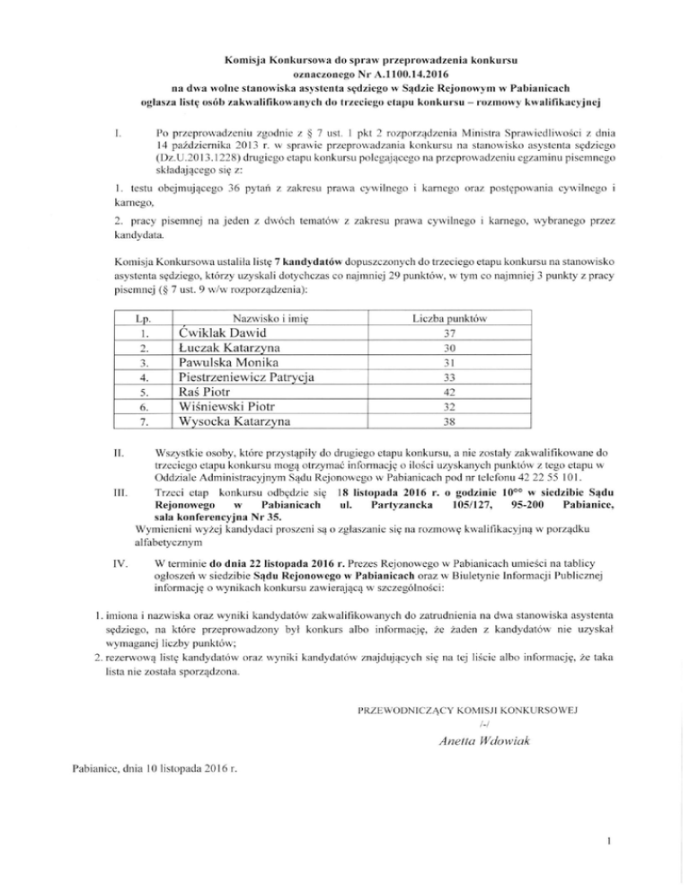 Komisja Konkursowa do spraw przeprowadzenia konkursu oznaczonego Nr A.1100.14.2016 na dwa wolne stanowiska asystenta sędziego w Sądzie Rejonowym w Pabianicach ogłasza listę osób zakwalifikowanych do trzeciego etapu konkursu - rozmowy kwalifikacyjnej I. Po przeprowadzeniu zgodnie z § 7 ust. 1 pkt 2 rozporządzenia Ministra Sprawiedliwości z dnia 14 października 2013 r. w sprawie przeprowadzania konkursu na stanowisko asystenta sędziego (Dz.U.2013.1228) drugiego etapu konkursu polegającego na przeprowadzeniu egzaminu pisemnego składającego się z: 1. testu obejmującego 36 pytań z zakresu prawa cywilnego i karnego oraz postępowania cywilnego i karnego, 2. pracy pisemnej na jeden z dwóch tematów z zakresu prawa cywilnego i karnego, wybranego przez kandydata. Komisja Konkursowa ustaliła listę 7 kandydatów dopuszczonych do trzeciego etapu konkursu na stanowisko asystenta sędziego, którzy uzyskali dotychczas co najmniej 29 punktów, w tym co najmniej 3 punkty z pracy pisemnej (§ 7 ust. 9 w/w rozporządzenia): Lp. 1. 2. 3. 4. 5. 6. 7. Nazwisko i imię Cwiklak Dawid Łuczak Katarzyna Pawulska Monika Piestrzeniewicz Patrycja Ras Piotr Wiśniewski Piotr Wysocka Katarzyna Liczba punktów 37 30 31 33 42 32 38 II. Wszystkie osoby, które przystąpiły do drugiego etapu konkursu, a nie zostały zakwałifikowane do trzeciego etapu konkursu mogą otrzymać informację o ilości uzyskanych punktów z tego etapu w Oddziale Administracyjnym Sądu Rejonowego w Pabianicach pod nr telefonu 42 22 55 101. III. Trzeci etap konkursu odbędzie się 18 listopada 2016 r. o godzinie 10°° w siedzibie Sądu Rejonowego w Pabianicach ul. Partyzancka 105/127, 95-200 Pabianice, sala konferencyjna Nr 35. Wymienieni wyżej kandydaci proszeni są o zgłaszanie się na rozmowę kwalifikacyjną w porządku alfabetycznym IV. W terminie do dnia 22 listopada 2016 r. Prezes Rejonowego w Pabianicach umieści na tablicy ogłoszeń w siedzibie Sądu Rejonowego w Pabianicach oraz w Biuletynie Informacji Publicznej informację o wynikach konkursu zawierającą w szczególności: 1. imiona i nazwiska oraz wyniki kandydatów zakwalifikowanych do zatrudnienia na dwa stanowiska asystenta sędziego, na które przeprowadzony był konkurs ałbo informację, że żaden z kandydatów nie uzyskał wymaganej liczby punktów; 2. rezerwową listę kandydatów oraz wyniki kandydatów znajdujących się na tej liście albo informację, że taka lista nie została sporządzona. PRZEWODNICZĄCY K O M I S J I K O N K U R S O W E J /-/ Anetta Wdowiak Pabianice, dnia 10 listopada 2016 r. 1