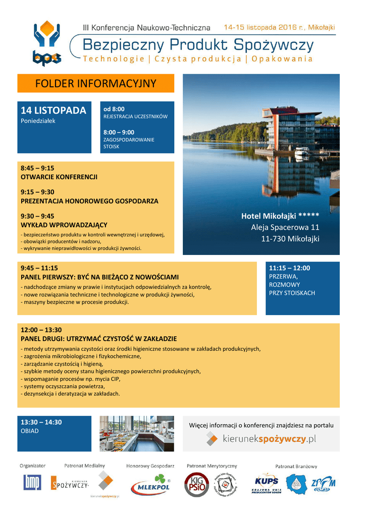 FOLDER INFORMACYJNY 14 LISTOPADA Poniedziałek od 8:00 REJESTRACJA UCZESTNIKÓW 8:00 – 9:00 ZAGOSPODAROWANIE STOISK 8:45 – 9:15 OTWARCIE KONFERENCJI 9:15 – 9:30 PREZENTACJA HONOROWEGO GOSPODARZA Hotel Mikołajki ***** Aleja Spacerowa 11 11-730 Mikołajki 9:30 – 9:45 WYKŁAD WPROWADZAJĄCY - bezpieczeństwo produktu w kontroli wewnętrznej i urzędowej, - obowiązki producentów i nadzoru, - wykrywanie nieprawidłowości w produkcji żywności. 9:45 – 11:15 PANEL PIERWSZY: BYĆ NA BIEŻĄCO Z NOWOŚCIAMI 11:15 – 12:00 - nadchodzące zmiany w prawie i instytucjach odpowiedzialnych za kontrolę, - nowe rozwiązania techniczne i technologiczne w produkcji żywności, - maszyny bezpieczne w procesie produkcji. PRZERWA, ROZMOWY PRZY STOISKACH 12:00 – 13:30 PANEL DRUGI: UTRZYMAĆ CZYSTOŚĆ W ZAKŁADZIE - metody utrzymywania czystości oraz środki higieniczne stosowane w zakładach produkcyjnych, - zagrożenia mikrobiologiczne i fizykochemiczne, - zarządzanie czystością i higieną, - szybkie metody oceny stanu higienicznego powierzchni produkcyjnych, - wspomaganie procesów np. mycia CIP, - systemy oczyszczania powietrza, - dezynsekcja i deratyzacja w zakładach. 13:30 – 14:30 OBIAD Więcej informacji o konferencji znajdziesz na portalu 14:30 – 15:30 PANEL TRZECI: DOBRZE SKONTROLOWAĆ I ZACHOWAĆ JAKOŚĆ - wymagania stawiane przez systemy zapewnienia jakości tj. BRC, IFS, FSSC 22000 - kontrola jakości produktu, - doświadczenia z wdrażania systemów jakości, - systemy i narzędzia informatyczne wspierające monitoring i kontrolę, - audyty systemów jakości w zakładzie, - praktyczne przełożenie wymagań norm na pracę w zakładzie. 15:30 – 16:15 PRZERWA, ROZMOWY PRZY STOISKACH Zaloguj się do PLATFORMY B2B 16:15 – 17:15 PANEL CZWARTY: BEZPIECZNIE ZAPAKOWAĆ I PRAWIDŁOWO OZNAKOWAĆ Po zgłoszeniu na konferencję otrzymasz dostęp do platformy B2B umożliwiającej kontakt z innymi uczestnikami konferencji. Dzięki niej można umówić się z nimi na spotkanie w tzw. strefie B2B. - znakowanie żywności, - informacje zawarte na etykiecie – co trzeba, a czego nie można umieszczać?, - wymagana dokumentacja dotycząca opakowań żywości, - zezwolenia, certyfikaty, deklaracja zgodności, - linie pakujące i maszyny etykietujące, - wizyjna kontrola jakości opakowań. 17:15 – 17:30 PRZERWA, ROZMOWY PRZY STOISKACH 17:30 – 18:00 WYKŁAD ZAMYKAJĄCY - jak to robią inni, czyli inspiracje z innych branż, np. farmaceutycznej. 18:00 – 20:00 CZAS NA RELAKS, DEMONTAŻ STOISK 20:00 KOLACJA, SPOTKANIE INTEGRACYJNE 15 LISTOPADA Wtorek 8:00 – 9:00 ŚNIADANIE W MIEJSCU ZAKWATEROWANIA, WYKWATEROWANIE 9:00 – 10:00 PRZEJAZD DO ZAKŁADU SM MLEKPOL WE WŁASNYM ZAKRESIE 10:00 – 12:00 WYCIECZKA TECHNICZNA 12:00 – 13:15 do Zakładu Produkcyjnego SM Mlekpol w Mrągowie ul. Kormoranów 1 11-700 Mrągowo OBIAD W OKOLICY ZAKŁADU ZGŁOŚ SWÓJ UDZIAŁ JUŻ DZIŚ – LICZBA MIEJSC OGRANICZONA Masz pytanie? Chcesz się zgłosić? Zadzwoń lub napisz WYSOKI KOMFORT POBYTU ATRAKCYJNE KOSZTY UCZESTNICTWA UCZESTNICTWO pierwsza osoba – 320 zł każda kolejna – 50% RABATU NOCLEG pokój 1-os. – 200 zł pokój 2-os. – 300 zł Organizatorem konferencji jest firma BMP – wydawca kwartalnika „Kierunek Spożywczy” i administrator portalu www.kierunekspożywczy.pl Bożena Pietrzak-Tychy Kierownik działu realizacji projektów/koordynator [email protected] kom. 600 326 187 tel. 32 415 97 74 wew. 27