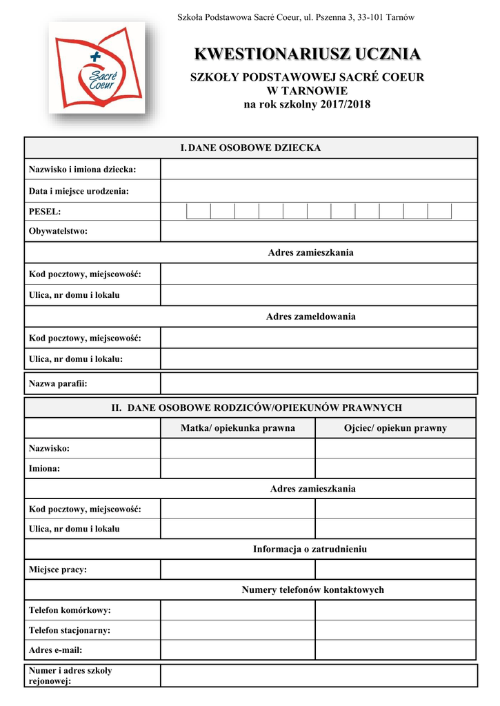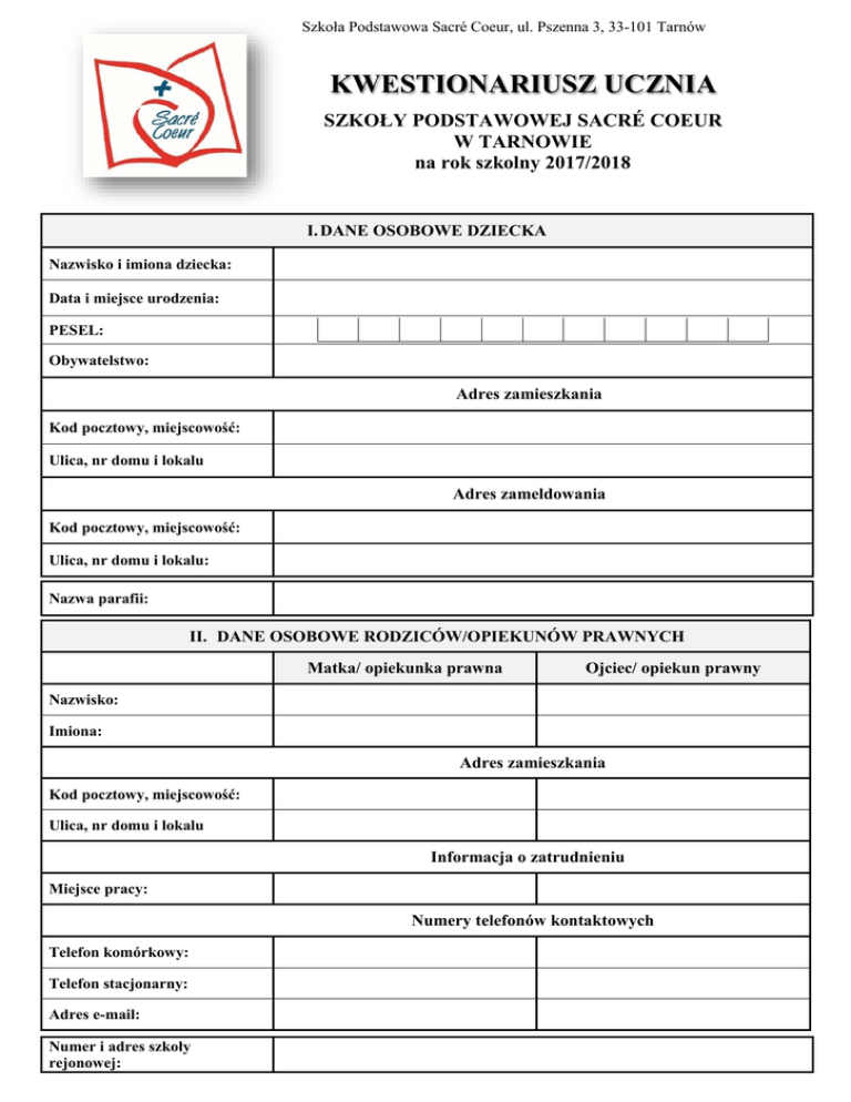 Szkoła Podstawowa Sacré Coeur, ul. Pszenna 3, 33-101 Tarnów KWESTIONARIUSZ UCZNIA SZKOŁY PODSTAWOWEJ SACRÉ COEUR W TARNOWIE na rok szkolny 2017/2018 I. DANE OSOBOWE DZIECKA Nazwisko i imiona dziecka: Data i miejsce urodzenia: PESEL: Obywatelstwo: Adres zamieszkania Kod pocztowy, miejscowość: Ulica, nr domu i lokalu Adres zameldowania Kod pocztowy, miejscowość: Ulica, nr domu i lokalu: Nazwa parafii: II. DANE OSOBOWE RODZICÓW/OPIEKUNÓW PRAWNYCH Matka/ opiekunka prawna Ojciec/ opiekun prawny Nazwisko: Imiona: Adres zamieszkania Kod pocztowy, miejscowość: Ulica, nr domu i lokalu Informacja o zatrudnieniu Miejsce pracy: Numery telefonów kontaktowych Telefon komórkowy: Telefon stacjonarny: Adres e-mail: Numer i adres szkoły rejonowej: III. OŚWIADCZENIA DOTYCZĄCE TREŚCI ZGŁOSZENIA I OCHRONY DANYCH OSOBOWYCH ZOBOWIĄZUJEMY SIĘ DO: przestrzegania postanowień statutu szkoły; podawania do wiadomości szkoły jakichkolwiek zmian w podanych wyżej informacjach; regularnego i terminowego wpłacania czesnego. Opłata ta jest rozłożona na 10 miesięcy w roku. Za dzień zapłaty uznaje się dzień uznania rachunku bankowego szkoły lub wpływ gotówki do rąk uprawnionej osoby. W przypadku opóźnienia w zapłacie przysługują odsetki ustawowe. Zapłata będzie regulowana od miesiąca września, płatna do 10 dnia miesiąca. punktualnego przyprowadzania i odbierania dziecka ze szkoły osobiście lub przez osobę dorosłą, zgłoszoną w upoważnieniu; przyprowadzania do szkoły tylko zdrowego dziecka; uczestniczenia w spotkaniach informacyjnych, formacyjnych i szkoleniowych dla rodziców. INFORMACJE DOTYCZĄCE DANYCH OSOBOWYCH DZIECKA I JEGO RODZINY: Uprzedzeni o odpowiedzialności karnej z art. 233 k.k. oświadczamy, że podane powyżej dane są zgodne ze stanem faktycznym (za podanie nieprawdziwych danych mogą być wyciągnięte odpowiednie konsekwencje włącznie ze skreśleniem dziecka z listy uczniów); Zgodnie z art. 23 Ustawy z dnia 29 sierpnia 1997 r. o ochronie danych osobowych (Dz. U. z 2002 r. Nr 101, poz. 926 ze zm.) wyrażamy zgodę na zbieranie, przetwarzanie i wykorzystywanie ww. danych osobowych przez Szkołę Podstawową Sacré Coeur w Tarnowie dla potrzeb działalności oświatowo – wychowawczej; Wyrażamy zgodę na publikacje wizerunku naszej rodziny z imprez i uroczystości szkolnych na stronie internetowej oraz portalu społecznościowym dokumentujących działalność naszej Szkoły. Data i podpis maki/ opiekunki prawnej: Data i podpis ojca/ opiekuna prawnego: PRZYJĘCIE KARTY ZGŁOSZENIA DZIECKA data wpływu podpis przyjmującego