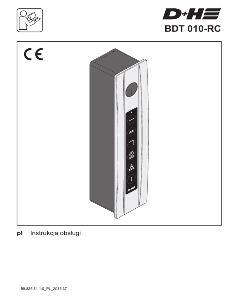BDT 010-RC pl Instrukcja obs³ugi 99.825.31 1.0_PL_2015.37 Spis treœci Zastosowanie Zastosowanie .........................................................2 Wskazówki bezpieczeñstwa ..................................2 Gwarancje ..............................................................2 Oœwiadczenie o zgodnoœci CE ..............................2 Naturalna wentylacja z BDT 010-RC ....................3 Zakres dostawy BDT .............................................4 Przegl¹d ................................................................5 Monta¿ ...............................................................6-7 Pod³¹czenie .......................................................8-9 Obs³uga ...............................................................10 WskaŸnik po³o¿enia ............................................11 Ustawienia podstawowe ......................................11 Pilot radiowy RCR11-2 /RCR11-4 ........................12 Zasilacz SNT1-U.................................................12 Monta¿ uchwytu WU-RC .....................................13 Wymiana baterii..................................................13 Programowanie pilota .........................................14 Obs³uga BDT przy u¿yciu pilota radiowego .......15 Otwarcie awaryjne ..............................................16 Dane techniczne .................................................17 Konserwacja i czyszczenie .................................17 Utylizacja.............................................................17 Wymiary ...............................................................17 - Napêd elektryczny BDT 010-RC przeznaczony jest do naturalnej wentylacji okien wyposa¿onych w okucie activPilot Comfort PAMD produkcji firmy Winkhaus - Monta¿ w miejscu klamki okiennej - Regulowany kierunek pracy - Napiêcie zasilania 24 VDC - Monta¿ wewnêtrzny Wskazówki bezpieczeñstwa Napiêcie pracy 24 VDC! Nie pod³¹czaæ bezpoœrednio do zasilania 230 V ! - Pod³¹czenie musi byæ wykonane przez autoryzowanego specjalistê-elektryka - Zagro¿enie przytrzaœniêciem podczas dzia³ania napêdu - Ograniczyæ dostêp w obszar pracy napêdu - Ograniczyæ dostêp dzieci do przycisków uruchamiaj¹cych napêd - Stosowaæ tylko w suchych pomieszczeniach - Monta¿ tylko wewn¹trz budynków. - Stosowaæ tylko niezmodyfikowane, oryginalne czêœci D+H Gwarancja Oœwiadczenie o zgodnoœci Na produkty D+H udzielamy 2 letniej gwarancji od data sprzeda¿y. Gwarancja mo¿e byæ rozszerzona do 3 lat jeœli monta¿ i uruchomienie zosta³o wykonane przez D+H lub autoryzowanego partnera D+H, a system jest serwisowany przez producenta. Pod³¹czania urz¹dzeñ innych producentów do produktów D+H bez naszej zgody mo¿e spowodowaæ utratê gwarancji. 2/18 BDT 010-RC Œwiadomi swojej odpowiedzialnoœci oœwiadczamy, ¿e produkt opisany w punkcie "Dane techniczne" jest zgodny z nastêpuj¹cymi dyrektywami 2004/108/EG, 2006/95/EG Dokumentacja techniczna do uzyskania w firmie: D+H Mechatronic AG, D-22949 Ammersbek Thomas Kern Maik Schmees Zarz¹d 15.06.2012 Prokurent, Dyrektor Techniczny Polski 99.825.31 1.0_PL_2015.37 Naturalna wentylacja z BDT 010-RC Naturalna wentylacja z wykorzystaniem napêdu BDT 010-RC produkcji D+H Mechatronic i okucia okiennego activPilot Comfort PADM produkcji firmy Winkhaus Potrzeba œwie¿ego i dobrej jakoœci powietrza, a tak¿e komfortowej temperatury w pomieszczeniu jest kluczowym czynnikiem wp³ywaj¹cym na poprawê samopoczucia w pracy i w domu. - automatyczna i energooszczêdna wentylacja zgodnie z DIN 1946-6 - ograniczenie strat ciep³a podczas wentylacji - oszczêdnoœæ przez zmniejszenie kosztów ogrzewania - alternatywa dla mechanicznych systemów wentylacji W jaki sposób poprawnie wentylowaæ ? D³ugotrwa³e przewietrzanie powoduje du¿e straty energii cieplnej w pomieszczeniu, zbyt krótkie wp³ywa niekorzystnie na samopoczucie osób w nim przebywaj¹cych powoduj¹c znu¿enie i zmêczenie. Poprzez zautomatyzowan¹ kontrolê wentylacji przy pomocy BDT po³¹czonego z okuciem activPilot Comfort PADM mo¿emy zapewniæ w pomieszczeniach odpowiedni¹ wentylacjê przy jednoczesnym ograniczeniu kosztów ogrzewania. Zu¿yte powietrze w ³azience, kuchni czy sypialni poddawane jest sta³ej cyrkulacji co sprzyja utrzymaniu w³aœciwej higieny i dobrej jakoœci atmosfery. Okno zamkniête i zablokowane 6 mm Okno rozszczelnione (szczelina 6 mm) ca. 6 mm Okno odblokowane mo¿liwoœæ rêcznego otwarcia Rozszczelnienie o 6 mm jest wystarczaj¹ce do wymiany powietrza i poprawy jakoœci powietrza w pomieszczeniu. 99.825.31 1.0_PL_2015.37 Polski BDT 010-RC 3/18 Zakres dostawy BDT010-RC a - 1x napêd okuciowy b - 1x p³ytka monta¿owa c - 1x z³¹cze wtykowe d - 1x zatrzask mocuj¹cy e - 1x trzpieñ (7 mm x 7 mm) l=55mm * f - 1x podk³adka g - 2x œruba M5 x 45 mm h - 1x œruba 4,1 x 19 mm g e a f b d c h * UWAGA: D³ugoœæ trzpienia dopasowaæ indywidualnie do okna Napêd okuciowy BDT 010-RC wraz z akcesoriami dostêpne s¹ u partnerów handlowych i w regionalnych biurach D+H. Okucie activPilot Comfort PADM nale¿y zamawiaæ w firmie Winkhaus. 4/18 BDT 010-RC Polski 99.825.31 1.0_PL_2015.37 Przegl¹d okucie activPilot Comfort PADM napêd okuciowy BDT 010-RC zasilacz SNT 1-U max. 4 m SNT 1-U 24 VDC 230 VAC 130 mm ca. 10 cm Przepust kablowy KUE-T1 Ø 12 mm Ø 8 mm Ø 12 mm m 0m Ø 12 mm Ø1 99.825.31 1.0_PL_2015.37 Polski BDT 010-RC 5/18 Monta¿ 8-9 50 6/18 BDT 010-RC mm Polski 99.825.31 1.0_PL_2015.37 Monta¿ K KLIC 99.825.31 1.0_PL_2015.37 Polski BDT 010-RC 7/18 Pod³¹czenie BDT 010-RC do SNT 1-U Napiêcie zasilania 230 VAC! Niebezpieczeñstwo pora¿enia pr¹dem ! Pod³¹czanie tylko przez uprawnionych specjalistów elektryków! X2 24 VDC BDT 010-RC 1 2 3 4 5 6 X1 L N 230 VAC KUE-T1 Otwarcie Zamkniêcie Sygna³ otwarcia SNT 1-U bia³y br¹zowy zielony ¿ó³ty szary ró¿owy L N 230 V, 50 Hz Pod³¹czenie BDT 010-RC do SNT 1-U i przycisku LT43 Napiêcie zasilania 230 VAC! Niebez