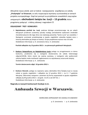 Aktualnie nasza szkoła jest w trakcie nawiązywania współpracy ze szkołą „Prolympia” w Virserum, w celu rozpoczęcia wymiany uczniowskiej w ramach projektu europejskiego. Stąd też pomysł na przybliżenie szwedzkich zwyczajów związanych z obchodami święta św. Łucji – 13 grudnia, które pragniemy połączyć z dobrą zabawą i nagrodami OGŁASZAMY TRZY KONKURSY: Najciekawszy pochód św. Łucji, podczas którego przemieszczając się po salach lekcyjnych przebrani uczestnicy parady rozdają samodzielnie wykonane smakołyki charakterystyczne dla tego dnia oraz śpiewają piosenkę "Santa Lucia" po szwedzku ! Następnie uczniowie przedstawiają w języku angielskim sylwetkę świętej wraz z historią obchodów jej święta w Szwecji. Grupa projektowa wynosi max 10 osób. Dodatkowe informacje: p. D. Jarosiewicz lub p. A. Jankowska Pochód odbędzie się 13 grudnia 2012 r. na pierwszych godzinach lekcyjnych. Konkurs fotograficzny na Najpiękniejszą Łucję polega na przygotowaniu w domu kostiumu, przebraniu się a następnie dostarczeniu do szkoły kolorowego zdjęcia(13X18), które stanie się częścią wystawy, a następnie cała społeczność szkolna będzie miała możliwość zagłosowania na najciekawszy wizerunek świętej. Dodatkowe informacje: p. A . Jankowska Termin dostarczenia zdjęć: 10 grudnia 2012 r. Konkurs literacki, polega na napisaniu opisu obchodów Dnia Świętej Łucji w naszej szkole w języku angielskim i odbędzie się 13 grudnia 2013 r. na 6 i 7 godzinie lekcyjnej. (Warsztaty związane z pisaniem tej formy wypowiedzi w języku angielskim odbędą się 04 grudnia 2012 r. od godz. 15.25 w sali 207 SG. ) Dodatkowe informacje: p. A. Jankowska Nagrody w naszych konkursach funduje m.in. Ambasada Szwecji w Warszawie. SEDRECZNIE ZAPRASZAMY DO UDZIAŁU W ZABAWIE! p. D. Jarosiewicz i p. A. Jankowska