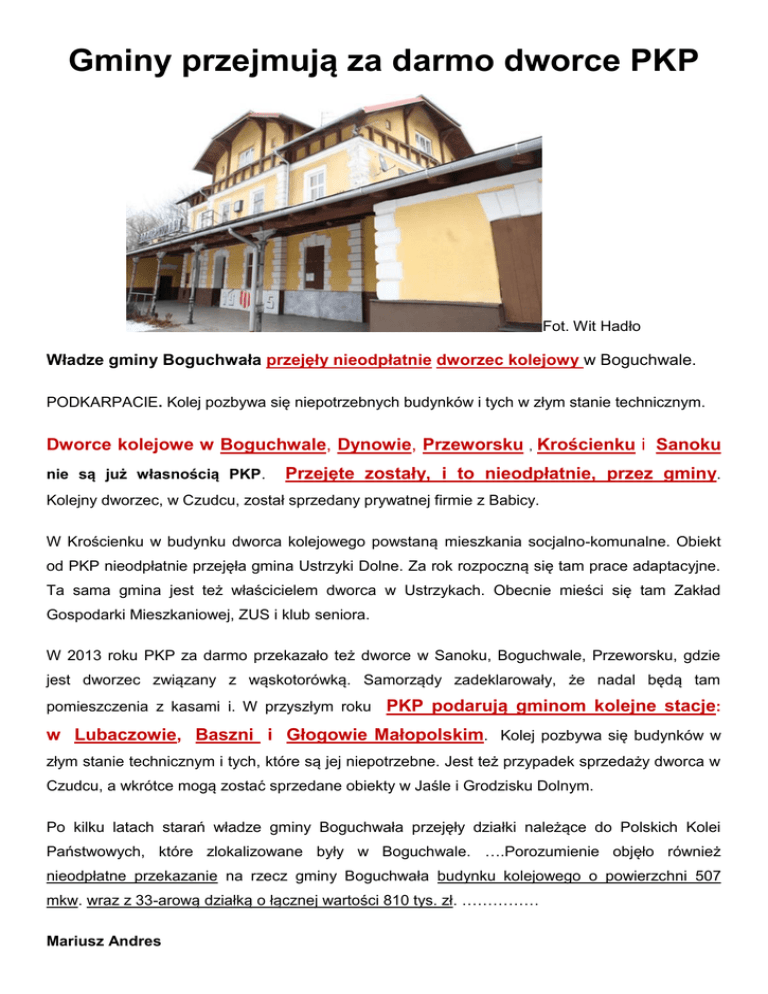 Gminy przejmują za darmo dworce PKP Fot. Wit Hadło Władze gminy Boguchwała przejęły nieodpłatnie dworzec kolejowy w Boguchwale. PODKARPACIE. Kolej pozbywa się niepotrzebnych budynków i tych w złym stanie technicznym. Dworce kolejowe w Boguchwale, Dynowie, Przeworsku , Krościenku i Sanoku nie są już własnością PKP. Przejęte zostały, i to nieodpłatnie, przez gminy. Kolejny dworzec, w Czudcu, został sprzedany prywatnej firmie z Babicy. W Krościenku w budynku dworca kolejowego powstaną mieszkania socjalno-komunalne. Obiekt od PKP nieodpłatnie przejęła gmina Ustrzyki Dolne. Za rok rozpoczną się tam prace adaptacyjne. Ta sama gmina jest też właścicielem dworca w Ustrzykach. Obecnie mieści się tam Zakład Gospodarki Mieszkaniowej, ZUS i klub seniora. W 2013 roku PKP za darmo przekazało też dworce w Sanoku, Boguchwale, Przeworsku, gdzie jest dworzec związany z wąskotorówką. Samorządy zadeklarowały, że nadal będą tam pomieszczenia z kasami i. W przyszłym roku PKP podarują gminom kolejne stacje: w Lubaczowie, Baszni i Głogowie Małopolskim. Kolej pozbywa się budynków w złym stanie technicznym i tych, które są jej niepotrzebne. Jest też przypadek sprzedaży dworca w Czudcu, a wkrótce mogą zostać sprzedane obiekty w Jaśle i Grodzisku Dolnym. Po kilku latach starań władze gminy Boguchwała przejęły działki należące do Polskich Kolei Państwowych, które zlokalizowane były w Boguchwale. ….Porozumienie objęło również nieodpłatne przekazanie na rzecz gminy Boguchwała budynku kolejowego o powierzchni 507 mkw. wraz z 33-arową działką o łącznej wartości 810 tys. zł. …………… Mariusz Andres PKP przekazuje dworce samorządom autor: Marcin Walków ; źródło: Naszemiasto.pl Na dworzec w Jelczu-Miłoszycach na razie nie ma jeszcze pomysłu (© Marcin Walków) W powiatach graniczących z Wrocławiem przy czynnych liniach kolejowych znajdują się 34 dworce kolejowe. Tylko połowa z nich jest otwarta. - Zmienił się sposób podróżowania koleją. W mniejszych miejscowościach dziś już nie czeka się na pociąg, ale przychodzi kilka minut przed odjazdem - tłumaczy Bartłomiej Sarna, rzecznik PKP S.A. we Wrocławiu. Nawet bilet można kupić w automacie lub przez internet. Trzeba więc wymyślić coś dodatkowego (sklep, lokal gastronomiczny), co przyciągnie podróżnych na dłuższą chwilę przed odjazdem pociągu. Ale nie wszystkie budynki dworców stoją puste i marnieją. - W ostatnich latach staramy się przekazywać część dworców na rzecz samorządów lokalnych, tak by mogły one dalej służyć obsłudze podróżnych albo innym potrzebom lokalnych społeczności - dodaje Sarna. Tak stało się już z dworcami w Wołowie, Twardogórze, Pasikurowicach, Siedlcu Trzebnickim, Brochocinie Trzebnickim i Trzebnicy. Budynek dworca kolejowego w Trzebnicy pochodzi z 1886 roku. Do 1954 mieściła się w nim restauracja, kasy i biura. Ale gdy w 1990 roku zamknięto linię kolejową do Wrocławia, dworzec podupadł. 20 lat później, gdy na tory wjechały szynobusy, gmina Trzebnica wyremontowała budynek dworca i przywróciła częściowo jego pierwotną funkcję. Na tym nie koniec. Koleje planują przekazać samorządom kolejne dworce. Dobiegają końca ustalenia w Międzyborzu. Trwają też rozmowy odnośnie dworców w Jelczu- Laskowicach, Siechnicach, Świętej Katarzynie, Żórawinie i Węgrach. Wadowice chcą przejąć dworzec od PKP za darmo Dworzec PKP w Wadowicach Fot. Marcin Płaszczyca Gmina Wadowice przystąpi do negocjacji z zarządem PKP S.A. w sprawie nieodpłatnego przejęcia dworca kolejowego. Jest na to wstępna zgoda Ministerstwa Infrastruktury i Rozwoju. W 2006 roku zainwestowano w modernizację linii kolejowej, jak i w sam dworzec 30 mln zł. Spółki PKP wydały pieniądze na uruchomienie tzw. Szlaku Papieskiego, który po kilku latach okazał się dużym niewypałem, ale dzięki temu mamy w Wadowicach odnowiony dworzec. Przejmowanie budynków PKP przez samorządy to nie nowy pomysł. Pierwszym samorządem w Polsce, który odkupił od PKP dworzec był Kwidzyń. Po wielu negocjacjach Kwidzyn zapłacił w 2012 r. za budynek 207 tys. zł, czyli zaledwie 10 % jego wartości. W zeszłym roku Kwidzyń ruszył z inwestycją kompleksowej przebu-dowy budynku po dawnym dworcu kolejowym i jego adaptacji na potrzeby Biblioteki Miejsko-Powiatowej oraz jej filii. Brzeźnica: Zabytkowy dworzec PKP będzie uratowany przed zniszczeniem autor: Robert Szkutnik (© fot. R.Szkutnik) Samorząd przejął od kolei zrujnowany dworzec PKP 07.05.2015 Kurier Kolejowy, Kościerski.info Kościerzyna przejęła za darmo dworzec PKP Fot. Tomasz Przechlewski, Wikimedia Miasto zabiegało o to już od kilku lat. Teraz PKP S.A. przekazały budynek bezpłatnie na rzecz miasta, a jego władze chcą wspólnie z mieszkańcami stworzyć projekt zagospodarowania obiektu – informuje portal kościerski.info. Dworzec ma być elementem węzła integracyjnego Pomorskiej Kolei Metropolitalnej, który powinien tu w przyszłości powstać. Poprzednie władze miasta zamierzały przeprowadzić remont obiektu, ułatwiając przy tej okazji dostęp do Muzeum Kolejnictwa w Kościerzynie (dawny Skansen Parowozownia Kościerzyna). W budynku miały powstać sklepiki i część gastronomiczna a pozostały obszar planowano wykorzystać w celach muzealnych. Koszt projektu - szacowany na 10 mln zł - okazał się jednak zbyt wysoki. Obecny burmistrz miasta chce zadecydować o przyszłości dworca wraz z mieszkańcami. Swoje pomysły na rewitalizację można kierować mailowo do Urzędu Miejskiego w Kościerzynie.