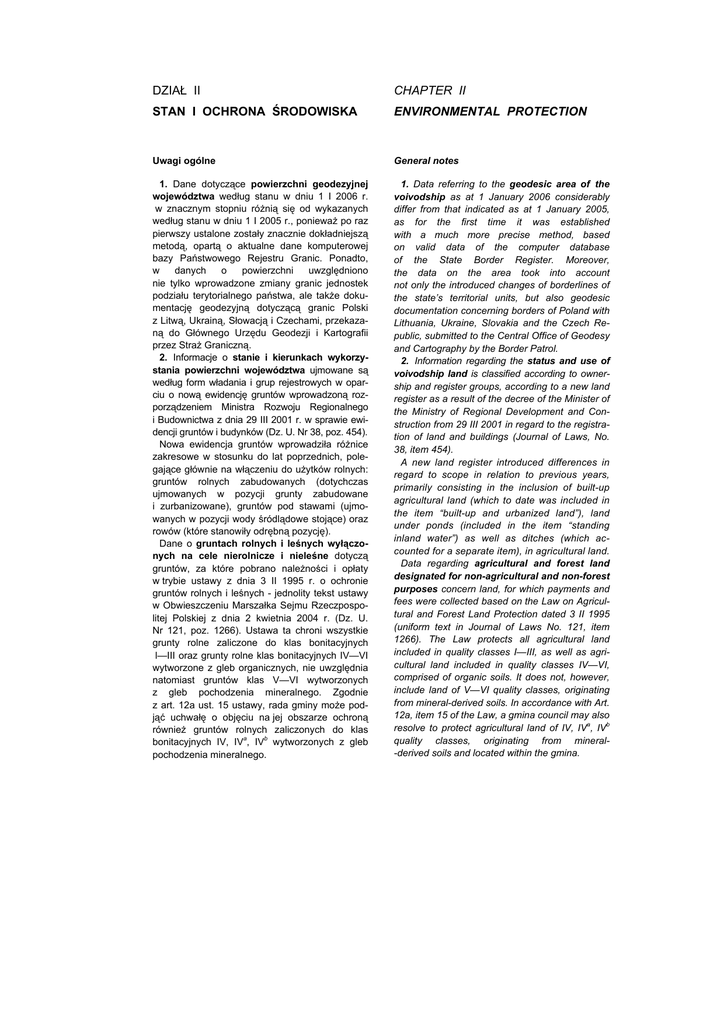 DZIAŁ II CHAPTER II STAN I OCHRONA ŚRODOWISKA ENVIRONMENTAL PROTECTION Uwagi ogólne General notes 1. Dane dotyczące powierzchni geodezyjnej województwa według stanu w dniu 1 I 2006 r. w znacznym stopniu różnią się od wykazanych według stanu w dniu 1 I 2005 r., ponieważ po raz pierwszy ustalone zostały znacznie dokładniejszą metodą, opartą o aktualne dane komputerowej bazy Państwowego Rejestru Granic. Ponadto, w danych o powierzchni uwzględniono nie tylko wprowadzone zmiany granic jednostek podziału terytorialnego państwa, ale także dokumentację geodezyjną dotyczącą granic Polski z Litwą, Ukrainą, Słowacją i Czechami, przekazaną do Głównego Urzędu Geodezji i Kartografii przez Straż Graniczną. 2. Informacje o stanie i kierunkach wykorzystania powierzchni województwa ujmowane są według form władania i grup rejestrowych w oparciu o nową ewidencję gruntów wprowadzoną rozporządzeniem Ministra Rozwoju Regionalnego i Budownictwa z dnia 29 III 2001 r. w sprawie ewidencji gruntów i budynków (Dz. U. Nr 38, poz. 454). Nowa ewidencja gruntów wprowadziła różnice zakresowe w stosunku do lat poprzednich, polegające głównie na włączeniu do użytków rolnych: gruntów rolnych zabudowanych (dotychczas ujmowanych w pozycji grunty zabudowane i zurbanizowane), gruntów pod stawami (ujmowanych w pozycji wody śródlądowe stojące) oraz rowów (które stanowiły odrębną pozycję). Dane o gruntach rolnych i leśnych wyłączonych na cele nierolnicze i nieleśne dotyczą gruntów, za które pobrano należności i opłaty w trybie ustawy z dnia 3 II 1995 r. o ochronie gruntów rolnych i leśnych - jednolity tekst ustawy w Obwieszczeniu Marszałka Sejmu Rzeczpospolitej Polskiej z dnia 2 kwietnia 2004 r. (Dz. U. Nr 121, poz. 1266). Ustawa ta chroni wszystkie grunty rolne zaliczone do klas bonitacyjnych l—III oraz grunty rolne klas bonitacyjnych IV—VI wytworzone z gleb organicznych, nie uwzględnia natomiast gruntów klas V—VI wytworzonych z gleb pochodzenia mineralnego. Zgodnie z art. 12a ust. 15 ustawy, rada gminy może podjąć uchwałę o objęciu na jej obszarze ochroną również gruntów rolnych zaliczonych do klas a b bonitacyjnych IV, IV , IV wytworzonych z gleb pochodzenia mineralnego. 1. Data referring to the geodesic area of the voivodship as at 1 January 2006 considerably differ from that indicated as at 1 January 2005, as for the first time it was established with a much more precise method, based on valid data of the computer database of the State Border Register. Moreover, the data on the area took into account not only the introduced changes of borderlines of the state’s territorial units, but also geodesic documentation concerning borders of Poland with Lithuania, Ukraine, Slovakia and the Czech Republic, submitted to the Central Office of Geodesy and Cartography by the Border Patrol. 2. Information regarding the status and use of voivodship land is classified according to ownership and register groups, according to a new land register as a result of the decree of the Minister of the Ministry of Regional Development and Construction from 29 III 2001 in regard to the registration of land and buildings (Journal of Laws, No. 38, item 454). A new land register introduced differences in regard to scope in relation to previous years, primarily consisting in the inclusion of built-up agricultural land (which to date was included in the item “built-up and urbanized land”), land under ponds (included in the item “standing inland water”) as well as ditches (which accounted for a separate item), in agricultural land. Data regarding agricultural and forest land designated for non-agricultural and non-forest purposes concern land, for which payments and fees were collected based on the Law on Agricultural and Forest Land Protection dated 3 II 1995 (uniform text in Journal of Laws No. 121, item 1266). The Law protects all agricultural land included in quality classes I—III, as well as agricultural land included in quality classes IV—VI, comprised of organic soils. It does not, however, include land of V—VI quality classes, originating from mineral-derived soils. In accordance with Art. 12a, item 15 of the Law, a gmina council may also resolve to protect agricultural land of IV, IVa, IVb quality classes, originating from mineral-derived soils and located within the gmina. 72 STAN I OCHRONA ŚRODOWISKA Klasy bonitacyjne użytków rolnych określają jakość użytków rolnych pod względem przydatności do produkcji rolniczej; klasa l oznacza najwyższą wartość rolniczą, klasa VI — najniższą. Grunty przeznaczone pod zalesienia oznaczono symbolami: orne — RZ; pastwiska — PsZ. 3. Dane o gruntach zdewastowanych i zdegradowanych wymagających rekultywacji i zagospodarowania dotyczą gruntów, które utraciły całkowicie wartości użytkowe (grunty zdewastowane) oraz gruntów, których wartość użytkowa zmalała w wyniku pogorszenia się warunków przyrodniczych lub wskutek zmian środowiska oraz działalności przemysłowej, a także wadliwej działalności rolniczej (grunty zdegradowane). Rekultywacja gruntów polega na nadaniu lub przywróceniu gruntom zdegradowanym lub zdewastowanym wartości użytkowych lub przyrodniczych przez właściwe ukształtowanie rzeźby terenu, poprawienie właściwości fizycznych i chemicznych, uregulowanie stosunków wodnych, odtworzenie gleb, umocnienie skarp oraz odbudowanie lub zbudowanie niezbędnych dróg. Zagospodarowanie gruntów zrekultywowanych polega na wykonaniu odpowiednich zabiegów umożliwiających wykorzystanie tych gruntów dla celów rolniczych, leśnych, komunalnych i innych. 4. Informacje o poborze wody dotyczą: 1) w pozycji „na cele produkcyjne (poza rolnictwem, łowiectwem, leśnictwem oraz rybactwem)” — jednostek organizacyjnych wnoszących opłaty za pobór z ujęć własnych rocz3 nie 5 dam i więcej wody podziemnej albo 20 3 dam i więcej wody powierzchniowej 
