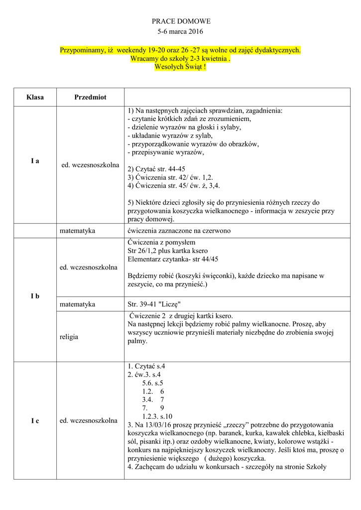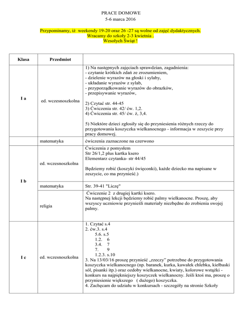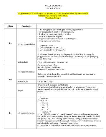 PRACE DOMOWE 5-6 marca 2016 Przypominamy, iż weekendy 19-20 oraz 26 -27 są wolne od zajęć dydaktycznych. Wracamy do szkoły 2-3 kwietnia . Wesołych Świąt ! Klasa Przedmiot 1) Na następnych zajęciach sprawdzian, zagadnienia: - czytanie krótkich zdań ze zrozumieniem, - dzielenie wyrazów na głoski i sylaby, - układanie wyrazów z sylab, - przyporządkowanie wyrazów do obrazków, - przepisywanie wyrazów, Ia ed. wczesnoszkolna 2) Czytać str. 44-45 3) Ćwiczenia str. 42/ ćw. 1,2. 4) Ćwiczenia str. 45/ ćw. ż, 3,4. 5) Niektóre dzieci zgłosiły się do przyniesienia różnych rzeczy do przygotowania koszyczka wielkanocnego - informacja w zeszycie przy pracy domowej. matematyka ćwiczenia zaznaczone na czerwono Ćwiczenia z pomysłem Str 26/1,2 plus kartka ksero Elementarz czytanka- str 44/45 ed. wczesnoszkolna Będziemy robić (koszyki święconki), każde dziecko ma napisane w zeszycie, co ma przynieść.) Ib matematyka religia Ic ed. wczesnoszkolna Str. 39-41 "Liczę" Ćwiczenie 2 z drugiej kartki ksero. Na następnej lekcji będziemy robić palmy wielkanocne. Proszę, aby wszyscy uczniowie przynieśli materiały niezbędne do zrobienia swojej palmy. 1. Czytać s.4 2. ćw.3. s.4 5.6. s.5 1.2. 6 3.4. 7 7. 9 1.2.3. s.10 3. Na 13/03/16 proszę przynieść „rzeczy” potrzebne do przygotowania koszyczka wielkanocnego (np. baranek, kurka, kawałek chlebka, kiełbaski sól, pisanki itp.) oraz ozdoby wielkanocne, kwiaty, kolorowe wstążki konkurs na najpiękniejszy koszyczek wielkanocny. Jeśli ktoś ma, proszę o przyniesienie większego ( dużego) koszyczka. 4. Zachęcam do udziału w konkursach - szczegóły na stronie Szkoły religia język polski II a matematyka religia II b język polski Ćwiczenie 2 z drugiej kartki ksero. Na następnej lekcji będziemy robić palmy wielkanocne. Proszę, aby wszyscy uczniowie przynieśli materiały niezbędne do zrobienia swojej palmy. 1. Ćwiczyć pisownię wyrazów z "h" i "ch" oraz wyrazy pokrewne ( rodzina wyrazów ) 2. SPRAWDZIAN 12/03/16 - materiał gramatyczno - ortograficzny w zeszycie - układanie wyrazów w kolejności alfabetycznej - pisownia wyrazów z utratą dźwięczności "rz" wymiennym ze spółgłoskami miękkimi 3. ćw.1.2. s.3 1.2.3.4. s.4 5.6. 5 1.2. 6 1.2.3. 7 4. Czytac s.4-5 kartka ksero 5. Na 12/03/16 proszę przynieść „rzeczy” potrzebne do przygotowania koszyczka wielkanocnego (np. baranek, kurka, kawałek chlebka, kiełbaski, sól, pisanki itp.) oraz ozdoby wielkanocne, kwiaty, kolorowe wstążki konkurs na najpiękniejszy koszyczek wielkanocny. Jeśli ktoś ma, proszę o przyniesienie większego ( dużego) koszyczka.. 6. Zachęcam do udziału w konkursach - szczegóły na stronie Szkoły ćwiczenia do s.31 Brak zadania domowego. Na następnej lekcji będziemy robić palmy wielkanocne. Proszę, aby wszyscy uczniowie przynieśli materiały niezbędne do zrobienia swojej palmy. 1. Ćwiczyć pisownię wyrazów z "h" i "ch" oraz wyrazy pokrewne ( rodzina wyrazów ) 2. SPRAWDZIAN 13/03/16 - materiał gramatyczno - ortograficzny w zeszycie - układanie wyrazów w kolejności alfabetycznej - pisownia wyrazów z utratą dźwięczności "rz" wymiennym ze spółgłoskami miękkimi 3. ćw.1.2. s.3 1.3.4. s.4 5.6. 5 1.2. 6 1.2.3. 7 4. Czytac s.4-5 kartka ksero 5. Na 13/03/16 proszę przynieść „rzeczy” potrzebne do przygotowania koszyczka wielkanocnego (np. baranek, kurka, kawałek chlebka, kiełbaski sól, pisanki itp.) oraz ozdoby wielkanocne, kwiaty, kolorowe wstążki konkurs na najpiękniejszy koszyczek wielkanocny. Jeśli ktoś ma, proszę o przyniesienie większego ( dużego) koszyczka. 6. Zachęcam do udziału w konkursach - szczegóły na stronie Szkoły religia matematyka Brak zadania domowego. Na następnej lekcji będziemy robić palmy wielkanocne. Proszę, aby wszyscy uczniowie przynieśli materiały niezbędne do zrobienia swojej palmy. ćwiczenia do s.12 1) Na następnych zajęciach sprawdzian, zagadnienia: - czytanie ze zrozumieniem, - pisanie ze słuchu, - rzeczowniki, czasowniki, przymiotniki - rozróżnianie, - określanie liczby, osoby i czasu czasowników, - wyrazy o znaczeniu przeciwnym, III a język polski 2) Przynosimy książki cz. 4. 3) Wykonać ćwiczenia na kartkach ksero. 4) Niektóre dzieci zgłosiły się do przyniesienia różnych rzeczy do przygotowania koszyczka wielkanocnego - informacja w zeszycie przy pracy domowej matematyka Rozdziały 19-22 cz. 3 K.P 1/1 K.P 1/5 Mazurek Dąbrowskiego- na pamięć język polski III b Będziemy robić (koszyki święconki), każde dziecko ma napisane w zeszycie, co ma przynieść.) matematyka Rozdziały 1-4 cz. 4 język polski Ćw. 1, 2, 4 str. 61-62 Ćwiczyć role do przedstawienia. Dziewczynki, które dostały teksty piosenek proszę, aby przesłuchały je na YOU TUBE. Proszę, aby uczniowie biorący udział w przedstawieniu wielkanocnym mieli przebrania odpowiednie do swoich ról. Przypominam o przyniesieniu rzeczy do koszyczka wielkanocnego WOP Proszę przynieść różne informacje na teamt ekologii, ochrony środowiska. matematyka Str. 29,30,31,32 Zeszyt ćw.2 IV język polski Va WOP 1. Podręcznik str. 162 ćw. 2 i 4 2. Czytamy kolejne 4 rozdziały lektury- termin 2 kwietnia 3. Dla chętnych na „6” – Zredaguj własny mit i powstaniu świata 4. Przypominam o przyniesieniu rzeczy do koszyczka wielkanocnego 5. Przygotować zeszyty i ćwiczenia do kontroli Proszę przygotować się do sprawdzianu - 1. Kto był ostatnim królem Polski? 2. Wyjaśnij pojęcie ,,obiady czwartkowe". 3. Podaj daty rozbiorów oraz kto w nich uczestniczył. 4. Kiedy została powołana i czym się zajmowała Komisja Edukacji Narodowej? 5. Kiedy została uchwalona i jakie zasady zawierała Konstytucja 3 maja? 6. Przeciwko czemu została zawiązana konfederacja targowicka? 7. Kiedy wybuchło powstanie kościuszkowskie? 8. Co zawierał uniwersał połaniecki? 9. Wymień cechy stylu barokowego. 10. Wymień najważniejsze wynalazki epoki oświecenia. matematyka j