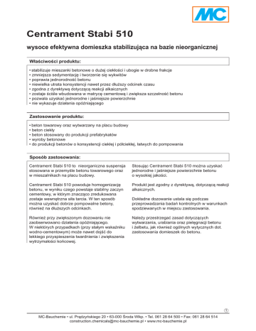 Centrament Stabi 510 wysoce efektywna domieszka stabilizująca na bazie nieorganicznej Właściwości produktu: •stabilizuje mieszanki betonowe o dużej ciekłości i ubogie w drobne frakcje • zmniejsza sedymentację i tworzenie się wykwitów • poprawia jednorodność betonu • niewielka utrata konsystencji nawet przez dłuższy odcinek czasu • zgodna z dyrektywą dotyczącą reakcji alkaicznych • zostaje ściśle wbudowana w matrycę cementową i zwiększa szczelność betonu • pozwala uzyskać jednorodne i jaśniejsze powierzchnie • nie wykazuje działania opóźniającego Zastosowanie produktu: •beton towarowy oraz wytwarzany na placu budowy • beton ciekły • beton stosowany do produkcji prefabrykatów • wyroby betonowe • do produkcji betonów o konsystencji ciekłej i półciekłej, łatwych do pompowania Sposób zastosowania: Centrament Stabi 510 to nieorganiczna suspensja stosowana w przemyśle betonu towarowego oraz w mieszalnikach na placu budowy. Stosując Centrament Stabi 510 można uzyskać jednorodne i jaśniejsze powierzchnie betonu o wysokiej jakości. Centrament Stabi 510 powoduje homogenizację betonu, w wyniku czego powstaje stabilny zaczyn cementowy, w którym znacząco zredukowana zostaje wewnętrzna siła tarcia. W ten sposób można uzyskać dobrze pompowalne betony, również na dłuższych odcinkach. Produkt jest zgodny z dyrektywą, dotyczącą reakcji alkaicznych. Również przy zwiększonym dozowaniu nie zaobserwowano działania opóźniającego. W niektórych przypadkach (przy stałym wskaźniku wodno-cementowym) może nawet dojść do lekkiego przyspieszenia twardnienia i zwiększenia wytrzymałości końcowej. Należy przestrzegać zasad dotyczących wytwarzania, urabiania oraz pielęgnacji betonu i żelbetu, jak również ogólnych wytycznych dot. zastosowania domieszek do betonu. Dokładne dozowanie ustala się podczas przeprowadzania badań kontrolnych w warunkach spodziewanych w miejscu zastosowania. 1 MC-Bauchemie • ul. Prądzyńskiego 20 • 63-000 Środa Wlkp. • Tel. 061 28 64 500 • Fax: 061 28 64 514 [email protected] • www.mc-bauchemie.pl Techniczne właściwości produktu Centrament Stabi 510: Parametr Gęstość objętościowa Jednostka miary kg/dm 3 Wartość Uwagi ok. 1,14 - Sucha masa % ok. 20 - Zalecane dozowanie g 2 – 50 na 1 kg cementu Maks. zawartość chlorków % zawartość masy < 0,10 Maks. zawartość alkaliów % zawartość masy < 1,5 Właściwości produktu Centrament Stabi 510: Rodzaj domieszki Stabilizator wg EN 934-2: T 4 Nazwa domieszki Centrament Stabi 510 Barwa biała Postać płynna Deklaracje zgodności 0754-CPD-02-1065.2 0754-CPD-02-1067.2 Miejsce notyfikacji MPA, Karlsruhe Zakładowa Kontrola Produkcji ISO 9001 / EN 934-2/6 Kolor etykiety fioletowy Sposób dostawy beczka 230 kg kontener 1000 kg Uwaga! Wszelkie informacje zawarte w niniejszej karcie oparte są na naszym doświadczeniu i najlepszej wiedzy, jednakże nie mogą być traktowane jako prawnie wiążące. Należy bezwzględnie każdorazowo stosować się do prawodawstwa miejscowego, w zakresie przeznaczenia oraz zastosowania w obiektach budowlanych. Przy spełnieniu powyższych wymogów odpowiadamy za poprawność przekazanych informacji w ramach naszych Ogólnych Warunków Sprzedaży, Dostaw i Płatności.Wszelkie doradztwo ze strony naszych Współpracowników, odbiegające od treści naszych kart technicznych, jest wiążące jedynie w przypadku pisemnego ich potwierdzenia. W każdym przypadku należy stosować się do ogólnie obowiązujących zasad sztuki budowlanej. Wydanie 04/12. Niniejszy druk został zaktualizowany pod względem technicznym. Tym samym unieważnia się dotychczasowe wydania i nie wolno ich stosować. W przypadku wydania nowej karty, zaktualizowanej pod względem technicznym, niniejsze wydanie traci ważność. MC-Bauchemie • ul. Prądzyńskiego 20 • 63-000 Środa Wlkp. • Tel. 061 28 64 500 • Fax: 061 28 64 514 [email protected] • www.mc-bauchemie.pl 2