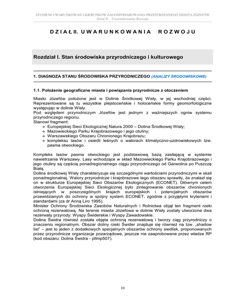 STUDIUM UWARUNKOWAŃ I KIERUNKÓW ZAGOSPODAROWANIA PRZESTRZENNEGO MIASTA JÓZEFÓW Dział II – Uwarunkowania Rozwoju D Z I A Ł II. U W A R U N K O W A N I A ROZWOJU Rozdział I. Stan środowiska przyrodniczego i kulturowego 1. DIAGNOZA STANU ŚRODOWISKA PRZYRODNICZEGO (ANALIZY ŚRODOWISKOWE) 1.1. Położenie geograficzne miasta i powiązania przyrodnicze z otoczeniem Miasto Józefów położone jest w Dolinie Środkowej Wisły, w jej wschodniej części. Reprezentowane są tu wszystkie plejstoceńskie i holoceńskie formy geomorfologiczne występując w dolinie Wisły. Pod względem przyrodniczym Józefów jest jednym z ważniejszych ogniw systemu przyrodniczego regionu. Stanowi fragment: Europejskiej Sieci Ekologicznej Natura 2000 – Dolina Środkowej Wisły; Mazowieckiego Parku Krajobrazowego i jego otuliny; Warszawskiego Obszaru Chronionego Krajobrazu; kompleksu lasów i osiedli leśnych o walorach klimatyczno-uzdrowiskowych tzw. pasma otwockiego. Kompleks lasów pasma otwockiego jest podstawową bazą zasilającą w systemie nawietrzania Warszawy. Lasy wchodzące w skład Mazowieckiego Parku Krajobrazowego i jego otuliny są częścią ponadregionalnego ciągu przyrodniczego od Garwolina po Puszczę Białą. Dolina środkowej Wisły charakteryzuje się szczególnymi wartościami przyrodniczymi w skali ponadregionalnej. Walory przyrodnicze i krajobrazowe tego obszaru sprawiły, że znalazł się on w strukturze Europejskiej Sieci Obszarów Ekologicznych (ECONET). Głównym celem utworzenia Europejskiej Sieci Ekologicznej było zintegrowanie obszarów chronionych istniejących w poszczególnych krajach europejskich i potencjalnych obszarów przewidzianych do ochrony w spójny system ECONET, zgodnie z przyjętymi kryteriami i standardami (za dr Anną Liro 1995). Minister Ochrony Środowiska Zasobów Naturalnych i Rolnictwa objął ten fragment rzeki ochroną rezerwatową. Na terenie miasta Józefowa w dolinie Wisły zostały utworzone dwa rezerwaty przyrody: Wyspy Świderskie i Wyspy Zawadowskie. Dolina Świdra również została objęta ochroną rezerwatową i tworzy ciąg przyrodniczy o znaczeniu regionalnym. Obszar doliny rzeki Świder znajduje się również na tzw. „shadow list” – jest to jeden z dodatkowych specjalnych obszarów ochrony siedlisk, proponowanych przez przyrodnicze organizacje pozarządowe, jeszcze nie zaaprobowane przez władze RP (kod obszaru: Dolina Świdra - pltmp507). 10 STUDIUM UWARUNKOWAŃ I KIERUNKÓW ZAGOSPODAROWANIA PRZESTRZENNEGO MIASTA JÓZEFÓW Dział II – Uwarunkowania Rozwoju 1.2. Charakterystyka warunków środowiska naturalnego Rzeźba terenu. Miasto Józefów położone jest w dolinie Wisły i Świdra. Reprezentowane są tu wszystkie poziomy tarasowe doliny od tarasu zalewowego poprzez tarasy nadzalewowe do tarasu wydmowego. Najwyżej położone tereny występują przy północno-wschodniej granicy miasta, na wydmie (113 m npm.), najniżej w zachodniej części, w strefie korytowej Wisły (85 m npm.). Przestrzennie w większości zabudowa miejska zlokalizowana jest na tarasie nadzalewowym i wydmowym Wisły. Granica tarasów jest nieczytelna w terenie, często przykryta utworami eolicznymi. Formy wydmowe występują w części wschodniej i północno-zachodniej miasta. Wyraźną formą w terenie jest skarpa oddzielająca taras zalewowy od tarasu nadzalewowego Wisły (wysokość względna osiąga około 5 m). Powierzchnia tarasu zalewowego jest urozmaicona, z licznymi obniżeniami - dolinkami przelewowymi i zbiornikami wodnymi. Strefę korytową oddziela od wyższej części tarasu 2-3 metrowa krawędź. Jest to granica terenów zalewanych przy tzw. średniej wysokiej wodzie. Dolina Świdra jest wyraźnie wykształcona w terenie. Krawędzie erozyjne osiągają wysokość 1,5-4 m. Taras zalewowy stanowi płaską powierzchnię wyniesioną 1-2 m. nad zwierciadło wody w rzece przy stanie średnim; taras nadzalewowy jest wyniesiony 1-3,5 m nad taras zalewowy i nie stanowi ciągłej powierzchni. Wody powierzchniowe. Układ hydrograficzny terenu opracowania tworzą rzeki: Wisła, Świder i Mienia. Są to rzeki graniczne. Koryto Wisły na wysokości Józefowa ma charakter naturalny. Brak jest obwałowań. Teoretycznie przy stanie średnim wody, zalewana jest cała zachodnia część tarasu zalewowego. Przy stanach powodziowych zalewany jest cały taras. W obrębie strefy korytowej liczne smugi i obniżenia przelewowe wypełnione są wodą także przy stanach niskich i średnich Wisły. W strefie przykrawędziowej tarasu zalewowego występuje szereg drobnych zbiorników wodnych lokalnych podmokłości. Na wysokości osiedla Nowa Wieś uformowało się jezioro Łacha, jedna z największych łach - starorzeczy Wisły w tym rejonie. Odpływ wód z jeziora następuje do Wisły poprzez "Strugę pod Małpim Gajem". Wysokie walory przyrodnicze i krajobrazowe doliny Wisły spowodowały wprowadzenie na te tereny ochrony rezerwatowej. Świder i Mienia biorą początek poza terenem opracowania. Rzeki te płyną również naturalnymi dolinami z wykształconymi tarasami. Obie rzeki są w obrębie miasta chronione jako rezerwaty. Budowa geologiczna. Grunty budowlane. Dolina środkowej Wisły była w plejstocenie miejscem intensywnej erozji i gromadzenia się osadów rzecznych i wodnolodowcowych. W podłożu na obszarze prawie całego Józefowa występują zatem wyłącznie piaski różnych frakcji, pospółki i żwiry osiągające miąższość ponad 70 m i spoczywające na iłach pstrych pliocenu. Jedynie we wschodniej części miasta wśród osadów tarasu otwockiego na niewielkim fragmencie w podłożu spotkać można serię rzeczno-zastoiskowych pyłów, pyłów piaszczystych i glin pylastych o miąższości 2,5 m, a występujących na głębokości ponad 3 m. Osady rzeczne tarasów plejstoceńskich pokryte są serią piasków eolicznych tworzących cienkie pokrywy, lub budujących wydmy. Holoceński taras zalewowy jest formą bardzo młodą. Uformowany zos