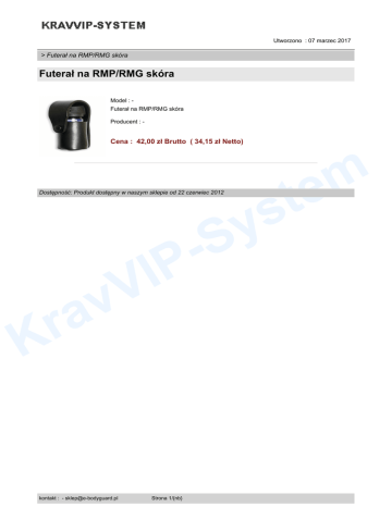 Utworzono : 07 marzec 2017 > Futerał na RMP/RMG skóra Futerał na RMP/RMG skóra Model : Futerał na RMP/RMG skóra Producent : - Cena : 42,00 zł Brutto ( 34,15 zł Netto) V v a r S IP K kontakt : - [email protected] Strona 1/{nb} m te s y Dostępność: Produkt dostępny w naszym sklepie od 22 czerwiec 2012