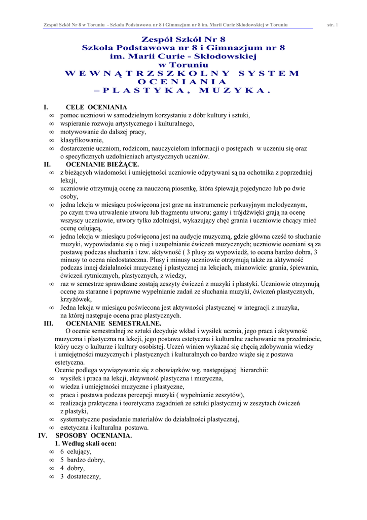 Zespół Szkół Nr 8 w Toruniu - Szkoła Podstawowa nr 8 i Gimnazjum nr 8 im. Marii Curie Skłodowskiej w Toruniu Zespół Szkół Nr 8 Szkoła Podstawowa nr 8 i Gimnazjum nr 8 im. Marii Curie - Skłodowskiej w Toruniu W E W N Ą T R Z S Z K O LN Y S Y S T E M O C E N I A N I A – P L A S T Y K A , M U Z Y K A . I. CELE OCENIANIA pomoc uczniowi w samodzielnym korzystaniu z dóbr kultury i sztuki, wspieranie rozwoju artystycznego i kulturalnego, motywowanie do dalszej pracy, klasyfikowanie, dostarczenie uczniom, rodzicom, nauczycielom informacji o postępach w uczeniu się oraz o specyficznych uzdolnieniach artystycznych uczniów. II. OCENIANIE BIEŻĄCE. • z bieżących wiadomości i umiejętności uczniowie odpytywani są na ochotnika z poprzedniej lekcji, • uczniowie otrzymują ocenę za nauczoną piosenkę, która śpiewają pojedynczo lub po dwie osoby, • jedna lekcja w miesiącu poświęcona jest grze na instrumencie perkusyjnym melodycznym, po czym trwa utrwalenie utworu lub fragmentu utworu; gamy i trójdźwięki grają na ocenę wszyscy uczniowie, utwory tylko zdolniejsi, wykazujący chęć grania i uczniowie chcący mieć ocenę celującą, • jedna lekcja w miesiącu poświęcona jest na audycje muzyczną, gdzie główna cześć to słuchanie muzyki, wypowiadanie się o niej i uzupełnianie ćwiczeń muzycznych; uczniowie oceniani są za postawę podczas słuchania i tzw. aktywność ( 3 plusy za wypowiedź, to ocena bardzo dobra, 3 minusy to ocena niedostateczna. Plusy i minusy uczniowie otrzymują także za aktywność podczas innej działalności muzycznej i plastycznej na lekcjach, mianowicie: grania, śpiewania, ćwiczeń rytmicznych, plastycznych, z wiedzy, • raz w semestrze sprawdzane zostają zeszyty ćwiczeń z muzyki i plastyki. Uczniowie otrzymują ocenę za staranne i poprawne wypełnianie zadań ze słuchania muzyki, ćwiczeń plastycznych, krzyżówek, • Jedna lekcja w miesiącu poświecona jest aktywności plastycznej w integracji z muzyka, na której następuje ocena prac plastycznych. III. OCENIANIE SEMESTRALNE. O ocenie semestralnej ze sztuki decyduje wkład i wysiłek ucznia, jego praca i aktywność muzyczna i plastyczna na lekcji, jego postawa estetyczna i kulturalne zachowanie na przedmiocie, który uczy o kulturze i kultury osobistej. Uczeń winien wykazać się chęcią zdobywania wiedzy i umiejętności muzycznych i plastycznych i kulturalnych co bardzo wiąże się z postawa estetyczna. Ocenie podlega wywiązywanie się z obowiązków wg. następującej hierarchii: • wysiłek i praca na lekcji, aktywność plastyczna i muzyczna, • wiedza i umiejętności muzyczne i plastyczne, • praca i postawa podczas percepcji muzyki ( wypełnianie zeszytów), • realizacja praktyczna i teoretyczna zagadnień ze sztuki plastycznej w zeszytach ćwiczeń z plastyki, • systematyczne posiadanie materiałów do działalności plastycznej, • estetyczna i kulturalna postawa. IV. SPOSOBY OCENIANIA. 1. Według skali ocen: • 6 celujący, • 5 bardzo dobry, • 4 dobry, • 3 dostateczny, • • • • • str. 1 Zespół Szkół Nr 8 w Toruniu - Szkoła Podstawowa nr 8 i Gimnazjum nr 8 im. Marii Curie Skłodowskiej w Toruniu • • 2 dopuszczający, 1 niedostateczny. 2. Ocena za wiadomości: • celujący 6 – uczeń posiada wiedze ponadprogramowa w zakresie sztuki (muzyki i plastyki) i wykorzystuje ja w praktycznym działaniu. • bardzo dobry 5 – uczeń posiada dobre wiadomości z zakresu sztuki i wykorzystuje je w praktyce. • dobry 4 – uczeń posiadane wiadomości potrafi wykorzystać w praktyce przy pomocy nauczyciela, • dostateczny 3 – w wiadomościach ucznia są luki, a te które posiada nie potrafi wykorzystać w praktyce, • dopuszczający 2 – uczeń posiada małe wiadomości i nie wykorzystuje ich w praktyce nawet przy pomocy nauczyciela, • niedostateczny 1 – uczeń posiada znikomą wiedze, nie wykorzystuje ich w praktyce, nie wykazuje chęci , nawet przy szczególnej pomocy ze strony nauczyciela. 3. Ocena za umiejętności. • celujący 6 -posiada szczególnie rozwinięte umiejętności muzyczne i plastyczne, dzięki którym osiąga sukcesy w tych dziedzinach, • bardzo dobry 5 -posiada bardzo dobrze rozwinięte umiejętności określone programem w zakresie śpiewu, gry oraz plastyczne, • dobry 4 -posiada umiejętności określone programem w zakresie śpiewu i plastyki, • dostateczny 3 -rozwinął umiejętności w zakresie podstawowym w śpiewie lub w plastyce, • dopuszczający 2 -rozwinął umiejętności plastyczne lub muzyczne umożliwiające kontynuację nauki na następnym etapie. • Niedostateczny 1 -nie wykazuje żadnego wysiłku w rozwijaniu jakichkolwiek umiejętności muzycznych czy plastycznych umożliwiających dalszą naukę. 4. Ocena za aktywność. • Celujący -6 -zawsze bierze aktywny udział w lekcjach sztuki, reprezentuje szkołę podczas występów w uroczystościach szkolnych, na konkursach muzycznych i plastycznych oraz bierze udział w zajęciach pozalekcyjnych muzycznych lub plastycznych. • bardzo dobry -5 -zawsze bierze aktywny udział w lekcjach sztuki, wykazuje zainteresowanie przedmiotem, • dobry -4 -bierze aktywny udział w lekcjach sztuki, • dostateczny -3 -nie zawsze jest aktywny, czasami wykazuje zainteresowanie przedmiotem, • dopuszczający –2 -nie zawsze jest aktywny, nie wykazuje zainteresowania przedmiotem, • niedostateczny -1 -nie jest aktywny, nie wykazuje zainteresowania przedmiotem, nie pracuje na lekcji, nie akceptuje pomocy ze strony nauczyciela. Uwaga: Przez aktywność na sztuce należy rozumieć zaangażowanie się ucznia w następujących formach aktywności: śpiewie, grze na instrumentach, percepcji muzyki, wykonywanie zadań plastycznych w miarę swoich możliwości. DYREKTOR SZKOŁY ............................................... ........ mgr Zygmunt Chlebowski str. 2