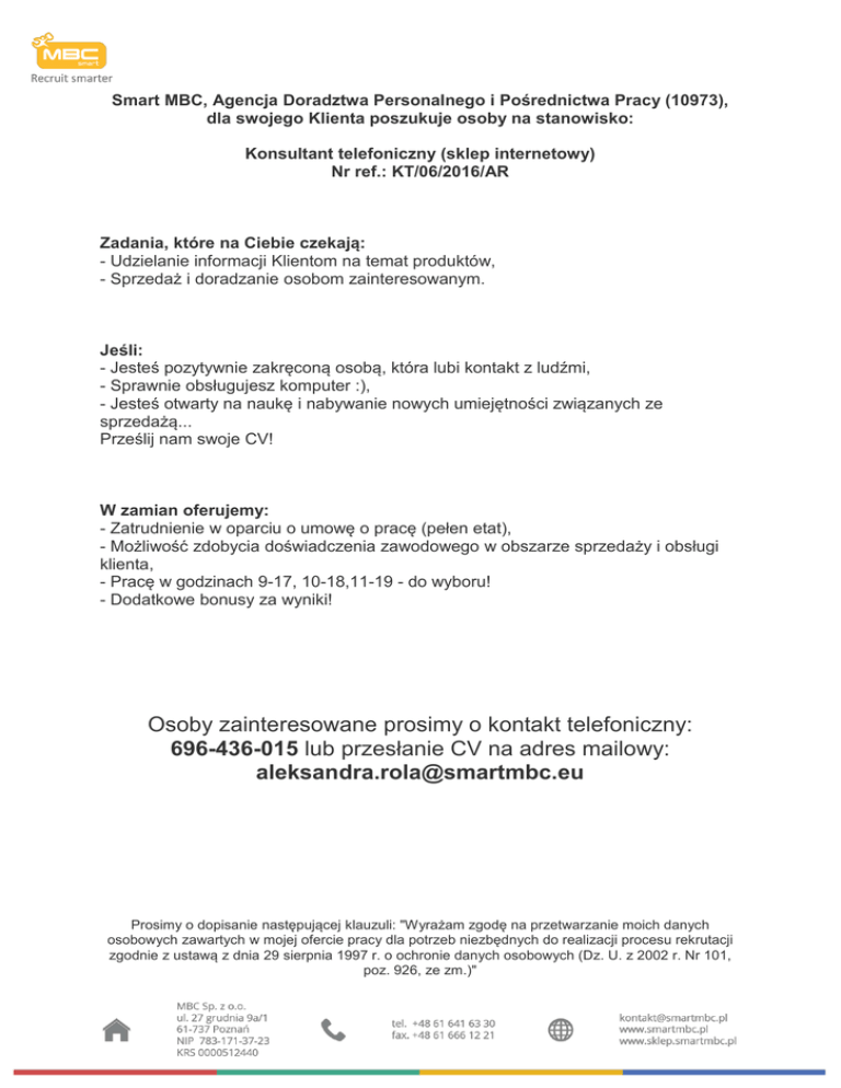 Smart MBC, Agencja Doradztwa Personalnego i Pośrednictwa Pracy (10973), dla swojego Klienta poszukuje osoby na stanowisko: Konsultant telefoniczny (sklep internetowy) Nr ref.: KT/06/2016/AR Zadania, które na Ciebie czekają: - Udzielanie informacji Klientom na temat produktów, - Sprzedaż i doradzanie osobom zainteresowanym. Jeśli: - Jesteś pozytywnie zakręconą osobą, która lubi kontakt z ludźmi, - Sprawnie obsługujesz komputer :), - Jesteś otwarty na naukę i nabywanie nowych umiejętności związanych ze sprzedażą... Prześlij nam swoje CV! W zamian oferujemy: - Zatrudnienie w oparciu o umowę o pracę (pełen etat), - Możliwość zdobycia doświadczenia zawodowego w obszarze sprzedaży i obsługi klienta, - Pracę w godzinach 9-17, 10-18,11-19 - do wyboru! - Dodatkowe bonusy za wyniki! Osoby zainteresowane prosimy o kontakt telefoniczny: 696-436-015 lub przesłanie CV na adres mailowy: [email protected] Prosimy o dopisanie następującej klauzuli: "Wyrażam zgodę na przetwarzanie moich danych osobowych zawartych w mojej ofercie pracy dla potrzeb niezbędnych do realizacji procesu rekrutacji zgodnie z ustawą z dnia 29 sierpnia 1997 r. o ochronie danych osobowych (Dz. U. z 2002 r. Nr 101, poz. 926, ze zm.)"