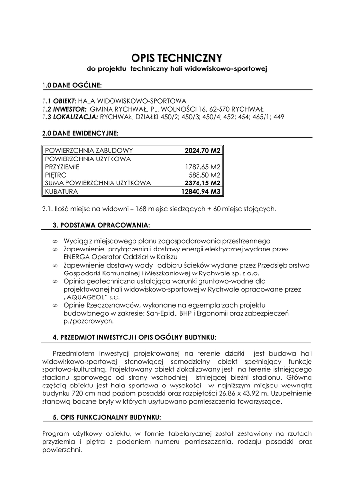 O P IS T E C H N IC Z N Y d o p r o je k tu te c h n ic z n y h a li w id o w is k o w o - s p o r to w e j 1.0 DANE OGÓLNE: 1.1 OBIEKT: HALA WIDOWISKOWO-SPORTOWA 1.2 INWESTOR: GMINA RYCHWAŁ, PL. WOLNOŚCI 16, 62-570 RYCHWAŁ 1.3 LOKALIZACJA: RYCHWAŁ, DZIAŁKI 450/2; 450/3; 450/4; 452; 454; 465/1; 449 2.0 DANE EWIDENCYJNE: POWIERZCHNIA ZABUDOWY POWIERZCHNIA UŻYTKOWA PRZYZIEMIE PIĘTRO SUMA POWIERZCHNIA UŻYTKOWA KUBATURA 2024,70 M2 1787,65 M2 588,50 M2 2376,15 M2 12840,94 M3 2.1. Ilość miejsc na widowni – 168 miejsc siedzących + 60 miejsc stojących. 3. PODSTAWA OPRACOWANIA: • • • • • Wyciąg z miejscowego planu zagospodarowania przestrzennego Zapewnienie przyłączenia i dostawy energii elektrycznej wydane przez ENERGA Operator Oddział w Kaliszu Zapewnienie dostawy wody i odbioru ścieków wydane przez Przedsiębiorstwo Gospodarki Komunalnej i Mieszkaniowej w Rychwale sp. z o.o. Opinia geotechniczna ustalająca warunki gruntowo-wodne dla projektowanej hali widowiskowo-sportowej w Rychwale opracowane przez „AQUAGEOL” s.c. Opinie Rzeczoznawców, wykonane na egzemplarzach projektu budowlanego w zakresie: San-Epid., BHP i Ergonomii oraz zabezpieczeń p./pożarowych. 4. PRZEDMIOT INWESTYCJI I OPIS OGÓLNY BUDYNKU: Przedmiotem inwestycji projektowanej na terenie działki jest budowa hali widowiskowo-sportowej stanowiącej samodzielny obiekt spełniający funkcję sportowo-kulturalną. Projektowany obiekt zlokalizowany jest na terenie istniejącego stadionu sportowego od strony wschodniej istniejącej bieżni stadionu. Główna częścią obiektu jest hala sportowa o wysokości w najniższym miejscu wewnątrz budynku 720 cm nad poziom posadzki oraz rozpiętości 26,86 x 43,92 m. Uzupełnienie stanowią boczne bryły w których usytuowano pomieszczenia towarzyszące. 5. OPIS FUNKCJONALNY BUDYNKU: Program użytkowy obiektu, w formie tabelarycznej został zestawiony na rzutach przyziemia i piętra z podaniem numeru pomieszczenia, rodzaju posadzki oraz powierzchni. W bryle głównej wysokiej zaprojektowano boisko o wymiarach 20,0 x 40,0 m oraz widownię stałą oraz magazyn sprzętu gimnastycznego. Pod widownią usytuowano magazyn sprzętu sportowego i gimnastycznego oraz zespół sanitariatów. Od strony stadionu (wschodniej i południowej) zaprojektowano nawę o niższej wysokości, w której znajdują się: hol reprezentacyjny wraz z małą gastronomią oraz pomieszczenia kręgielni. Kręgielnia została zagłębiona w terenie dzięki temu uzyskano możliwość lokalizacji sceny zewnętrznej wraz z zapleczem, zwrócona jest ona frontem do osi stadionu którego murawa będzie stanowić widownię wraz z trybunami stadionu. W części frontowej zlokalizowano również bryłę dwukondygnacyjną w której znajdują się sala fitness, sala korekcyjna, sala aerobiku oraz zaplecze biurowe, zaplecze sanitarne widowni salka klubowa oraz salka dodatkowa np. do tenisa i bilarda. Od strony zachodniej w bryle wysokiej na obu kondygnacjach zaprojektowano szatnie wraz z zapleczem, pokój nauczyciela i kotłownię. Obiekt posiada trzy niezależne wejścia, które spełniają też role ewakuacyjna • wejście główne podczas imprez, • wejście boczne używane podczas całodziennego użytkowania, • wejścia dodatkowe dla zawodników zawodów odbywających się na stadionie oraz klubu sportowego. • Wyjście ewakuacyjne z kubatury hali sportowej umożliwiające dostawę wyposażenia w większych gabarytach. 6.0 FORMA ARCHITEKTONICZNA OBIETKU Projekt zakłada wkomponowanie w architekturę istniejących budynków. Zastosowano kubistyczne, płaskie bryły. Nad główną bryłą zaprojektowano dach dwuspadowy ze świetlikiem dachowym. Niższa rozczłonkowana nawa od strony ulicy i od strony stadionu osłania główny gabaryt hali z boiskiem sportowym. Natomiast od strony zachodniej bryła dwukondygnacyjna stanowiąca zaplecze sanitarno-szatniowe boisk. Usytuowanie zespołów szatniowych nad sobą podyktowane jest oprócz układu funkcjonalnego całości obiektu również względami ekonomicznymi - wszelkie instalacje oraz wentylacja znajdują się na tych samych pionach. Dlatego też kotłownia znajduje się w skrzydle w którym jest największy pobór wody i ciepła. KOMUNIKACJA PIESZA: Ciągi piesze uzupełniono zielenią ozdobną. Obiekt wyposażony w podjazd dla osób niepełnosprawnych zlokalizowany przy wejściu głównym. 7.0 DANE TECHNICZNE : 7.1 Fundamenty. • Ławy fundamentowe i stopy żelbetowe – wg opisu projektu konstrukcji. 7.2 Ściany. • Ściany fundamentowe wewnętrzne i zewnętrzne gr.25 i 38 cm z bloczków betonowych M2-M6 kl. 20.0 MPa na zaprawie cementowej marki M10. • Ściany nośne pod widownią z bloczków żwirobetonowych M2-M6 kl. 20.0 MPa na zaprawie cementowej marki M10. • • • • • Pod nadprożami ułożyć 3 warstwy cegły ceramicznej pełnej kl.15MPa na zaprawie cementowo-wapiennej marki M10. Ściany łączyć z słupami za pomocą dwóch prętów Ø 8 mm w co drugiej spoinie. Filarki zakratkowane na rzucie przyziemia wykonać z cegły ceramicznej pełnej klasy 15.0 MPa na zaprawie cementowo-wapiennej marki M10. Ściany osłonowe powyżej izolacji przeciwwilgociowej murowane z pustaków ceramicznych gr. 44 cm klasy 10 MPa na zaprawie termoizolacyjnej marki M5 Ściany wewnętrzne powyżej izolacji przeciwwilgociowej murowane z pustaków ceramicznych gr. 25 i 38 cm klasy 15 MPa na zaprawie cementowowapiennej marki M10. Ścianki działowe murowane z cegły K3 gr.12cm klasy 10MPa lub pustaków ceramicznych gr. 11,5 cm klasy 10MPa na zaprawie cementowo-wapiennej marki M5 7.3 Nadproża i wieńce: • Do rozpiętości ls=2,41 m prefabrykowane typu L19 w przeliczeniu jedna beleczka na 12,0 cm ściany. • Nadproża dłuższe żelbetowe, monolityczne – wg opisu projektu konstrukcji. • Wieńce żelbetowe monolityczne wylewane na mokro na budowie – wg opisu projektu konstrukcji. 7.4 Słupy i trzpienie : • Słupy i trzpienie żelbetowe monolitycz