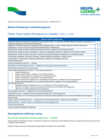 Załącznik do Umowy Grupowego Ubezpieczenia Zdrowotnego LUX MED dla Firm Wykaz Świadczeń ambulatoryjnych Pakiet Twoja Opieka Rozszerzona z dopłatą – F2UC_J1_ROZ Zakres opieki medycznej Dostęp do Placówek medycznych wskazanych przez Ubezpieczyciela – tj. placówek LUX MED, Medycyna Rodzinna wskazanych na właściwej podstronie www.luxmed.pl/ubezpieczenia Dostęp do Placówek medycznych wskazanych przez Ubezpieczyciela – tj. sieci współpracujących Placówek medycznych wskazanych na stronie www.luxmed.pl/placowkiwspolpracujace_wspolplacenie ✔ ✔ Nielimitowany dostęp do lekarzy podstawowej opieki zdrowotnej z dopłatą 20 zł do każdej konsultacji ✔ Nielimitowany dostęp do lekarzy specjalistów w zakresie 24 specjalizacji lekarskich z dopłatą 20 zł do każdej konsultacji ✔ Nielimitowany dostęp do lekarzy dyżurnych w zakresie 3 specjalizacji lekarskich z dopłatą 20 zł do każdej konsultacji ✔ Konsultacje specjalistów: psychiatra, psycholog, androlog, seksuolog, logopeda z limitem łącznym 3 konsultacji w 12-miesięcznym Okresie ubezpieczenia z dopłatą 20 zł do każdej konsultacji ✔ Zabiegi pielęgniarskie ✔ Zabiegi ambulatoryjne wariant II – z dopłatą ✔ Szczepienia przeciwko grypie i tężcowi – z dopłatą 20 zł do konsultacji przed szczepieniem ✔ Panel badań laboratoryjnych bez skierowania ✔ Panel badań diagnostycznych wariant I – 272 procedury medyczne: badania laboratoryjne badania rentgenowskie z dopłatą 15 zł do każdego badania badania ultrasonograficzne z dopłatą 15 zł do każdego badania badania endoskopowe z dopłatą 50 zł do każdego badania badania rezonansem magnetycznym i tomografem komputerowym z dopłatą 50 zł do każdego badania badania elektrokardiograficzne i inne badania diagnostyczne z dopłatą 15 zł do każdego badania Stomatologia wariant II bezpłatny przegląd stomatologiczny raz w 12-miesięcznym Okresie ubezpieczenia rabat 50% na usługi z zakresu stomatologii zachowawczej oraz profilaktyki stomatologicznej, rabat 20% na usługi ortodontyczne oraz protetyczne ✔ ✔ Testy alergiczne wariant I – z dopłatą 20 zł do konsultacji alergologa ✔ Prowadzenie ciąży – z dopłatą 20 zł do konsultacji ginekologa oraz 15 zł do badań USG ✔ Możliwość wykonania raz w 12-miesięcznym Okresie ubezpieczenia badań profilaktycznych w ramach profilaktycznego przeglądu stanu zdrowia ✔ Usługi z zakresu fizjoterapii wariant I – z dopłatą 20 zł do konsultacji lekarskiej – ustalenie trybu rehabilitacji ✔ Wizyty domowe – z limitem 3 wizyt w 12-miesięcznym Okresie ubezpieczenia ✔ Druga opinia medyczna ✔ Program ZDROWIE PIĘKNO HARMONIA ✔ Szczegółowe definicje usług Konsultacje specjalistów wariant podstawowy – z dopłatą Usługa obejmuje nielimitowane wizyty w Placówkach medycznych wskazanych przez Ubezpieczyciela w sytuacjach chorobowych oraz pomocy w nagłych zachorowaniach. Dopłata za każdą zrealizowaną konsultację objętą zakresem ubezpieczenia wynosi 20 zł. Status: dokument o ograniczonym dostępie Strona 1 z 13 Usługa zawiera: wywiad, poradę Lekarza wraz z czynnościami podstawowymi niezbędnymi do postawienia diagnozy, podjęcia decyzji terapeutycznej oraz monitorowania leczenia i dotyczą konsultacji w następującym zakresie: interny pediatrii Lekarza medycyny rodzinnej Uwaga: Usługa Konsultacje specjalistów wariant podstawowy z dopłatą nie obejmuje: konsultacji Lekarzy dyżurnych, konsultacji Lekarzy ze stopniem doktora habilitowanego lub tytułem naukowym profesora, jak również Lekarzy będących na stanowisku: docenta, profesora nadzwyczajnego i profesora zwyczajnego. Konsultacje specjalistów wariant II – z dopłatą Usługa obejmuje nielimitowany dostęp bez skierowania do konsultacji Lekarzy w Placówkach medycznych wskazanych przez Ubezpieczyciela w sytuacjach chorobowych, pomocy w nagłych zachorowaniach oraz poradnictwa ogólnomedycznego. Dopłata za każdą zrealizowaną konsultację objętą zakresem ubezpieczenia wynosi 20 zł. Konsultacje specjalistyczne obejmują: wywiad, poradę lekarza specjalisty wraz z czynnościami podstawowymi niezbędnymi do postawienia diagnozy, podjęcia właściwej decyzji terapeutycznej oraz monitorowania leczenia. W przypadku: Ubezpieczonych powyżej 18 r.ż. – wizyty dotyczą konsultacji w następującym zakresie: alergologii hematologii chirurgii ogólnej kardiologii dermatologii laryngologii diabetologii nefrologii endokrynologii neurologii gastroenterologii okulistyki ginekologii onkologii Ubezpieczonych do 18 r.ż. – wizyty dotyczą konsultacji w następującym zakresie: chirurgii neurologii ginekologii (od 16 r.ż.) okulistyki ortopedii ortopedii pulmonologii proktologii reumatologii urologii Uwaga: Usługa Konsultacje specjalistów wariant II z dopłatą nie obejmuje: konsultacji Lekarzy dyżurnych, konsultacji Lekarzy ze stopniem doktora habilitowanego lub tytułem naukowym profesora, jak również Lekarzy będących na stanowisku: docenta, profesora nadzwyczajnego i profesora zwyczajnego. Również pozostałe konsultacje są odpłatne. Konsultacje lekarzy dyżurnych wariant I – z dopłatą Usługa obejmuje wyłącznie pomoc doraźną, podstawową w nagłym zachorowaniu, które wystąpiło w ciągu 24 h od momentu przyjęcia zgłoszenia chęci odbycia konsultacji przez Operatora. Lekarze dyżurni są dostępni w godzinach pracy Placówek medycznych odrębnie wskazanych przez Ubezpieczyciela, wyłącznie w dniu jej zgłoszenia. Usługa nie obejmuje świadczeń zdrowotnych udzielanych w celu ratowania życia i zdrowia zgodnie z Ustawą o Państwowym Ratownictwie Medycznym (Dz. U. 2006.191.1410 ze zm.). Dopłata za każdą zrealizowaną konsultację objętą zakresem ubezpieczenia wynosi 20 zł. Usługa zawiera: wywiad, poradę Lekarza wraz z czynnościami podstawowymi niezbędnymi do postawienia wstępnej diagnozy, podjęcia decyzji terapeutycznej i dotyczy konsultacji w następującym zakres