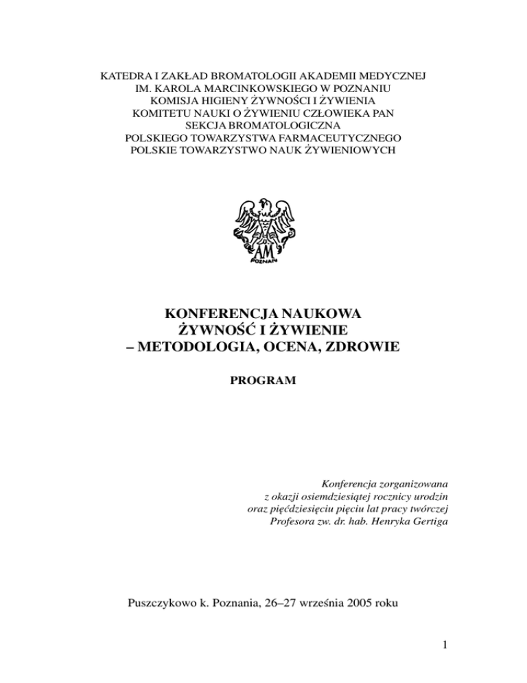 KATEDRA I ZAK£AD BROMATOLOGII AKADEMII MEDYCZNEJ IM. KAROLA MARCINKOWSKIEGO W POZNANIU KOMISJA HIGIENY ¯YWNOŒCI I ¯YWIENIA KOMITETU NAUKI O ¯YWIENIU CZ£OWIEKA PAN SEKCJA BROMATOLOGICZNA POLSKIEGO TOWARZYSTWA FARMACEUTYCZNEGO POLSKIE TOWARZYSTWO NAUK ¯YWIENIOWYCH KONFERENCJA NAUKOWA ¯YWNOŒÆ I ¯YWIENIE – METODOLOGIA, OCENA, ZDROWIE PROGRAM Konferencja zorganizowana z okazji osiemdziesi¹tej rocznicy urodzin oraz piêædziesiêciu piêciu lat pracy twórczej Profesora zw. dr. hab. Henryka Gertiga Puszczykowo k. Poznania, 26–27 wrzeœnia 2005 roku 1 KONFERENCJA NAUKOWA Pod honorowym patronatem JM Rektora Akademii Medycznej im. Karola Marcinkowskiego w Poznaniu Prof. dr. hab. Grzegorza H. Brêborowicza KOMITET HONOROWY Prof. dr hab. Grzegorz H. Brêborowicz Rektor AMiKM w Poznaniu Prof. dr hab. Zenon Kokot Dziekan Wydzia³u Farmaceutycznego AMiKM w Poznaniu Mgr Bogdan Poniedzia³ek Dyrektor Administracyjny AMiKM w Poznaniu KOMITET NAUKOWY Przewodnicz¹ca: Cz³onkowie: prof. dr hab. Regina Olêdzka dr hab. Jerzy Bertrandt prof. dr hab. Anna Brzozowska prof. dr hab. Jadwiga Charzewska prof. dr hab. Jan Gawêcki prof. dr hab. Anna Gronowska-Senger prof. dr hab. Marian Grzymis³awski prof. dr hab. Hanna Kunachowicz prof. AM dr hab. Jaros³aw Walkowiak prof. UM dr hab. Anna Wêdzisz prof. dr hab. Zofia Zachwieja KOMITET ORGANIZACYJNY Przewodnicz¹cy: prof. AM dr hab. Juliusz Przys³awski Wiceprzewodnicz¹ca: dr hab. Gra¿yna Duda Sekretarz: dr Izabela Boles³awska Skarbnik: dr Ma³gorzata Maruszewska Cz³onkowie: Pracownicy Katedry i Zak³adu Bromatologii AMiKM w Poznaniu 2 Szanowni Pañstwo, Fascynacja wp³ywem ¿ywnoœci i sposobu ¿ywienia na zdrowie cz³owieka trwa nieprzerwanie od wielu stuleci. Dopiero jednak odkrycia ostatnich kilkudziesiêciu lat z zakresu wartoœci od¿ywczej ¿ywnoœci, oceny sposobu i stanu od¿ywienia, fizjologii ¿ywienia oraz technologii ¿ywnoœci, przynios³y gwa³towny rozwój nauk ¿ywieniowych. W wymiarze epidemiologicznym znalaz³y potwierdzenie, pe³ne filozoficznej zadumy, s³owa wypowiedziane przez J. B. Shaw – „powiedz mi co jesz, a powiem Ci kim jesteœ”. Kiedy przed 10 laty, mia³em zaszczyt zaprosiæ Pañstwa do udzia³u w sympozjum, którego myœl¹ przewodni¹ by³y ¿ywieniowe aspekty profilaktyki chorób cywilizacyjnych, zamys³em by³o zorganizowanie spotkania integruj¹cego œrodowisko ¿ywieniowców polskich. Sympozjum to zorganizowano równie¿ dla upamiêtnienia 70 rocznicy urodzin oraz 45 lat dzia³alnoœci naukowej, dydaktycznej i wychowawczej prof. zw. dr. hab. Henryka Gertiga. ¯yczliwoœæ – jakiej doœwiadczyliœmy ze strony Pañstwa – uczestników tamtego sympozjum, sta³a siê zachêt¹ do zaproszenia Dostojnych Uczestników na kolejne spotkanie – po 10 latach – w celu wymiany doœwiadczeñ naukowych oraz prezentacji swoich osi¹gniêæ. Nie jest równie¿ tajemnic¹, ¿e 10 lat, to czas na kolejny jubileusz prof. dr. hab. Henryka Gertiga – tym razem 80. rocznicy urodzin i towarzysz¹cemu jej jubileuszowi 55 lat pracy twórczej. Tym razem zaproponowaliœmy Pañstwu spotkanie, któremu nadaliœmy tytu³: „¯ywnoœæ i ¿ywienie – metodologia, ocena, zdrowie”. W programie Konferencji przewidziano referaty plenarne zaproszonych Goœci – wybitnych specjalistów z dziedziny nauk ¿ywieniowych. G³êboko wierzê, ¿e aktywny udzia³ Pañstwa w tej Konferencji i jej program naukowy stworz¹ dobr¹ podstawê do wymiany pogl¹dów i opinii, pozwol¹ na prezentacjê w³asnych doœwiadczeñ oraz wypracowanie wniosków, u³atwiaj¹cych codzienn¹ pracê dietetyka, bromatologa, klinicysty, technologa ¿ywnoœci. Zorganizowanie Konferencji nie by³oby mo¿liwe bez pe³nego poœwiêceñ zaanga¿owania pracowników Katedry i Zak³adu Bromatologii AMiKM w Poznaniu. Niech mi bêdzie wolno z³o¿yæ serdeczne podziêkowanie moim najbli¿szym Wspó³pracownikom. Dziêkujê równie¿ W³adzom macierzystej Uczelni, Komitetowi Nauki o ¯ywieniu Cz³owieka PAN, Polskiemu Towarzystwu Farmaceutycznemu, Redakcji czasopisma Nowiny Lekarskie za okazan¹ pomoc przy organizacji tego spotkania. Dziêkujê tak¿e niewymienionym z nazwy firmom sponsoruj¹cym, których obecnoœæ dostrze¿ecie Pañstwo w trakcie trwania Konferencji. ¯yczê Pañstwu owocnych obrad oraz niezapomnianych wra¿eñ z pobytu w sercu Wielkopolskiego Parku Narodowego. Przewodnicz¹cy Komitetu Organizacyjnego Prof. AM dr hab. Juliusz Przys³awski Poznañ-Puszczykowo, 26–27 wrzeœnia 2005 roku 3 INFORMACJE OGÓLNE Miejsce obrad: Leœny Oœrodek Szkoleniowy ul. A. Wodziczki 3, 62-040 Puszczykowo tel. (61) 819 46 47, fax (61) 819 48 03 Sekretariat konferencji: 26.09. godz. 10.00 – 19.00 27.09. godz. 8.00 – 10.00 4 PROGRAM Poniedzia³ek 26.09.2005 r. 10.00 – 19.00 13.30 – 14.30 15.00 – 15.10 15.10 – 15.30 15.30 – 15.55 Rejestracja uczestników w miejscu obrad Obiad Uroczyste otwarcie konferencji Wyst¹pienie zaproszonych goœci Regina Olêdzka Prof. zw. dr hab. Henryk Gertig – wybitny bromatolog, dydaktyk i organizator 15.55 – 16.15 Dostojnemu Jubilatowi... 16.15 – 16.20 Przerwa 16.20 – 17.40 – Sesja plenarna I – Sala A Sesji przewodnicz¹: prof. dr hab. Jan Gawêcki prof. dr hab. Anna Brzozowska prof. dr hab. Regina Olêdzka 16.20 – 16.40 Jan Gawêcki Rola hipotezy w badaniach doœwiadczalnych 16.40 – 17.00 Anna Gronowska-Senger Normy ¿ywienia jako instrument oceny ¿ywienia 17.00 – 17.20 Ewa Babicz-Zieliñska Psychologiczne aspekty zachowañ ¿ywieniowych 17.20 – 17.40 Ma³gorzata Schlegel-Zawadzka Narzêdzia badawcze stosowane w bromatoi nutrigenomice 17.40 – 18.00 Przerwa 5 18.00 – 19.20 – Sesja plenarna II – Sala A Sesji przewodnicz¹: prof. dr hab. Hanna Kunachowicz prof. dr hab. Zofia Zachwieja prof. dr hab. Maria Wardas 18.00 – 18.20 Hanna Kunachowicz, Agata Troszczyñska ¯ywnoœæ wzbogacana oraz suplementy witaminowo-mineralne i ich rola w diecie 18.20 – 18.40 Wanda Baer-Dubowska Czynniki chemoprewencyjn