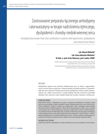14 Zastosowanie preparatu łączonego amlodypiny i atorwastatyny w terapii nadciśnienia tętniczego, dyslipidemii i choroby niedokrwiennej serca M. Wełnicki, A. Adamska-Wełnicka, A. Mamcarz Zastosowanie preparatu łączonego amlodypiny i atorwastatyny w terapii nadciśnienia tętniczego, dyslipidemii i choroby niedokrwiennej serca Amlodipine/atorvastatin fixed-dose combination in patients with hypertension, dyslipidaemia and coronary heart disease Lek. Marcin Wełnicki1 Lek. Anna Adamska-Wełnicka2 Dr hab. n. med. Artur Mamcarz, prof. nadzw. WUM1 1 III Klinika Chorób Wewnętrznych i Kardiologii, II Wydział Lekarski, Warszawski Uniwersytet Medyczny Kierownik Kliniki: dr hab. n. med. Artur Mamcarz, prof. nadzw. WUM 2 Klinika Chorób Wewnętrznych, Nefrologii i Dializoterapii, Wojskowy Instytut Medyczny w Warszawie Kierownik Kliniki: dr hab. n. med. Stanisław Niemczyk, prof. nadzw. WIM WSTĘP Nadciśnienie tętnicze oraz choroba niedokrwienna serca to jedne z najpoważniejszych wyzwań obecnej medycyny. Ostatnie dekady przyniosły przełom w farmakoterapii obu tych schorzeń. Pomimo powszechnej dostępności zarówno leków hipotensyjnych, jak i leków stosowanych w terapii stabilnej choroby wieńcowej przewlekły charakter tych schorzeń wciąż utrudnia skuteczne leczenie. Istotnym z praktyczne- STRESZCZENIE Nadciśnienie tętnicze i dyslipidemia to jedne z najczęściej stwierdzanych czynników ryzyka sercowo-naczyniowego, przede wszystkim choroby niedokrwiennej serca oraz chorób naczyniowo-mózgowych. Pacjenci stosujący leki hipotensyjne często wymagają równoczesnego stosowania leków hipolipemizujących. Wśród leków hipotensyjnych bardzo często, zarówno w monoterapii, jak i w terapii skojarzonej, stosuje się antagonistów wapnia. W terapii dyslipidemii podstawą leczenia farmakologicznego są statyny. Preparat łączony zawierający amlodypinę i atorwastatynę stanowi nową opcję terapeutyczną dla pacjentów z nadciśnieniem i współistniejącą dyslipidemią lub chorobą niedokrwienną serca. Autorzy artykułu przedstawiają najnowsze dane dotyczące bezpieczeństwa i efektów stosowania takiego skojarzenia leków. SŁOWA KLUCZOWE nadciśnienie tętnicze, dyslipidemia, choroba niedokrwienna serca, amlodypina, atorwastatyna Vol. 7/Nr 1(22)/2014 Zastosowanie preparatu łączonego amlodypiny i atorwastatyny w terapii nadciśnienia tętniczego, dyslipidemii i choroby niedokrwiennej serca M. Wełnicki, A. Adamska-Wełnicka, A. Mamcarz go punktu widzenia problemem są między innymi compliance i persistence – czyli kwestia przestrzegania zaleceń lekarskich oraz wytrwałości terapeutycznej chorych. Wielu pacjentów z nadciśnieniem tętniczym wymaga dwóch lub trzech leków hipotensyjnych [1]. Badania wskazują, iż stosowanie dwóch leków hipotensyjnych jest skuteczniejsze niż monoterapia podwojoną dawką leku [2]. Aktualne wytyczne zachęcają do stosowania preparatów złożonych, zawierających dwie lub trzy substancje w jednej tabletce [1]. Taki schemat terapii skojarzonej jest prostszy i bardziej przyjazny pacjentowi, przez co chętniej stosuje się on do zaleceń. Stosowanie leków łączonych zawierających inhibitor konwertazy angiotensyny lub sartan oraz diuretyk tiazydowy i/lub antagonistę wapnia staje się coraz powszechniejszą praktyką. Warto zauważyć, iż antagoniści wapnia, jedna z pięciu podstawowych grup leków hipotensyjnych, mogą być łączeni z przedstawicielami w zasadzie każdej z pozostałych czterech grup [1]. Antagonista wapnia może również, według aktualnych wytycznych, stanowić podstawowy lek hipotensyjny u pacjentów z nadciśnieniem tętniczym i współistniejącą bezobjawową miażdżycą oraz chorobą niedokrwienną serca [1]. Z kolei w przypadku pacjentów ze stabilną chorobą wieńcową podstawą farmakoterapii są kwas acetylosalicylowy, statyna, inhibitor konwertazy angiotensyny oraz, w przypadku pacjentów po ostrym zespole wieńcowym, β-adrenolityk [3]. Uwzględniwszy aktualne wytyczne dotyczące docelowego stężenia LDL u pacjentów z nadciśnieniem tętniczym oraz chorobą niedokrwienną serca, a także wytyczne dotyczące profilaktyki chorób układu sercowo-naczyniowego oraz wytyczne dotyczące postępowania w udarach mózgu, należy podkreślić, iż wielu pacjentów wymaga stosowania silnych statyn [1, 3–6]. W licznych przypadkach z uwagi na bardzo wysokie całkowite ryzyko sercowo-naczyniowe należy dążyć do redukcji stężenia LDL poniżej 70 mg/dl [3–6]. Osiągnięcie założeń terapeutycznych dotyczących wartości ciśnienia tętniczego i stężenia poszczególnych frakcji lipidogramu jest jednak trudne, jeśli nie niemożliwe, kiedy pacjent nie stosuje się do zaleceń lekarskich – zarówno tych dotyczących postępowania niefarmakologicznego, jak i farmakoterapii. Wśród nowych opcji farmakoterapii skojarzonej od kilku lat możliwe jest stosowanie preparatu zawierającego amlodypinę i atorwastatynę. Skuteczność obu tych leków w monoterapii odpowiednio nadciśnienia tętniczego i dyslipidemii została udowodniona w toku wielu badań klinicznych. Poniżej pokrótce opisujemy te, których wyniki w naszej opinii są dla obu cząsteczek kluczowe. AMLODYPINA W BADANIACH KLINICZNYCH Jednym z ważniejszych badań dotyczących amlodypiny w terapii nadciśnienia tętniczego było badanie ACCOMPLISH (Avoiding Cardiovascular events throught COM- ABSTRACT Arterial hypertension and dyslipidaemia are the more common cardiovascular risk factors, most of all risk factors of coronary arterial disease and cerebrovascular diseases. Many hypertension patients are also in need of dyslipidaemia treatment. As far as hypertension is concerned calcium blockers are one of the most often prescribed drugs. On the other hand, statins are the basis of dyslipidaemia treatment. Amlodipine/atorvastatin fixed-dose combination is new treatment option for patients with hypertension and coexistent dyslipidaemia or coro