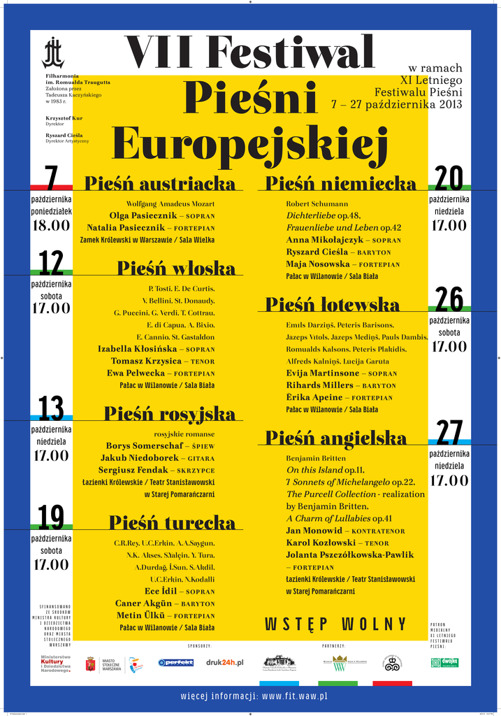 VII Festiwal Pieśni Europejskiej w ramach XI Letniego Festiwalu Pieśni 7 – 27 października 2013 Filharmonia im. Romualda Traugutta Założona przez Tadeusza Kaczyńskiego w 1983 r. Krzysztof Kur Dyrektor Ryszard Cieśla Dyrektor Artystyczny 7 października poniedziałek 18.00 12 października sobota 1 7.0 0 Pieśń austriacka Wolfgang Amadeus Mozart Olga Pasiecznik – sopran Natalia Pasiecznik – fortepian Zamek Królewski w Warszawie / Sala Wielka Pieśń włoska P. Tosti, E. De Curtis, V. Bellini, St. Donaudy, G. Puccini, G. Verdi, T. Cottrau, E. di Capua, A. Bixio, E. Cannio, St. Gastaldon Izabella Kłosińska – sopran Tomasz Krzysica – tenor Ewa Pelwecka – fortepian 13 października niedziela 17.00 19 października sobota 17.00 Pałac w Wilanowie / Sala Biała Pieśń rosyjska rosyjskie romanse Borys Somerschaf – śpiew Jakub Niedoborek – gitara Sergiusz Fendak – skrzypce Łazienki Królewskie / Teatr Stanisławowski w Starej Pomarańczarni Pieśń turecka C.R.Rey, U.C.Erkin, A.A.Saygun, N.K. Akses, S.Yalçin, Y. Tura, A.Durdağ, İ.Sun, S.Akdil, U.C.Erkin, N.Kodalli SFINANSOWANO ZE ŚRODKÓW MINISTRA KULTURY I DZIEDZICTWA NARODOWEGO ORAZ MIASTA STOŁECZNEGO WARSZAWY Ece İdil – sopran Caner Akgün – baryton Metin Ülkü – fortepian Pałac w Wilanowie / Sala Biała SPONSORZY: Pieśń niemiecka Robert Schumann Dichterliebe op.48, Frauenliebe und Leben op.42 Anna Mikołajczyk – sopran Ryszard Cieśla – baryton Maja Nosowska – fortepian Pałac w Wilanowie / Sala Biała Pieśń łotewska 20 października niedziela 17.00 26 października Emīls Dārziņš, Pēteris Barisons, sobota Jāzeps Vītols, Jāzeps Mediņš, Pauls Dambis, Romualds Kalsons, Pēteris Plakidis, 17.00 Alfrēds Kalniņš, Lūcija Garūta Evija Martinsone – sopran Rihards Millers – baryton Ērika Apeine – fortepian Pałac w Wilanowie / Sala Biała Pieśń angielska Benjamin Britten On this Island op.11; 7 Sonnets of Michelangelo op.22; The Purcell Collection - realization by Benjamin Britten; A Charm of Lullabies op.41 Jan Monowid – kontratenor Karol Kozłowski – tenor Jolanta Pszczółkowska-Pawlik – fortepian 27 października niedziela 1 7.0 0 Łazienki Królewskie / Teatr Stanisławowski w Starej Pomarańczarni WSTĘP WOLNY PARTNERZY: PATRON MEDIALNY XI LETNIEGO FESTIWALU PIEŚNI: więc ej infor ma c j i: w w w.fit.w aw.pl VII festiwal pieśni.indd 1 8/27/13 12:47 PM