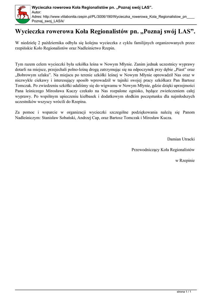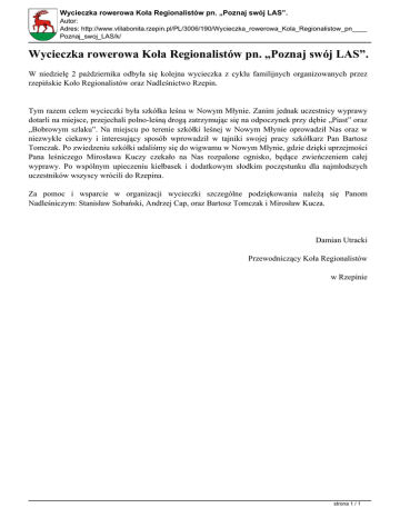 Wycieczka rowerowa Koła Regionalistów pn. „Poznaj swój LAS”. Autor: Adres: http://www.vlilabonita.rzepin.pl/PL/3006/190/Wycieczka_rowerowa_Kola_Regionalistow_pn____ Poznaj_swoj_LAS/k/ Wycieczka rowerowa Koła Regionalistów pn. „Poznaj swój LAS”. W niedzielę 2 października odbyła się kolejna wycieczka z cyklu familijnych organizowanych przez rzepińskie Koło Regionalistów oraz Nadleśnictwo Rzepin. Tym razem celem wycieczki była szkółka leśna w Nowym Młynie. Zanim jednak uczestnicy wyprawy dotarli na miejsce, przejechali polno-leśną drogą zatrzymując się na odpoczynek przy dębie „Piast” oraz „Bobrowym szlaku”. Na miejscu po terenie szkółki leśnej w Nowym Młynie oprowadził Nas oraz w niezwykle ciekawy i interesujący sposób wprowadził w tajniki swojej pracy szkółkarz Pan Bartosz Tomczak. Po zwiedzeniu szkółki udaliśmy się do wigwamu w Nowym Młynie, gdzie dzięki uprzejmości Pana leśniczego Mirosława Kuczy czekało na Nas rozpalone ognisko, będące zwieńczeniem całej wyprawy. Po wspólnym upieczeniu kiełbasek i dodatkowym słodkim poczęstunku dla najmłodszych uczestników wszyscy wrócili do Rzepina. Za pomoc i wsparcie w organizacji wycieczki szczególne podziękowania należą się Panom Nadleśniczym: Stanisław Sobański, Andrzej Cap, oraz Bartosz Tomczak i Mirosław Kucza. Damian Utracki Przewodniczący Koła Regionalistów w Rzepinie strona 1 / 1 Powered by TCPDF (www.tcpdf.org)