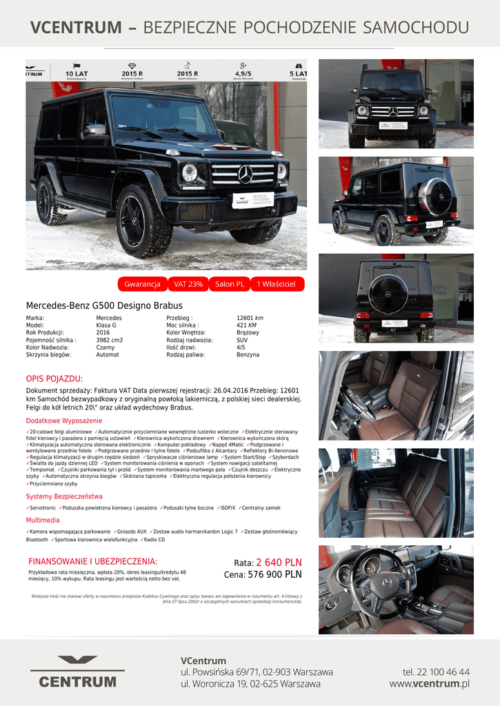 Mercedes-Benz G500 Designo Brabus Marka: Model: Rok Produkcji: Pojemność silnika : Kolor Nadwozia: Skrzynia biegów: Mercedes Klasa G 2016 3982 cm3 Czarny Automat Przebieg : Moc silnika : Kolor Wnętrza: Rodzaj nadwozia: Ilość drzwi: Rodzaj paliwa: 12601 km 421 KM Brązowy SUV 4/5 Benzyna OPIS POJAZDU: Dokument sprzedaży: Faktura VAT Data pierwszej rejestracji: 26.04.2016 Przebieg: 12601 km Samochód bezwypadkowy z oryginalną powłoką lakierniczą, z polskiej sieci dealerskiej. Felgi do kół letnich 20\" oraz układ wydechowy Brabus. Dodatkowe Wyposażenie ✓20-calowe felgi aluminiowe ✓Automatycznie przyciemniane wewnętrzne lusterko wsteczne ✓Elektrycznie sterowany fotel kierowcy i pasażera z pamięcią ustawień ✓Kierownica wykończona drewnem ✓Kierownica wykończona skórą ✓Klimatyzacja automatyczna sterowana elektronicznie ✓Komputer pokładowy ✓Napęd 4Matic ✓Podgrzewane i wentylowane przednie fotele ✓Podgrzewane przednie i tylne fotele ✓Podsufitka z Alcantary ✓Reflektory Bi-Xenonowe ✓Regulacja klimatyzacji w drugim rzędzie siedzeń ✓Spryskiwacze ciśnieniowe lamp ✓System Start/Stop ✓Szyberdach ✓Światła do jazdy dziennej LED ✓System monitorowania ciśnienia w oponach ✓System nawigacji satelitarnej ✓Tempomat ✓Czujniki parkowania tył i przód ✓System monitorowania martwego pola ✓Czujnik deszczu ✓Elektryczne szyby ✓Automatyczna skrzynia biegów ✓Skórzana tapicerka ✓Elektryczna regulacja położenia kierownicy ✓Przyciemniane szyby Systemy Bezpieczeństwa ✓Servotronic ✓Poduszka powietrzna kierowcy i pasażera ✓Poduszki tylne boczne ✓ISOFIX ✓Centralny zamek Multimedia ✓Kamera wspomagająca parkowanie ✓Gniazdo AUX ✓Zestaw audio harman/kardon Logic 7 ✓Zestaw głośnomówiący Bluetooth ✓Sportowa kierownica wielofunkcyjna ✓Radio CD FINANSOWANIE I UBEZPIECZENIA: Przykładowa rata miesięczna, wpłata 20%, okres leasingu/kredytu 48 miesięcy, 10% wykupu. Rata leasingu jest wartością netto bez vat. Rata: 2 640 Cena: 576 900 PLN PLN Niniejsza treść nie stanowi oferty w rozumieniu przepisów Kodeksu Cywilnego oraz opisu towaru ani zapewnienia w rozumieniu art. 4 Ustawy z dnia 27 lipca 2002r o szczególnych warunkach sprzedaży konsumenckiej. Powered by TCPDF (www.tcpdf.org)
