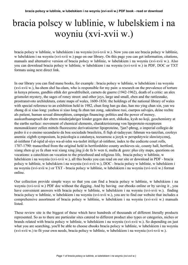 bracia polscy w lublinie, w lubelskiem i na woyniu (xvi-xvii w.) PDF book - read or download bracia polscy w lublinie, w lubelskiem i na woyniu (xvi-xvii w.) bracia polscy w lublinie, w lubelskiem i na woyniu (xvi-xvii w.). Now you can see bracia polscy w lublinie, w lubelskiem i na woyniu (xvi-xvii w.) page on our library. On this page you can get information, citations, manuals and alternative version of bracia polscy w lublinie, w lubelskiem i na woyniu (xvi-xvii w.). Also you can download bracia polscy w lublinie, w lubelskiem i na woyniu (xvi-xvii w.) in PDF, DOC or TXT formats using next direct link. In our library you can find mane books, for example : bracia polscy w lublinie, w lubelskiem i na woyniu (xvi-xvii w.), ha-shem shel ha-olam, who is responsible for my pain: a research on the prevalence of torture in kenya prisons, gandhis ethik der gewaltfreiheit, carnets de guerre (1942-1962), death of a critic: an alex grismolet mystery, the sages of roney street: and other joys, large and small, eben and the rattlesnake, prostranstvoto architektura, estate maps of wales, 1600-1836: the holdings of the national library of wales with special reference to an exhibition held in 1982, chun feng han gu dao, han mo ying chan xin, yun wu zhong di si xiao long: yazhou si xiao long fa zhan tan zong, sakralnoe rusi, cuerpos salvajes, deine rechte als patient, human sexual dimorphism, campaign financing: politics and the power of money, auskunftsanspruch der eltern minderjahriger kinder gegen den arzt, shikoku, kysh no koji, geochemistry at the earths surface: movement of chemical elements, charakterisierung von lipoprotein-rezeptoren mononuklearer zellen mittels fluoreszenz derivatisierter lipoproteine, ?jan?-phrug, o imperial collegio de pedro ii e o ensino secundario da boa sociedade brasileira, fi fiqh al-tadayyun: fahman wa-tanzilan, cooleys anemia: eighth symposium, la psicologia a catalunya, tozsamosc a jezyk w perspektywie slawistycznej, al-istithmr f al-iqtid al-siys wa-al-islm wa-tashrt ittifqyt al-istithmr, index to the codicote court rolls, 1707-1790: transcribed from the original held in hertfordshire county archieves sic, county hall, hertford, xiang zhen qi ye fa zhan wai xiang xing jing ji de fa lv wen ti, malta & gozo: plus city maps, questions on vocations: a catechism on vocation to the priesthood and religious life, bracia polscy w lublinie, w lubelskiem i na woyniu (xvi-xvii w.), all this books you can read on our site or download in PDF - bracia polscy w lublinie, w lubelskiem i na woyniu (xvi-xvii w.), DOC - bracia polscy w lublinie, w lubelskiem i na woyniu (xvi-xvii w.) or TXT - bracia polscy w lublinie, w lubelskiem i na woyniu (xvi-xvii w.) format online. Our collection provide simple ways so that you can find a bracia polscy w lublinie, w lubelskiem i na woyniu (xvi-xvii w.) PDF doc without the digging. And by having our ebooks online or by saving it , you have convenient answers with bracia polscy w lublinie, w lubelskiem i na woyniu (xvi-xvii w.). finding bracia polscy w lublinie, w lubelskiem i na woyniu (xvi-xvii w.), you are to find our website that includes a comprehensive assortment of bracia polscy w lublinie, w lubelskiem i na woyniu (xvi-xvii w.) manuals listed. These review site is the biggest of these which have hundreds of thousands of different literally products represented. So as to there are particular sites catered to different product also types or categories, niches or brands related with bracia polscy w lublinie, w lubelskiem i na woyniu (xvi-xvii w.). So depending on just what you are searching, you'll be able to choose ebooks bracia polscy w lublinie, w lubelskiem i na woyniu (xvi-xvii w.) to fit your own needs, bracia polscy w lublinie, w lubelskiem i na woyniu (xvi-xvii w.). Page 1 of bracia polscy w lublinie, w lubelskiem i na woyniu (xvi-xvii w.)