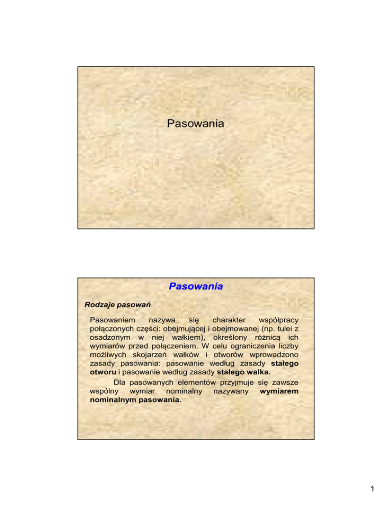 Pasowania Pasowania Rodzaje pasowań Pasowaniem nazywa się charakter współpracy połączonych części: obejmującej i obejmowanej (np. tulei z osadzonym w niej wałkiem), określony różnicą ich wymiarów przed połączeniem. W celu ograniczenia liczby możliwych skojarzeń wałków i otworów wprowadzono zasady pasowania: pasowanie według zasady stałego otworu i pasowanie według zasady stałego walka. Dla pasowanych elementów przyjmuje się zawsze wspólny wymiar nominalny nazywany wymiarem nominalnym pasowania. 1 Pasowania Rodzaje pasowań c.d. • Zasada stałego otworu charakteryzuje się tym, że odchyłka dolna otworu jest równa zeru (symbol H), • Zasada stałego wałka tym, że odchyłka górna wałka jest równa zeru (symbol h). Takie otwory i wałki nazywamy podstawowymi Pasowania Rodzaje pasowań c.d. Rozróżnia się trzy grupy pasowań: 1. Pasowanie luźne (ruchowe), w którym pomiędzy współpracującymi powierzchniami zawsze występuje luz zapewniający ruchową współpracę elementów. W granicznym przypadku luz może wynosić zero. 2. Pasowanie mieszane, w którym mogą wystąpić zarówno niewielkie luzy jak i niewielkie wciski, zwane luzami ujemnymi. 3. Pasowanie ciasne (spoczynkowe), w których występuje zawsze wcisk (ujemny luz). 2 Pasowania Rodzaje pasowań c.d. Przy wpisywaniu na rysunek tolerancji współ wymiaru nominalnego połączonych części można kożystać z jednej linii wymiarowej, przy czym: a) w przypadku tolerowania symbolowego - za wspólnym wymiarem nominalnym umieszcza się symbol pasowania składający się z symbolu tolerancji wymiaru wewnętrznego (otworu) i symbolu tolerancji wymiaru zewnętrznego (wałka), napisanych w postaci ułamka. Pasowania Rodzaje pasowań c.d. b) w przypadku tolerowania liczbowego tolerowany wymiar wewnętrzny pisze się nad linią wymiarową, a wymiar zewnętrzny pod nią, poprzedzając je wskazówkami, który wymiar której z połączonych części dotyczy (umieścić oznaczenia części). 3 Pasowania Objaśnienie zapisu pasowania Rodzaje pasowań wałka i otworu 4