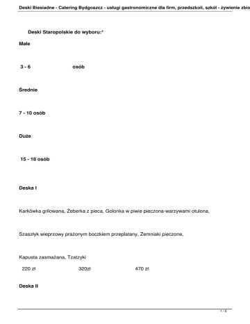 Deski Biesiadne - Catering Bydgoszcz - usługi gastronomiczne dla firm, przedszkoli, szkół - żywienie zbio Deski Staropolskie do wyboru:* Małe 3-6 osób Średnie 7 - 10 osób Duże 15 - 18 osób Deska I Karkówka grilowana, Żeberka z pieca, Golonka w piwie pieczona-warzywami otulona, Szaszłyk wieprzowy prażonym boczkiem przeplatany, Zemniaki pieczone, Kapusta zasmażana, Tzatzyki 220 zł 320zł 470 zł Deska II 1/6 Deski Biesiadne - Catering Bydgoszcz - usługi gastronomiczne dla firm, przedszkoli, szkół - żywienie zbio Karkówka grilowana, Żeberka z pieca, Golonka w piwie pieczona-warzywami otulona, Pałeczki z kurczaka łagodne aż głaskać się chce, Szaszłyk drobiowy hawajami pachnący, Ziemniaki pieczone, Kapusta zasmażana, Tzatzyki 220 zł 340 zł 480 zł Deska III Golonka w piwie pieczona-warzywami otulona, Szaszłyk wieprzowy prażonym boczkiem przeplatany, Pałeczki z kurczaka łagodne aż głaskać się chce, Kaszanka grilowana dymem pachnąca, Ziemniaki pieczone, Kapusta zasmażana, Tzatzyki 220 zł 350 zł 510 zł Deska IV Sakiewki z kurczaka nadziewane serem feta otulone boczkiem, Karkówka grilowana, Golonka w piwie pieczona-warzywami otulona, Szaszłyk wieprzowy prażonym boczkiem przeplatany, Szaszłyk drobiowy hawajami pachnący, 2/6 Deski Biesiadne - Catering Bydgoszcz - usługi gastronomiczne dla firm, przedszkoli, szkół - żywienie zbio Ziemniaki pieczone, Kapusta zasmażana, Tzatzyki 250 zł 370 zł 530 zł Deska V Golona w piwie pieczona-warzywami otulona, Szaszłyk drobiowy hawajami pachnący, Kotlet schabowy pieczarkami przyodziany, Kotlet drobiowy z brzoskiwnią podawany, Boczek z pieca, Ziemniaki pieczone, Kapusta zasmażana, Tzatzyki 230 zł 350 zł 510 zł Deska VI Kotlet schabowy pieczarkami przyodziany, Kotlet drobiowy z brzoskwinią podawany, Szaszłyk wieprzowy prażonym boczkiem przeplatany, Sakiewki z kurczaka nadziewane serem feta otulone boczkiem, Pałeczki z kurczaka pikantne aż język cierpnie, Boczek z pieca, Ziemniaki pieczone, Kapusta zasmażana, Tzatzyki 260 zł 380 zł 550 zł 3/6 Deski Biesiadne - Catering Bydgoszcz - usługi gastronomiczne dla firm, przedszkoli, szkół - żywienie zbio Deska VII Poledwiczki wieprzowe w boczek ubrane, Boczek z pieca, Kotlet de'Volaile, Kotlet szwajcarski, Żeberka z pieca, Schab teraz zdjęty z grila, Ziemniaki pieczone, Kapusta zasmażana, Tzatzyki 230 zł 350 zł 530 zł Deska VIII Golonka w piwie pieczona-warzywami otulona, Kotlet de'Volaile, Pałeczki z kurczaka pikantne aż język cierpnie, Żeberka z pieca, Ziemniaki pieczone, Kapusta zasmażana, Tzatzyki, Smalec firmowy 230 zł 330 zł 540 zł Deska wędlin Kiełbasa dębem pachnąca, Schab wędzony - przez nas parzony, Pasztet królewski, 4/6 Deski Biesiadne - Catering Bydgoszcz - usługi gastronomiczne dla firm, przedszkoli, szkół - żywienie zbio Salceson wyborny, Szynka wędzona - przez nas gotowana, Chrzan tarty z korzenia-aż kichać się chce, Musztarda gorczycą przyodziana 290 zł 400 zł 580 zł Pieczone prosię dymem pachnące z kaszą gryczaną i jabłkami na ognisku przyrządzane.... Chrzan tarty z korzenia-aż kichać się chce,Pieczone ziemniaki w ziołach kąpane w towarzystwie jabłek pieczonych ,Tzatzyki, Musztarda gorczycą przyodziana 10-20 kg 1000zł 5/6 Deski Biesiadne - Catering Bydgoszcz - usługi gastronomiczne dla firm, przedszkoli, szkół - żywienie zbior 20-30 kg 1200zł 30-60 kg 1500zł * Kaucja zwrotna za deskę 100zł 6/6
