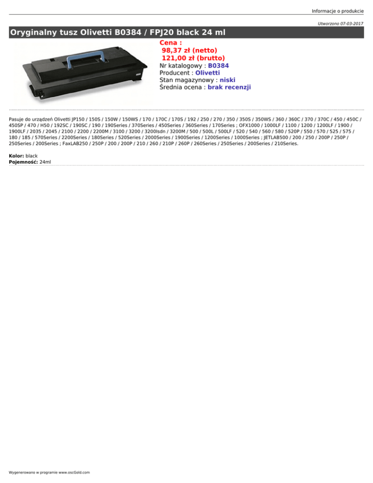 Informacje o produkcie Utworzono 07-03-2017 Oryginalny tusz Olivetti B0384 / FPJ20 black 24 ml Cena : 98,37 zł (netto) 121,00 zł (brutto) Nr katalogowy : B0384 Producent : Olivetti Stan magazynowy : niski Średnia ocena : brak recenzji Pasuje do urządzeń Olivetti JP150 / 150S / 150W / 150WS / 170 / 170C / 170S / 192 / 250 / 270 / 350 / 350S / 350WS / 360 / 360C / 370 / 370C / 450 / 450C / 450SP / 470 / H50 / 192SC / 190SC / 190 / 190Series / 370Series / 450Series / 360Series / 170Series ; OFX1000 / 1000LF / 1100 / 1200 / 1200LF / 1900 / 1900LF / 2035 / 2045 / 2100 / 2200 / 2200M / 3100 / 3200 / 3200Isdn / 3200M / 500 / 500L / 500LF / 520 / 540 / 560 / 580 / 520P / 550 / 570 / 525 / 575 / 180 / 185 / 570Series / 2200Series / 180Series / 520Series / 2000Series / 1900Series / 1200Series / 1000Series ; JETLAB500 / 200 / 250 / 200P / 250P / 250Series / 200Series ; FaxLAB250 / 250P / 200 / 200P / 210 / 260 / 210P / 260P / 260Series / 250Series / 200Series / 210Series. Kolor: black Pojemność: 24ml Wygenerowano w programie www.oscGold.com