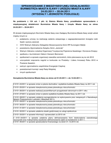 SPRAWOZDANIE Z MIĘDZYSESYJNEJ DZIAŁALNOŚCI BURMISTRZA MIASTA IŁAWY I URZĘDU MIASTA IŁAWY 24.03.2011 – 20.04.2011 (WYDZIAŁY I JEDNOSTKI PODLEGŁE) Na podstawie § 124 ust. 1 pkt. b) Statutu Miasta Iławy, przedkładam sprawozdanie z międzysesyjnej działalności Burmistrza Miasta Iławy i Urzędu Miasta Iławy za okres 24.03.2011 – 20.04.2011 W okresie międzysesyjnym Burmistrz Miasta Iławy oraz Zastępcy Burmistrza Miasta Iławy wzięli udział między innymi w: • podpisaniu umowy na realizację zadania związanego z zagospodarowaniem brzegów rzeki Iławki i jeziora Jeziorak • XXIV Walnym Zebraniu Delegatów Stowarzyszenia Gmin RP Euroregion Bałtyk • posiedzeniu Zgromadzenia Związku Gmin „Jeziorak” • Walnym Zebraniu Lokalnej Organizacji Turystycznej Pojezierza Iławskiego i Dorzecza Drwęcy • spotkaniu z burmistrzem Heborn Hansem Bennerem • spotkaniach w sprawie organizacji zawodów seniorskich, które planowane są na rok 2012 • uroczystości wręczenia nagród w konkursie na Produkty i Lidera Innowacji Roku 2010 w Powiecie Iławskim • walnym zgromadzeniu wspólników Energetyki Cieplnej • posiedzeniach komisji i sesji Rady Miejskiej • innych spotkaniach Zarządzenia Burmistrza Miasta Iławy za okres od 01.03.2011 r. do 12.04.2011 r. Z 0151-24/2011 w sprawie zmian w planie dochodów i wydatków budżetu Miasta Iławy na 2011 rok Z 0151-25/2011 w sprawie niewykonania prawa pierwokupu nieruchomości Z 0151-26/2011 w sprawie realizacji pozamilitarnych przygotowań obronnych w 2011 roku Z 0151-27/2011 w sprawie zmian w planie wydatków budżetu Miasta Iławy na 2011 rok Z 0151-28/2011 w sprawie ustalenia wynagrodzenia za wykonywanie prac związanych z Narodowym Spisem Powszechnym Ludności i Mieszkań 2011r. Z 0151-29/2011 w sprawie niewykonania prawa pierwokupu nieruchomości Z 0151-30/2011 w sprawie niewykonania prawa pierwokupu nieruchomości Z 0151-31/2011 w sprawie niewykonania prawa pierwokupu nieruchomości Z 0151-32/2011 w sprawie ustalenia stawki godzinowej za usługi opiekuńcze Z 0151-33/2011 w sprawie informacji i sprawozdań za 2010 rok Z 0151-34/2011 w sprawie ustalenia planu dofinansowania form doskonalenia zawodowego nauczycieli oraz maksymalnej wysokości dofinansowania opłat za kształcenie w 2011 r. Z 0151-35/2011 w sprawie sprawozdania finansowego na dzień 31.12.2010 rok Z 0151-36/2011 w sprawie zmian w planie wydatków budżetu Miasta Iławy na 2011 rok Z 0151-37/2011 w sprawie zatwierdzenia sprawozdania finansowego Miejskiej Biblioteki Publicznej w Iławie za rok 2010 Z 0151-38/2011 w sprawie ustalenia stawek odpłatności osób zakwalifikowanych do korzystania z obiadów świadczonych przez Miejski Ośrodek Pomocy Społecznej w Iławie Z 0151-39/2011 w sprawie przetargu ograniczonego na zbycie nieruchomości gruntowej położonej w Iławie przy ul. Długiej, oznaczonej w ewidencji gruntów i budynków m. Iławy w obrębie 7 jako działka Nr 66 Z 0151-40/2011 w sprawie przetargu ograniczonego na zbycie nieruchomości gruntowej położonej w Iławie przy ul. Długiej, oznaczonej w ewidencji gruntów i budynków m. Iławy w obrębie 7 jako działka Nr 51/1 Z 0151-41/2011 w sprawie określenia zasad przygotowywania projektów arkuszy organizacyjnych dla szkół podstawowych, gimnazjów i przedszkoli prowadzonych przez Gminę Miejską Iława na rok szkolny 2011/2012 Z 0151-42/2011 w sprawie rozdysponowania rezerwy celowej w budżecie miasta Iławy na 2011 rok Wydział Organizacyjno-Obywatelski Ogłoszenia przetargów: • Postępowanie znak OO.3410-11/11 na budowę drogi dojazdowej do kompleksu sportowego ul. Sienkiewicza w Iławie Rozstrzygnięcia przetargów: • Postępowanie znak OO.3410-10/11 na pielęgnację i wycinka drzew rosnących na terenie miasta Iławy • Postępowanie znak OO.3410-9/11 na utrzymanie czystości i porządku na terenie miasta Iławy • Postępowanie znak OO.3410-7/11 na utrzymanie i konserwację zieleni komunalnej na terenie miasta Iławy - sektory: I, II, III, IV, V Biuro Rady Miejskiej: W okresie sprawozdawczym odbyło się posiedzenie Komisji Rozwoju Gospodarczego, Budżetu i Finansów (28.03.2011), posiedzenie Komisji Problematyki Społecznej (24.03.2011), posiedzenie Komisji Oświaty, Kultury, Sportu i Turystyki (25.03.2011) oraz zwykłe posiedzenie członków Komisji Rewizyjnej (13.04.2011). Dodatkowo, 19.04.2011r. odbyło się posiedzenie Komisji Doraźnej do Spraw Opracowania Zmian w Statucie Miasta Iławy. VII Sesja Rady Miejskiej z dnia 30 marca 2011 roku – podjęto uchwały w sprawie: • VII/59/11 – zmian w Wieloletniej Prognozie Finansowej miasta na lata 2011-2029; przekazano: Skarbnik Miasta • VII/60/11 – zmian w budżecie miasta na 2011rok; przekazano: Skarbnik Miasta • VII/61/11 – dzierżawy nieruchomości stanowiących własność Gminy Miejskiej ława; przekazano: Kierownik GMK • VII/62/11 – dzierżawy gruntów stanowiących własność Gminy Miejskiej Iława; przekazano: Kierownik GMK • VII/63/11 – zasad udzielania, trybu postępowania oraz rozliczania dotacji celowej na inwestycje związane z wymianą i likwidacją pokryć dachowych lub elewacji zawierających azbest z budynków położonych na terenie miasta Iławy; przekazano: Inspektor ds. Ochrony Środowiska • VII/64/11 - zmiany uchwały w sprawie ustalenia opłat za zajęcie pasa drogowego; przekazano: Kierownik BU • VII/65/11 - skargi z dnia 2 marca 2011 roku złożonej przez Magdalenę i Andrzeja Abramowicz oraz Adama Barwińskiego jako przedstawicieli 28 osób na Uchwałę Nr IV/30/11 Rady Miejskiej w Iławie w sprawie miejscowego planu zagospodarowania przestrzennego całego obszaru miasta Iławy; a/a • VII/66/11 – udzielenia pomocy finansowej Powiatowi Iławskiemu na prowadzenie zajęć rekreacyjno – sportowych dla dzieci i młodzieży w zakresie żeglarstwa; przekazano: Skarbnik Miasta • VII/67/11 – dzierżawy nieruchomości położonej przy ul. Sienkiewicza; przekazano: Kierownik GMK Wyd