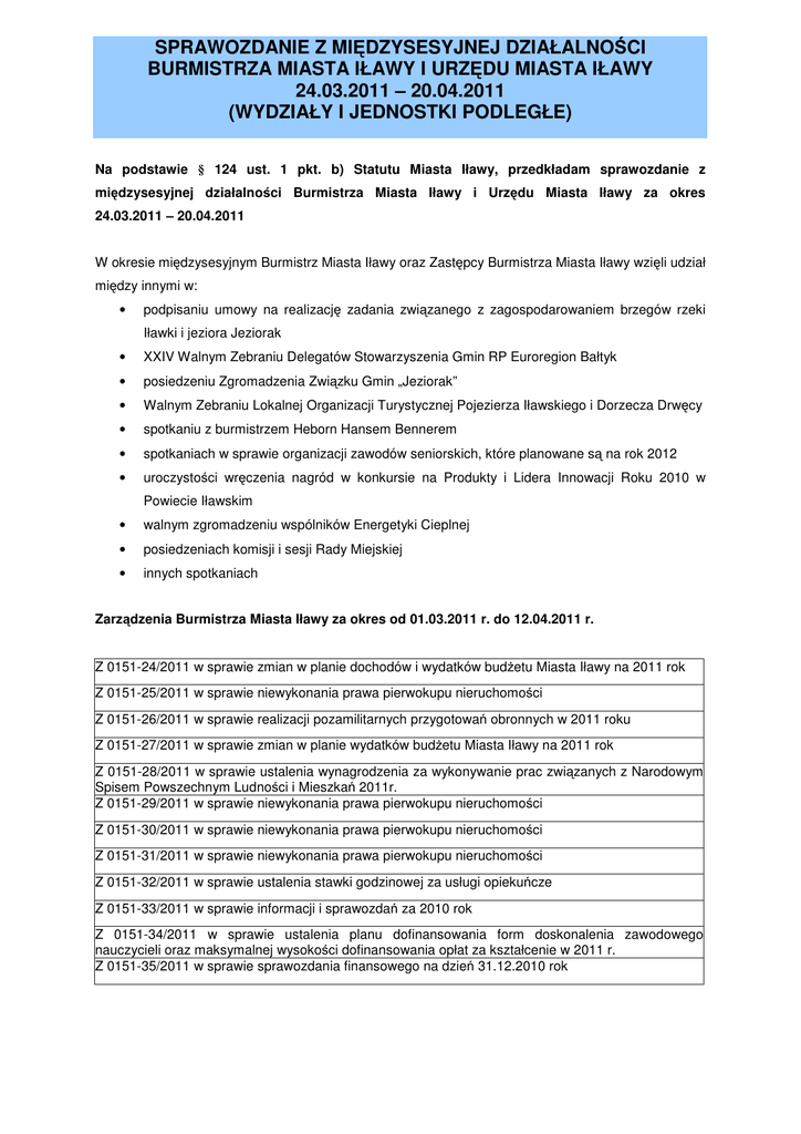 sprawozdanie z międzysesyjnej działalności burmistrza miasta iławy