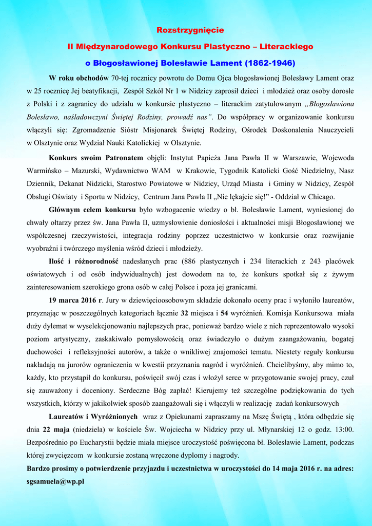 Rozstrzygnięcie II Międzynarodowego Konkursu Plastyczno – Literackiego o Błogosławionej Bolesławie Lament (1862-1946) W roku obchodów 70-tej rocznicy powrotu do Domu Ojca błogosławionej Bolesławy Lament oraz w 25 rocznicę Jej beatyfikacji, Zespół Szkół Nr 1 w Nidzicy zaprosił dzieci i młodzież oraz osoby dorosłe z Polski i z zagranicy do udziału w konkursie plastyczno – literackim zatytułowanym „Błogosławiona Bolesławo, naśladowczyni Świętej Rodziny, prowadź nas”. Do współpracy w organizowanie konkursu włączyli się: Zgromadzenie Sióstr Misjonarek Świętej Rodziny, Ośrodek Doskonalenia Nauczycieli w Olsztynie oraz Wydział Nauki Katolickiej w Olsztynie. Konkurs swoim Patronatem objęli: Instytut Papieża Jana Pawła II w Warszawie, Wojewoda Warmińsko – Mazurski, Wydawnictwo WAM w Krakowie, Tygodnik Katolicki Gość Niedzielny, Nasz Dziennik, Dekanat Nidzicki, Starostwo Powiatowe w Nidzicy, Urząd Miasta i Gminy w Nidzicy, Zespół Obsługi Oświaty i Sportu w Nidzicy, Centrum Jana Pawła II „Nie lękajcie się!” - Oddział w Chicago. Głównym celem konkursu było wzbogacenie wiedzy o bł. Bolesławie Lament, wyniesionej do chwały ołtarzy przez św. Jana Pawła II, uzmysłowienie doniosłości i aktualności misji Błogosławionej we współczesnej rzeczywistości, integracja rodziny poprzez uczestnictwo w konkursie oraz rozwijanie wyobraźni i twórczego myślenia wśród dzieci i młodzieży. Ilość i różnorodność nadesłanych prac (886 plastycznych i 234 literackich z 243 placówek oświatowych i od osób indywidualnych) jest dowodem na to, że konkurs spotkał się z żywym zainteresowaniem szerokiego grona osób w całej Polsce i poza jej granicami. 19 marca 2016 r. Jury w dziewięcioosobowym składzie dokonało oceny prac i wyłoniło laureatów, przyznając w poszczególnych kategoriach łącznie 32 miejsca i 54 wyróżnień. Komisja Konkursowa miała duży dylemat w wyselekcjonowaniu najlepszych prac, ponieważ bardzo wiele z nich reprezentowało wysoki poziom artystyczny, zaskakiwało pomysłowością oraz świadczyło o dużym zaangażowaniu, bogatej duchowości i refleksyjności autorów, a także o wnikliwej znajomości tematu. Niestety reguły konkursu nakładają na jurorów ograniczenia w kwestii przyznania nagród i wyróżnień. Chcielibyśmy, aby mimo to, każdy, kto przystąpił do konkursu, poświęcił swój czas i włożył serce w przygotowanie swojej pracy, czuł się zauważony i doceniony. Serdeczne Bóg zapłać! Kierujemy też szczególne podziękowania do tych wszystkich, którzy w jakikolwiek sposób zaangażowali się i włączyli w realizację zadań konkursowych Laureatów i Wyróżnionych wraz z Opiekunami zapraszamy na Mszę Świętą , która odbędzie się dnia 22 maja (niedziela) w kościele Św. Wojciecha w Nidzicy przy ul. Młynarskiej 12 o godz. 13:00. Bezpośrednio po Eucharystii będzie miała miejsce uroczystość poświęcona bł. Bolesławie Lament, podczas której zwycięzcom w konkursie zostaną wręczone dyplomy i nagrody. Bardzo prosimy o potwierdzenie przyjazdu i uczestnictwa w uroczystości do 14 maja 2016 r. na adres: [email protected] Zwycięzcami II Międzynarodowego Konkursu Plastyczno - Literackiego „Błogosławiona Bolesławo, naśladowczyni Świętej Rodziny prowadź nas” zostali: KATEGORIA LITERACKA Grupa III - od 12 do 14 lat I m.- Alicja Stypułkowska, Gimnazjum w Białymstoku, op. s. Anna Andraka II m. – Alicja Kacprzyk, Szkoła Podstawowa Nr 6 w Kwidzynie, op. Anna Kowalczyk III m.–Władysława Bazgijewa, Szkoła Odrodzenia Narodowego w Pawłodarze, Kazachstan III m. – Dominika Sztonyk, Zespół Szkół Nr 34 w Toruniu, op. Maria Wrzesińska Wyróżnienia: 1. Parick Wac, Szkoła Akademii Języka Polskiego w Manchester, NJ, USA, op. Marta Kirkicka 2. Karolina Brydak, Gimnazjum Nr 9 w Rzeszowie, op. Anna Dec 3. Maja Góralewska, Zespół Szkół Publicznych Nr 3 w Żyrardowie, op. Janina Krawat 4. Jan Zardzewiały, Szkoła Podstawowa Nr 6 w Kwidzynie, op. Anna Kowalczyk 5. Gabriela Głogowska, Szkoła Podstawowa Nr 8 w Kielcach, op. Agnieszka Nowińska Grupa IV - od 15 do 17 lat I m. - Agnieszka Krawczyk, Zespół Szkół Publicznych w Osuchowie, op. Elżbieta Olborska II m. – Maria Matanowska, I Liceum Ogólnokształcące w Kętrzynie, op. s. Krystyna Niewińska III m.- Kamila Dybeł, Zespół Placówek Oświatowych w Krzywaczce, op. Maciej Matoga III m.- Maria Majewska, Gimnazjum Nr 3 w Nidzicy, op. Eliżbieta Skwarska Wyróżnienia: 1. Anna Szwyngiel, Zespół Szkół w Konopiskach, op. Izabela Stanisz 2. Klaudia Ogonowska, Gimnazjum Nr 1 w Lidzbarku Warmińskim, op. ks. Adrian Bienarz 3. Klaudia Dalicka, Zespół Szkół w Kątach, op. Zofia Mechacka 4. Marta Włodarska, Zespół Szkół w Kątach, op. Zofia Mechacka 5. Justyna Woźna, Zespół Szkół Zawodowych i Ogólnokształcących w Nidzicy, op. Lech Borucki Grupa V – powyżej 17 lat I m.- Kamila Malicka, Nauczyciel Publicznej Szkoły Podstawowej Nr 20 w Opolu II m.- Renata Leś, Manchester, NJ, USA III m.- Ewa Tomczak, Łowicz III m. - Anna Jurewicz, Uniwersytet Warmińsko Mazurski w Olsztynie Wyróżnienia: 1. Katarzyna Wac, Szkoła Akademii Języka Polskiego w Manchester, NJ, USA, op. Marta Kirkicka 2. Małgorzata Starczyk, Zespół Szkolno-Gimnazjalny Nr 5 w Radomsku 3. Wiktoria Pawlak, Liceum Ogólnokształcące Nr 2, Głogów, op. Danuta Piwowar 4. Mariusz Kilianek, Zasadnicza Szkoła Zawodowa Nr 8 w Kielcach, op. Anna Stefańska 5. Karina Górska, Zasadnicza Szkoła Zawodowa Nr 8 w Kielcach, op. Irena Górczak KATEGORIA PLASTYCZNA Grupa I - od 6 do 8 lat I m.- Anna Kotyczka, Zespół Szkolno-Przedszkolny w Gminie Ornontowicach, op. Agnieszka Gorzawska II m. - Mateusz Lasek, Szkoła Podstawowa Nr 3 w Kłodzku, op. Małgorzata Mokrzycka III m.- Zuzanna Kirkicka, Szkoła Akademii Języka Polskiego, Manchester, NJ, USA, op. Marta Kirkicka III m. – Celina Michalak, Zespół Szkół w Jedwabnie,