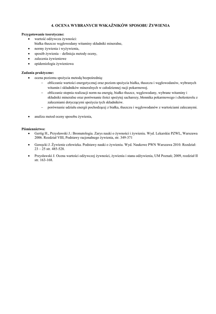 4. OCENA WYBRANYCH WSKAŹNIKÓW SPOSOBU ŻYWIENIA Przygotowanie teoretyczne: wartość odżywcza żywności: białka tłuszcze węglowodany witaminy składniki mineralne, normy żywienia i wyżywienia, sposób żywienia – definicja metody oceny, zalecenia żywieniowe epidemiologia żywieniowa Zadania praktyczne: ocena poziomu spożycia metodą bezpośrednią: obliczanie wartości energetycznej oraz poziom spożycia białka, tłuszczu i węglowodanów, wybranych witamin i składników mineralnych w całodziennej racji pokarmowej. obliczanie stopnia realizacji norm na energię, białko tłuszcz, węglowodany, wybrane witaminy i składniki mineralne oraz porównanie ilości spożytej sacharozy, błonnika pokarmowego i cholesterolu z zaleceniami dotyczącymi spożycia tych składników. porównanie udziału energii pochodzącej z białka, tłuszczu i węglowodanów z wartościami zalecanymi. analiza metod oceny sposobu żywienia, Piśmiennictwo: Gertig H., Przysławski J.: Bromatologia. Zarys nauki o żywności i żywieniu. Wyd. Lekarskie PZWL, Warszawa 2006. Rozdział VIII, Podstawy racjonalnego żywienia, str. 349-371 Gawęcki J. Żywienie człowieka. Podstawy nauki o żywieniu. Wyd. Naukowe PWN Warszawa 2010. Rozdział: 23 – 25 str. 485-528. Przysławski J. Ocena wartości odżywczej żywności, żywienia i stanu odżywienia, UM Poznań; 2009, rozdział II str. 163-168.