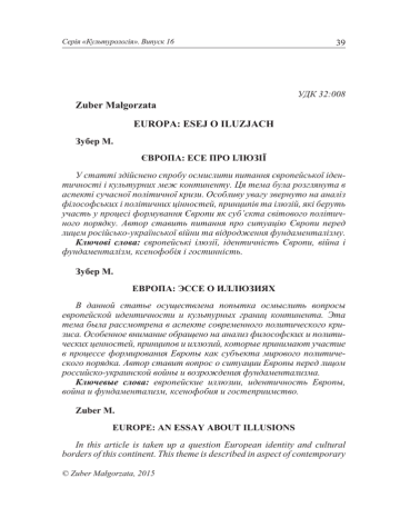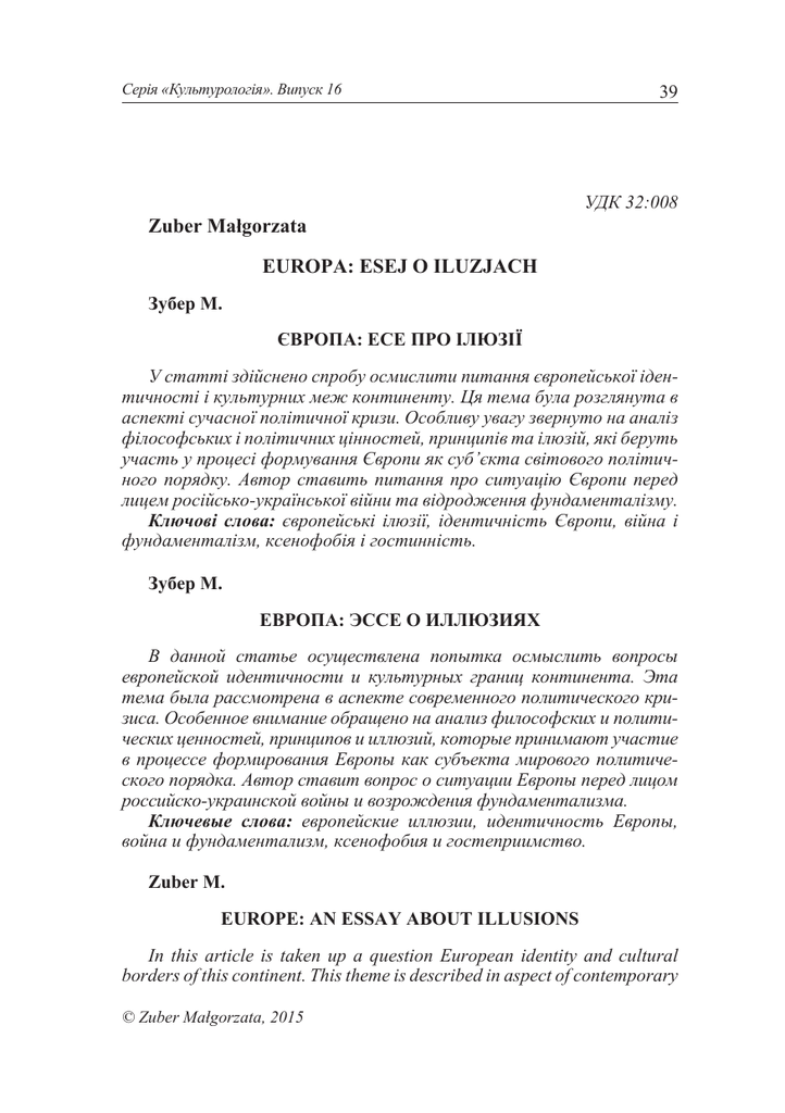 Серія «Культурологія». Випуск 16 Zuber Małgorzata 39 УДК 32:008 Europa: esej o iluzjach Зубер М. Європа: есе про ілюзії У статті здійснено спробу осмислити питання європейської ідентичності і культурних меж континенту. Ця тема була розглянута в аспекті сучасної політичної кризи. Особливу увагу звернуто на аналіз філософських і політичних цінностей, принципів та ілюзій, які беруть участь у процесі формування Європи як суб’єкта світового політичного порядку. Автор ставить питання про ситуацію Європи перед лицем російсько-української війни та відродження фундаменталізму. Ключові слова: європейські ілюзії, ідентичність Європи, війна і фундаменталізм, ксенофобія і гостинність. Зубер М. Европа: эссе о иллюзиях В данной статье осуществлена попытка осмыслить вопросы европейской идентичности и культурных границ континента. Эта тема была рассмотрена в аспекте современного политического кризиса. Особенное внимание обращено на анализ философских и политических ценностей, принципов и иллюзий, которые принимают участие в процессе формирования Европы как субъекта мирового политического порядка. Автор ставит вопрос о ситуации Европы перед лицом российско-украинской войны и возрождения фундаментализма. Ключевые слова: европейские иллюзии, идентичность Европы, война и фундаментализм, ксенофобия и гостеприимство. Zuber М. Europe: an essay about illusions In this article is taken up a question European identity and cultural borders of this continent. This theme is described in aspect of contemporary © Zuber Małgorzata, 2015 Наукові записки Національного університету «Острозька академія». 40 political crisis. Special attention is directed to analyze philosophical and political values, principles and illusions, which took a part in the process of forming Europe as the subject of world’s political deal. The author asked about European condition in connection with Russian-Ukrainian war and renaissance of fundamentalism. Key words: European illusions, borders, European identnty, war and fundamentalism, xenophobia and hospitality. Naturalnie zachodnim Europejczykom trudniej niż wschodnim pożegnać się z iluzją, jakoby byli nosicielami lub reprezentantami wartości uniwersalnych. Są tylko częścią całości, tą, która przez historyczny przypadek lepiej trafiła – i nic ponadto. Karl Schlögel, Bezradność jako szansa1 To nieprawda, że Europa jest złudzeniem, to prawda, że jest kształtem trudnej wierności, gorzkim, ale jedynym sensem naszego życia. Tymon Terlecki, Zaproszenie do podróży2 Doprawdy nie można być pewnym granic – kiedy rozdzielą, a kiedy połączą. Karolina Pawlik, w prywatnym liście 1. W Europie niemal nikt nie jest u siebie bardziej niż inny. Za wy jątkiem Basków nie ma tutaj aborygenów. Ani odgrzebywana wraz z fragmentami skorup metryka ginącej w mitach osiadłości, ani najdum niejsze trwanie na niewzruszonych rubieżach, ani nawet kodeksy naj światlejszych praw nie mogą nikomu z nas – żadnemu narodowi lub społeczności – pozwolić czuć się bardziej Europejczykami, Europejczy kami lepszymi i bardziej europejskimi od pozostałych. Europa, w jakiej żyjemy dzisiaj i jaką znamy z kart dziejów jest produktem nieustannej dynamiki dopływów i odpływów rozmaitych ludów. Jest organizmem, którego życie toczy się zgodnie z nurtem tych napływów i odpływów, kształtowane przez wojny, epidemie, klęski głodu, osadnictwo i wę drówki. Wszyscy jesteśmy w Europie przybyszami, nawet jeśli nosimy Karl Schlögel, Bezradność jako szansa, w: Idem, Środek leży na wschodzie. Europa w stadium przejściowym, przeł. Andrzej Kopacki, Oficyna Naukowa, Warszawa 2005, s. 227-228. 2 Tymon, Terlecki, Zaproszenie do podróży, Wydawnictwo Słowo Obraz Terytoria, Gdańsk 2006, cyt za wersją dźwiękową książki, Zakład Wydawnictw i nagrań Polskiego Związku Niewidomych, Warszawa 2007, odc. 41., min.: 11:45-11:55. 1 Серія «Культурологія». Випуск 16 41 w sobie genetyczny substrat Staroeuropejczyków, jesteśmy wypadkową nawarstwiania się kultur, wielokrotnych zmian tożsamości, języka i re ligii naszych przodków. Europa była i jest otwarta, nie stawiała i nie stawia oporu ekspansji. Bezbrzeżny step otwierał Stary Kontynent na Azję, z której przez wieki ściągały fale zidentyfikowanych twórców Europy, jaką znamy: wpierw Indoeuropejczyków, potem Hunów, Węgrów, Bułgarów, Połowców... Morze Śródziemne zapraszało Fenicjan, a po kilku tysiącleciach – Ara bów. Bez tej otwartości, wbrew czcicielom czystości rasy i cywilizacji,3 nie byłoby ani Grecji4, ani Rzymu, a pod niebem umiarkowanych szerokości geograficznych dźwięczałyby zupełnie inne języki. Europa trwała przez wieki w napięciu między osiadłymi a przybyszami, ksenofobią i gościn nością, zadomowieniem a wędrowaniem, wrogości