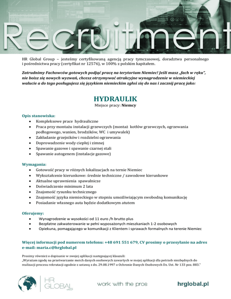 HR Global Group – jesteśmy certyfikowaną agencją pracy tymczasowej, doradztwa personalnego i pośrednictwa pracy (certyfikat nr 12576), w 100% z polskim kapitałem. Zatrudnimy Fachowców gotowych podjąć pracę na terytorium Niemiec! Jeśli masz „fach w ręku”, nie boisz się nowych wyzwań, chcesz otrzymywać atrakcyjne wynagrodzenie w niemieckiej walucie a do tego posługujesz się językiem niemieckim zgłoś się do nas i zacznij pracę jako: HYDRAULIK Miejsce pracy: Niemcy Opis stanowiska: Kompleksowe prace hydrauliczne Praca przy montażu instalacji grzewczych (montaż kotłów grzewczych, ogrzewania podłogowego, wanien, brodzików, WC i umywalek) Zakładanie grzejników i rozdzielni ogrzewania Doprowadzenie wody ciepłej i zimnej Spawanie gazowe i spawanie czarnej stali Spawanie autogenem (instalacje gazowe) Wymagania: Gotowość pracy w różnych lokalizacjach na ternie Niemiec Wykształcenie kierunkowe: średnie techniczne / zawodowe kierunkowe Aktualne uprawnienia spawalnicze Doświadczenie minimum 2 lata Znajomość rysunku technicznego Znajomość języka niemieckiego w stopniu umożliwiającym swobodną komunikację Posiadanie własnego auta będzie dodatkowym atutem Oferujemy: Wynagrodzenie w wysokości od 11 euro /h brutto plus Bezpłatne zakwaterowanie w pełni wyposażonych mieszkaniach 1-2 osobowych Opiekuna, pomagającego w komunikacji z Klientem i sprawach formalnych na terenie Niemiec Więcej informacji pod numerem telefonu: +48 691 551 679, CV prosimy o przesyłanie na adres e-mail: [email protected] Prosimy również o dopisanie w swojej aplikacji następującej klauzuli: „Wyrażam zgodę na przetwarzanie moich danych osobowych zawartych w mojej aplikacji dla potrzeb niezbędnych do realizacji procesu rekrutacji zgodnie z ustawą z dn. 29.08.1997 o Ochronie Danych Osobowych Dz. Ust. Nr 133 poz. 883.”