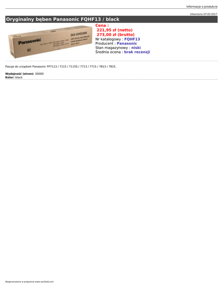 Informacje o produkcie Utworzono 07-03-2017 Oryginalny bęben Panasonic FQHF13 / black Cena : 221,95 zł (netto) 273,00 zł (brutto) Nr katalogowy : FQHF13 Producent : Panasonic Stan magazynowy : niski Średnia ocena : brak recenzji Pasuje do urządzeń Panasonic FP7113 / 7115 / 7115S / 7713 / 7715 / 7813 / 7815. Wydajność (stron): 30000 Kolor: black Wygenerowano w programie www.oscGold.com