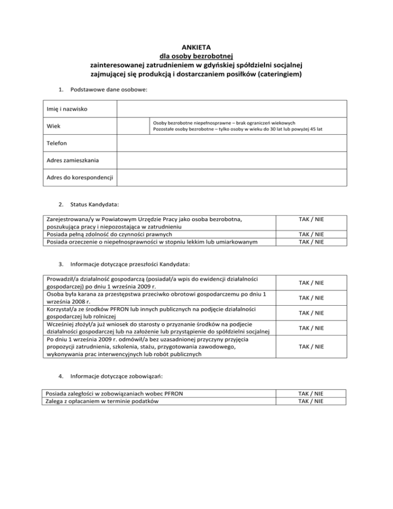 ANKIETA dla osoby bezrobotnej zainteresowanej zatrudnieniem w