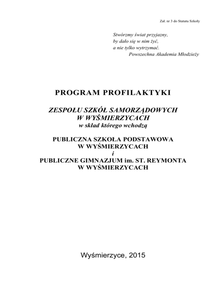 Zał. nr 3 do Statutu Szkoły Stwórzmy świat przyjazny, by dało się w nim żyć, a nie tylko wytrzymać. Powszechna Akademia Młodzieży PROGRAM PROFILAKTYKI ZESPOŁU SZKÓŁ SAMORZĄDOWYCH W WYŚMIERZYCACH w skład którego wchodzą PUBLICZNA SZKOŁA PODSTAWOWA W WYŚMIERZYCACH i PUBLICZNE GIMNAZJUM im. ST. REYMONTA W WYŚMIERZYCACH Wyśmierzyce, 2015 SPIS TREŚCI Wprowadzenie ............................................................................................................. .................................. 3 1. Podstawa prawna programu........................................................................................................................... 3 2. Cele i zadania programu profilaktyki............................................................................................................. 3 3. Potrzeby rozwojowe uczniów......................................................................................................................... 4 4. Diagnoza problemów - zagrożenia dla dzieci i ich rodzin............................................................................ 5 5. Plan realizacji działań..................................................................................................................................... 6 6. Obowiązki osób odpowiedzialnych za realizację programu profilaktyki...................................................... 11 7. Instytucje wspierające szkołę w działaniach profilaktycznych...................................................................... 12 8. Ewaluacja programu....................................................................................................................................... 13 9. Literatura........................................................................................................................................................ 13 Załączniki 2/14/ WPROWADZENIE Specyfika czasów, w których żyjemy, to przyspieszone tempo przemian, nie zawsze harmonijnych. Zwiększyła się liczba czynników destrukcyjnych oddziałujących na dzieci i młodzież, nie mających w pełni jeszcze ukształtowanej hierarchii wartości, stojących wobec wyborów i decyzji bardzo złożonych i skomplikowanych. Skutkiem czego stale wzrasta liczba osób przejawiających dysfunkcje rozwojowe oraz poszukujących wsparcia w trudnych sytuacjach życiowych. Aby przeciwdziałać temu zjawisku, konieczne jest podejmowanie na terenie szkoły wielopoziomowych działań profilaktycznych gdyż: szkoła wypełnia znaczną część aktywnego życia dzieci i młodzieży, szkoła jest miejscem intensywnego rozwoju w zakresie funkcjonowania interpersonalnego i społecznego w grupie rówieśniczej, szkoła jest miejscem działalności zadaniowej uczniów, a wiec ujawnia lub wręcz wyzwala trudności dzieci i młodzieży związane z przyjmowaniem odpowiedzialności za własne życie, szkoła jest miejscem konfrontacji autorytetów i kształtowania się poczucia własnej tożsamości ucznia, szkoła pozwala na łatwy dostęp do środowiska dzieci i młodzieży i sprawną organizację prowadzonych oddziaływań. Szkolny program profilaktyki to program profilaktyki środowiskowej, to znaczy taki, w którym obiektem działań jest całe środowisko szkolne - uczniowie, rodzice i opiekunowie, nauczyciele, instytucje wspomagające szkołę w tych działaniach: Komenda Powiatowa Policji, Poradnia Psychologiczno – Pedagogiczna, Powiatowe Centrum Pomocy Rodzinie, Miejsko – Gminny Ośrodek Pomocy Społecznej, kościół, SANEPID, Zespół Opieki Zdrowotnej.... Profilaktyka to proces, który wspiera zdrowie przez umożliwienie ludziom uzyskania pomocy potrzebnej im do konfrontacji ze złożonymi, stresującymi warunkami życia oraz przez umożliwienie jednostkom osiąganie subiektywnie satysfakcjonującego, społecznie akceptowanego, bogatego życia (Z. Gaś, 1997). Zapobieganie uzależnieniom może dokonywać się na różnych poziomach. W związku z tym wyróżnia się profilaktykę pierwszorzędową, drugorzędową i trzeciorzędową. Profilaktyka pierwszorzędowa to działanie mające na celu: z jednej strony - promocję zdrowia i przedłużenie życia człowieka, zaś z drugiej zapobiegania pojawianiu się problemów związanych z zachowaniami dysfunkcjonalnymi. Szczególnie wyraźnie akcentuje się tutaj budowanie i rozwijanie różnorodnych umiejętności radzenia sobie z wymogami życia, albowiem deficyty w tym zakresie są powszechnie spotykane w populacji osób dysfunkcjonalnych. Równie ważne jest dostarczanie rzetelnych informacji, dostosowanych do specyfiki odbiorców. Profilaktyka drugorzędowa ma na celu ujawnianie osób o najwyższym ryzyku dysfunkcjonalności oraz pomaganie im w redukcji tego ryzyka (a więc zapobieganie rozwojowi zaburzeń). Profilaktyka trzeciorzędowa rozumiana jest jako interwencja po wystąpieniu dysfunkcji. Ma ona na celu, z jednej strony - przeciwdziałanie pogłębianiu się procesu chorobowego, zaś z drugiej - umożliwienie osobie objętej terapią i rehabilitacją powrotu do społeczeństwa, prowadzenia w nim satysfakcjonującego i społecznie akceptowanego trybu życia, wolnego od patologii. (Z. Gaś 1997). 1. PODSTAWA PRAWNA Konstytucja Rzeczpospolitej Polskiej Konwencja o Prawach Dziecka Rozporządzenie MENiS z 31 stycznia 2002 r. Ustawa o systemie oświaty Ustawa o ochronie zdrowia psychicznego z 19 sierpnia 1994 r. Ustawie 24 kwietnia 1997 r. o przeciwdziałaniu narkomanii Ustawa o wychowaniu w trzeźwości i przeciwdziałaniu alkoholizmowi z dnia 26 października 1982 r. Ustawa z dnia 9 listopada 1995 r. o ochronie zdrowia przed następstwami używania tytoniu i wyrobów tytoniowych. 2. CELE I ZADANIA PROGRAMU PROFILAKTYKI W wyniku diagnozy środowiska szkolnego w zakresie potrzeb rozwojowych dzieci i młodzieży oraz zagrożeń, na jakie narażony jest współczesny młody człowiek, wytyczono następujące cele oddziaływań wychowawczych i profilaktycz