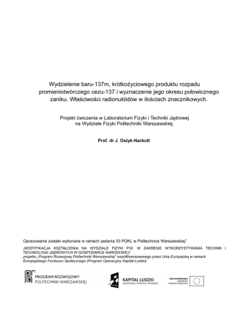 Wydzielenie baru-137m, krótkożyciowego produktu rozpadu promieniotwórczego cezu-137 i wyznaczenie jego okresu połowicznego zaniku. Właściwości radionuklidów w ilościach znacznikowych. Projekt ćwiczenia w Laboratorium Fizyki i Techniki Jądrowej na Wydziale Fizyki Politechniki Warszawskiej. Prof. dr J. Ostyk-Narbutt Opracowanie zostało wykonane w ramach zadania 33 POKL w Politechnice Warszawskiej” „MODYFIKACJA KSZTAŁCENIA NA WYDZIALE FIZYKI P.W. W ZAKRESIE WYKORZYSTYWANIA TECHNIK I TECHNOLOGII JĄDROWYCH W GOSPODARCE NARODOWEJ” projektu „Program Rozwojowy Politechniki Warszawskiej” współfinansowanego przez Unię Europejską w ramach Europejskiego Funduszu Społecznego (Program Operacyjny Kapitał Ludzki) Wydzielenie baru-137m, krótkożyciowego produktu rozpadu promieniotwórczego cezu-137 i wyznaczenie jego okresu połowicznego zaniku. Właściwości radionuklidów w ilościach znacznikowych. 1. Wstęp Radionuklid 137Cs (T1/2 = 30,1 lat, Eβ = 0,512 MeV), ważny produkt rozszczepienia uranu, jest jednym z bardziej kłopotliwych składników średnio- i niskoaktywnych odpadów promieniotwórczych generowanych przez elektrownie jądrowe w toku ich normalnej pracy. Powstający w procesie rozszczepienia z bardzo wysoką wydajnością (6,3 %), lotny w wysokiej temperaturze rdzenia pracującego reaktora, stosunkowo łatwo przedostaje się z paliwa jądrowego poprzez mikroszczeliny w koszulkach uszkodzonych elementów paliwowych do chłodziwa pierwotnego obiegu reaktora. Rozpad promieniotwórczy 137Cs przebiega zgodnie z poniższym schematem: Cs-137 (T1/2 = 30,1 lat) Eβ = 512 keV Ba-137m (T1/2 = 2,6 min) Eγ = 661 keV Ba-137 (trwały) Schemat 1. Rozpad promieniotwórczy radionuklidów 137Cs i 137mBa Para radionuklidów 137Cs/137mBa tworzy t.zw. układ generatorowy, który może być wykorzystany do produkcji radionuklidu pochodnego. Układy generatorowe składają się z par radionuklidów – macierzystego i pochodnego. Radionuklid macierzysty (stosunkowo długożyciowy) jest silnie związany ze złożem wypełniającym kolumnę chromatograficzną, a radionuklid pochodny – krótkożyciowy produkt rozpadu promieniotwórczego (zwykle β–) radionuklidu macierzystego – słabo wiąże się ze zlożem i jest łatwo wymywany z kolumny. Po każdorazowym wymyciu z kolumny radionuklidu pochodnego odczekuje się przez czas równy kilku okresom połowicznego rozpadu (T1/2) radionuklidu pochodnego. W tym czasie w kolumnie nagromadza się znowu znaczna ilość (> 90% wartości teoretycznej) radionuklidu pochodnego i wymywanie można ponowić. Generatory radionuklidów odgrywają obecnie kluczową rolę w produkcji radionuklidów dla medycyny nuklearnej – zarówno diagnostycznych, jak i terapeutycznych. Ważne są tu dwa aspekty: możliwość otrzymywania radionuklidów krótkożyciowych od razu w miejscach ich stosowania – klinikach, a zwłaszcza możliwość otrzymywania radionuklidów w bardzo małych stężeniach, często beznośnikowych, co jest niezbędne w przypadku znakowania radionuklidami substancji biologicznie czynnych (peptydy, przeciwciała). Ilości stosowanych radiofarmaceutyków tego typu i znakujących je radionuklidów muszą utrzymywać się na poziomie znacznikowym, tj. poniżej 10–8 g substancji lub stężeń poniżej 10–10 mol/dm3. Są to ilości niewagowe. Generatory radionuklidów stosowane są również do otrzymywania radioznaczników do badań przemysłowych, środowiskowych itp. Układ generatorowy 137Cs/137mBa – ze względu na krótki okres połowicznego rozpadu radionuklidu pochodnego – ma niewielkie znaczenie praktyczne [1], ale stanowi wartościowy układ demonstracyjny. Jak wynika ze schematu 1, 137mBa wymywany z generatora nie jest formalnie radionuklidem beznośnikowym. Wraz z promieniotwórczym izotopem 137mBa z kolumny wymywa się produkt jego rozpadu (przejścia izomerycznego 137mBa → 137Ba) – trwały izotop 137Ba, który, stanowi nośnik izotopowy radionuklidu 137mBa, a rozdzielenie mieszaniny tych izotopów jest praktycznie niemożliwe. Ilość nośnika nie jest jednak w tym przypadku duża. Liczba atomów (masa) nośnika jest zazwyczaj większa od ilości radionuklidu w próbce (patrz niżej), ale jeżeli proces wymywania baru z kolumny generatora powtarzany jest bezpośrednio jeden po drugim, ilości te są porównywalne. Ilość nośnika szybko rośnie z upływem czasu dzielącego dwa kolejne procesy wymywania baru. Takie preparaty promieniotwórcze, które zawierają radionuklid razem z jego trwałym lub długożyciowym izotopem – produktem rozpadu (przejścia izomerycznego) tego radionuklidu, nazywamy radionuklidami bez dodanego nośnika (no-carrier-added), w skrócie n.c.a. Proces nagromadzania się promieniotwórczych produktów 2 (tu macierzystego 1 (tu 137Cs) opisuje [1,2] równanie: N 2= 137m λ1 −λ t −λ t 0 −λ t N 01 e 1 −e 2 N 2 e 2 λ 2 −λ1 Ba) rozpadu radionuklidu (1) gdzie N2 – liczba atomów radionuklidu pochodnego po czasie t, N0 – początkowa (w czasie t=0) liczba atomów odpowiedniego radionuklidu, λ1 i λ2 – stałe rozpadu radionuklidu macierzystego i pochodnego (λ = ln2/T1/2). Stan równowagi procesu (kiedy szybkość nagromadzania radionuklidu pochodnego zrównuje się z szybkością jego zaniku) osiąga się praktycznie (99,9 %) po czasie równym od kilku do najwyżej 10 okresów T1/2(2), zależnie od wartości stosunku T1/2(1)/T1/2(2). 5 Radionuklid macierzysty w generatorach radionuklidów jest zawsze bardziej długożyciowy niż radionuklid pochodny, a więc T1/2(1) > T1/2(2) i λ1 < λ2. Jeżeli stosunki tych wartości nie są zbyt duże (najwyżej kilka do kilkudziesięciu razy), to aktywność promieniotwórcza radionuklidu pochodnego po osiągnięciu stanu równowagi zaczyna spadać z szybkością określoną przez stałą rozpadu radionuklidu macierzystego. Stan taki nazywamy równowagą przejściową. Przypadek taki będzie rozważany w następnym ćwiczeniu. Jeżeli