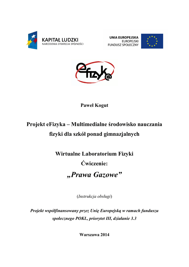 Paweł Kogut Projekt eFizyka – Multimedialne środowisko nauczania fizyki dla szkół ponad gimnazjalnych Wirtualne Laboratorium Fizyki Ćwiczenie: „Prawa Gazowe” (Instrukcja obsługi) Projekt współfinansowany przez Unię Europejską w ramach funduszu społecznego POKL, priorytet III, działanie 3.3 Warszawa 2014 Projekt współfinansowany ze środków Unii Europejskiej w ramach Europejskiego Funduszu Społecznego Spis treści 1. Cel Ćwiczenia .................................................................................................................... 3 2. Prawa Gazowe – teoria w zarysie....................................................................................... 3 3. Wirtualne Ćwiczenie .......................................................................................................... 4 3.1. Panel Użytkownika ...................................................................................................... 5 3.2. Przygotowanie Aparatury do pomiarów ...................................................................... 8 3.3. Wykonanie Ćwiczenia ............................................................................................... 11 3.3.1. Prawo Boyle’a-Mariotte’a .................................................................................. 12 3.3.2. Prawo Gay-Lussaca ............................................................................................ 14 3.3.3. Prawo Charlesa ................................................................................................... 16 4. Analiza danych i generowanie sprawozdania ............................................................... 17 Projekt współfinansowany ze środków Unii Europejskiej w ramach Europejskiego Funduszu Społecznego 1. Cel Ćwiczenia Celem ćwiczenia jest zbadanie właściwości gazu doskonałego w warunkach określonych przez prawa gazowe. W ćwiczeniu do badań wykorzystane zostanie powietrze jako najłatwiej dostępny gaz, którego zachowanie w dobrym przybliżeniu opisuje model gazu doskonałego. 2. Prawa Gazowe – teoria w zarysie Gaz jest to stan skupienia materii, w którym cząsteczki mają pełną swobodę ruchu. W zamkniętym naczyniu gaz zajmuje całą jego objętość wywierając stały nacisk (ciśnienie) na ścianki naczynia. Wielkościami fizycznymi (termodynamicznymi) opisującymi makroskopowy stan gazu, są ciśnienie, objętość i temperatura, które są związane tak zwanym równaniem stanu. Stwierdzono eksperymentalnie, że w niezbyt niskich temperaturach, oraz małych ciśnieniach większość gazów zachowuje się podobnie. Odkrycie to przy pewnych uproszczeniach doprowadziło do sformułowania wyidealizowanego modelu matematycznego zwanego gazem doskonałym, którego definicja jest następująca1: „Przez gaz doskonały rozumiemy gaz cząsteczek o pomijalnie małej własnej objętości cząsteczek, które mogą się sprężyście zderzać ze sobą, ale energia potencjalna ich wzajemnego oddziaływania wynosi zero. Cząsteczki takie posiadają jedynie energię kinetyczną” Gaz doskonały podlega tak zwanym trzem prawom gazowym, nazwanym od nazwisk ich twórców, 1. Prawo Boyle’a-Mariotte’a W stałej temperaturze objętość gazu jest odwrotnie proporcjonalna do ciśnienia, 2. Prawo Gay-Lussaca W stałym ciśnieniu, objętość gazu jest wprost proporcjonalna do temperatury, 3. Prawo Charlesa W stałej objętości, ciśnienie gazu jest wprost proporcjonalne do temperatury, 1 Definicja zaczerpnięta z, W. Bogusz, J. Garbarczyk, F. Krok, „Podstawy Fizyki”, Warszawa, 2005. Projekt współfinansowany ze środków Unii Europejskiej w ramach Europejskiego Funduszu Społecznego Z gazem doskonałym i prawami gazowymi bezpośrednio związane jest pojęcie „Warunków Normalnych”, które podaje, że dla ciśnienia p0=1atm=101325Pa, oraz T0=273,15K, objętość jednego mola gazu wynosi V0=22,414dm3. Stwierdzenie to, oraz treść prawa Avogadra, które głosi, że „Przy jednakowym ciśnieniu i temperaturze jednakowe objętości różnych gazów zawierają taką samą liczbę cząsteczek.” Doprowadziło do wyprowadzenia tak zwanej stałej gazowej oznaczanej literą R, . Ostatecznie równanie stanu gazu doskonałego wyrażano zależnością zwaną równaniem Clapeyrona, , Gdzie, p – ciśnienie, V – objętość, T – temperatura, R – stała gazowa, N – liczba moli gazu. Założenia gazu doskonałego są słuszne dla większości gazów w pewnych warunkach, które także zależą od rodzaju gazu. Dobrym przybliżeniem gazu doskonałego w szerokim spektrum warunków ciśnienia i temperatur jest gaz nam wszystkim bardzo dobrze znany powietrze. W bardzo ekstremalnych warunkach lub dla gazów, których objętość własna cząsteczek (rozmiar cząsteczki) jest duża i nie pomijalna, równanie gazu doskonałego przestaje obowiązywać. W tym miejscu stosowane są bardziej dokładne i złożone modele gazów tak zwanych gazów rzeczywistych jak choćby równanie stanu gazu Van der Waalsa. Bibliografia. 1. W. Bogusz, J. Garbarczyk, F. Krok, „Podstawy Fizyki”, Oficyna Wydawnicza Politechniki, Warszawskiej, Warszawa, 2005. 3. Wirtualne Ćwiczenie Wirtualne ćwiczenie „Prawa Gazowe”, jest symulacją doświadczenia badania praw gazowych gazu doskonałego. W eksperymencie przewidziano trzy ćwiczenia, Badanie prawa Boyle’a-Mariotte’a Projekt współfinansowany ze środków Unii Europejskiej w ramach Europejskiego Funduszu Społecznego Badanie prawa Gay-Lussac’a Badanie prawa Charles’a 3.1. Panel Użytkownika Panel użytkownika składa się z dwóch pól menu z przyciskami, wirtualnego magazynka na aparaturę pomiarową, oraz przycisku wirtualnego notatnika. Aparatura pomiarowa po jej wybraniu z wirtualnego magazynku jest umieszczania na widoku stołu laboratoryjnego tworzącego tło panelu użytkownika. Na rys. 1 przedstawiono widok panelu użytkownika z zaznaczonymi obiektami menu, wirtualnego magazynka i not