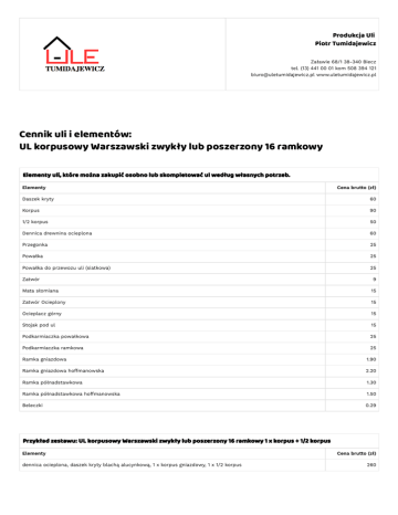 Produkcja Uli Piotr Tumidajewicz Załawie 68/1 38-340 Biecz tel. (13) 441 00 01 kom 508 394 121 [email protected] www.uletumidajewicz.pl Cennik uli i elementów: UL korpusowy Warszawski zwykły lub poszerzony 16 ramkowy Elementy uli, które można zakupić osobno lub skompletować ul według własnych potrzeb. Elementy Cena bru1o (zł) Daszek kryty 60 Korpus 90 1/2 korpus 50 Dennica drewnina ocieplona 60 Przegonka 25 Powałka 25 Powałka do przewozu uli (siatkowa) 25 Zatwór 9 Mata słomiana 15 Zatwór Ocieplony 15 Ocieplacz górny 15 Stojak pod ul 15 Podkarmiaczka powałkowa 25 Podkarmiaczka ramkowa 25 Ramka gniazdowa 1.90 Ramka gniazdowa hoffmanowska 2.20 Ramka półnadstawkowa 1.30 Ramka półnadstawkowa hoffmanowska 1.50 Beleczki 0.29 Przykład zestawu: UL korpusowy Warszawski zwykły lub poszerzony 16 ramkowy 1 x korpus + 1/2 korpus Elementy dennica ocieplona, daszek kryty blachą alucynkową, 1 x korpus gniazdowy, 1 x 1/2 korpus Cena bru1o (zł) 260 Przykład zestawu: UL korpusowy Warszawski zwykły lub poszerzony 16 ramkowy 1 x korpus + 2 x 1/2 korpus Elementy dennica ocieplona, daszek kryty blachą alucynkową, 1 x korpus gniazdowy, 2 x 1/2 korpus Cena bru1o (zł) 310