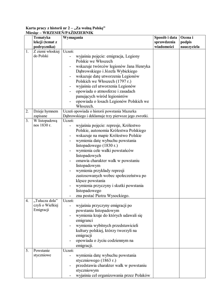 Karta pracy z historii nr 2 – „Za wolną Polskę” Miesiąc – WRZESIEŃ/PAŹDZIERNIK Tematyka Wymagania lekcji (temat z podręcznika) 1. Z ziemi włoskiej Uczeń: do Polski - wyjaśnia pojęcie: emigracja, Legiony 2. 3. Dzieje hymnem zapisane W listopadową nos 1830 r. Uczeń opowiada o historii powstania Mazurka Dąbrowskiego i deklamuje trzy pierwsze jego zwrotki. Uczeń: - 4. „Tułacza dola” czyli o Wielkiej Emigracji - - Powstanie styczniowe wyjaśnia pojęcie: represje, Królestwo Polskie, autonomia Królestwa Polskiego wskazuje na mapie Królestwo Polskie wymienia datę wybuchu powstania listopadowego (1830 r.) wymienia cele walki powstańców listopadowych omawia charakter walk w powstaniu listopadowym wymienia przykłady represji zastosowanych wobec społeczeństwa po klęsce powstania wymienia przyczyny i skutki powstania listopadowego zna postać Piotra Wysockiego. Uczeń: - 5. Polskie we Włoszech wskazuje twórców legionów Jana Henryka Dąbrowskiego i Józefa Wybickiego wskazuje datę utworzenia Legionów Polskich we Włoszech (1797 r.) wyjaśnia cel utworzenia Legionów opowiada o atmosferze i zasadach panujących wśród legionistów opowiada o losach Legionów Polskich we Włoszech. wyjaśnia przyczyny emigracji po powstaniu listopadowym wymienia kraje do których udawali się emigranci wymienia wybitnych przedstawicieli kultury polskiej, którzy tworzyli na emigracji opowiada o życiu codziennym na emigracji. Uczeń: - wymienia datę wybuchu powstania styczniowego (1863 r.) przedstawia charakter walk w powstaniu styczniowym wyjaśnia cel organizowania przez Polaków Sposób i data Ocena i sprawdzenia podpis wiadomości nauczyciela - - 6. 7. Powtórzenia wiadomości Sprawdzian wiadomości powstań narodowych wyjaśnia cel i przyczyny działalności spiskowej Polaków po upadku powstania listopadowego wymienia przykłady represji zastosowanych po klęsce powstania styczniowego wyjaśnia pojęcie: branka wymienia przyczyny i skutki powstania styczniowego. Powtórzenie wiadomości z karty pracy nr 2 Sprawdzian wiadomości z karty pracy nr 2
