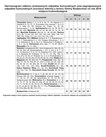 Harmonogram odbioru zmieszanych odpadów komunalnych oraz segregowanych odpadów komunalnych (surowce wtórne) z terenu Gminy Bodzechów na rok 2016 miejsca trudnodostępne Miesiąc Miejscowość VII VIII IX X XI XII 13 10 13 12 15 14 14 11 14 13 16 15 18 17 16 14 18 16 19 18 22 18 21 21 20 19 23 19 22 22 21 22 19 20 23 20 Chmielów (Bieliny 1, 2, 3, 8, 9, 15, 17, 19, Gajowa 3, 5, Jeziórki 6, 8, 13, 15, 17, Kunowska 12a, Łukowa 1, 1a, 2, 4, 5, 6, Miła 26, 28, Zacisze 40, Piaski 13, 16, 26, Romanowska 1, 2, 6), Jędrzejowice (23, 24, 25, 60, 61, 82, 95–108), Mychów (20, 21, 64, 68, 69, 70, 72, 78, 79, 80), Mychów Kolonia (29–38, 41, 48, 60–65), Świrna (8, 9, 9a, 17, 99, 100, 101, 102, 103, 104, 105a, 106, 107, 108, 110, 110a, 111, 112, 113, 114, 115, 116) Jędrzejów (30), Miłków (Cicha 5, 6, 7, 8, Kasztanowa 1, 2, 5, 7, Ostrowiecka 2, 4, 123, Poręba, Wierzbowa 1, 3, 5, 7, 8, Wiśniowa 2, 2a, 3, 3a, 4, 5, Wschodnia 2, Źródlana 1, 3, 5, 7, 7a, 9), Denkówek (67a, 68b, 71, 73, 87, 89-97), Moczydło (10, 11, 12a) Szewna (Langiewicza 25C, Armii Krajowej 34, 36a, 38, 40, 42, 44, 44a, 46, Brzeźniakówka 1, 2/1, 3, 4/2, 5, 6, 7, 10, 14, 16, Boczna 4, 6, 8, 10, 12, Kielecka 37C, 37D, Leśna 3, 4, 5, Słodowa 25, Zofiówka 13, 15, 17, 19, 19a, 19b, 21, 21a, 21b, 23, 25, 27, Wiejska 1a, 3, 5, 6, Woźniakówka 13, 19, 20, 21, 23, 25, 26, 27, 28, 29, 30, 31, 31a), Szyby (64) Magonie (45, 49, 49a, 68, 71), Przyborów (12a, 15a, 16, 16a, 17, 18, 19, 19a, 20, 21, 21a/1, 21a/2, 23, 24, 24a, 25, 26, 28, 36, 37, 38, 38a, 69, 70, 70a), Sudół (60, 61, 62, 128, 129, 134, 143, 200), Sudół-Kotówka (61, 62), Nowa Dębowa Wola (31, 32, 34), Sarnówek Duży (13, 13a, 13d, 15), Sarnówek Duży Dunale (90, 94, 96, 100) Broniszowice (4, 5, 5a, 6, 7, 26, 29, 30, 31, 32, 34, 36, Wrzosy (40, 42, 43)), Gromadzice (Osiedle Zagaje 1, 2, 17, 19, 21, 27, 28, 29, Szewieńska 14, 16, 18, 20, 22, Świętokrzyska 29), Mirkowice (61), Kosowice (2, 3, 12, 14, 15, 17, 18, 19, 20a, 23, 23a, 24, 32, 35, 36, 44, 45, 60, 70, 71, 79, 80, 81, 84, 85, 87, 91), Szwarszowice (1, 2, 7, 9, 43, 44, 66, 67, 68, 68a, 69, 71, 71a), Podszkodzie (79, 81, 81a, 82a, 84, 89, 110, 111) Bodzechów (Kolejowa 58) Pojemniki należy w dniu wywozu wystawić przed posesję. Odbiór odpadów i surowców odbywa się od godziny 6.00. Zbiórka odpadów wielkogabarytowych oraz zużytego sprzętu elektrycznego i elektronicznego z terenu Gminy Bodzechów w roku 2016 miejsca trudnodostępne Miejscowość Chmielów (Bieliny 1, 2, 3, 8, 9, 15, 17, 19, Gajowa 3, 5, Jeziórki 6, 8, 13, 15, 17, Łukowa 1, 1a, 2, 4, 5, 6, Miła 26, 28, Zacisze 40, Piaski 13, 16, 26, Romanowska 1, 2, 6), Jędrzejowice (23, 24, 25, 60, 61, 82, 95–108), Mychów (20, 21, 64, 68, 69, 70, 72, 78, 79, 80), Mychów Kolonia (29– 38, 41, 48, 60–65), Świrna (8, 9, 9a, 17, 99, 100, 101, 102, 103, 104, 105a, 106, 107, 108, 110, 110a, 111, 112, 113, 114, 115, 116) Jędrzejów (30), Miłków (Cicha 5, 6, 7, 8, Kasztanowa 1, 2, 7, Ostrowiecka 2, 4, 123, Poręba, Wierzbowa 1, 3, 5, 7, 8, Wiśniowa 2, 2a, 3, 3a, 4, 5, Wschodnia 2, Źródlana 1, 3, 5, 7, 7a, 9), Denkówek (67a, 68b, 71, 73, 87, 89-97), Moczydło (10, 11, 12a) Szewna (Langiewicza 25C, Armii Krajowej 34, 36a, 38, 40, 42, 44, 44a, 46, Brzeźniakówka 1, 2/1, 3, 4/2, 5, 6, 7, 10, 14, 16, Boczna 4, 6, 8, 10, 12, Kielecka 37C, 37D, Leśna 3, 4, 5, Słodowa 25, Zofiówka 13, 15, 17, 19, 19a, 19b, 21, 21a, 21b, 23, 25, 27, Wiejska 1a, 3, 5, 6, Woźniakówka 13, 19, 20, 21, 23, 25, 26, 27, 28, 29, 30, 31, 31a), Szyby (64) Magonie (45, 49, 49a, 68, 71), Przyborów (12a, 15a, 16, 16a, 17, 18, 19, 19a, 20, 21a/1, 21a/2, 23, 24, 24a, 25, 26, 28, 36, 37, 38, 38a, 69, 70, 70a), Sudół (60, 61, 62, 128, 129, 134, 143, 200), Nowa Dębowa Wola (31, 32, 34), Sarnówek Duży (13, 13a, 13d, 15), Sarnówek Duży Dunale (90, 94, 96, 100) Broniszowice (4, 5, 5a, 6, 7, 26, 29, 30, 31, 32, 34, 36, 40, 42, 43), Gromadzice (Osiedle Zagaje 1, 2, 17, 19, 21, 27, 28, 29, Szewieńska 14, 16, 18, 20, 22, Świętokrzyska 29), Mirkowice (61), Kosowice (2, 3, 12, 14, 15, 17, 18, 19, 20a, 23, 23a, 24, 32, 35, 36, 44, 45, 60, 70, 71, 79, 80, 81, 84, 85, 87, 91), Szwarszowice (1, 2, 7, 9, 43, 44, 66, 67, 68, 68a, 69, 71, 71a), Podszkodzie (79, 81, 81a, 82a, 84, 89, 110, 111) Bodzechów (Kolejowa 58) Data 12.10.2016 13.10.2016 14.10.2016 18.10.2016 19.10.2016 20.10.2016 Odpady wielkogabarytowe oraz sprzęt RTV/AGD należy wystawić przed posesję. Odbiór odpadów odbywa się od godziny 6.00. Odpady wielkogabarytowe to odpady komunalne powstające w naszych domach, które ze względu na duże rozmiary lub wagę nie mieszczą się w standardowych kontenerach na śmieci. Do tej grupy odpadów zaliczmy: stoły, krzesła, szafy, tapczany, łóżka, fotele, dywany, materace, pierzyny, rowery, zabawki dużych rozmiarów, itp. Do odpadów wielkogabarytowych nie należą wszelkiego rodzaju części budowlane i sanitarne takie jak deski drewniane, belki, panele, ramy okienne, drzwi, płoty, wanny, umywalki, muszle toaletowe lub spłuczki, grzejniki, płytki, rolety jak również opony, części samochodowe, motorowery, kosiarki spalinowe, odpady remontowe, odpady ogrodowe, worki lub kartony z odpadami domowymi. **Zużyty sprzęt elektryczny i elektroniczny. Do zużytego sprzętu elektrycznego i elektronicznego zaliczamy: wielkogabarytowe urządzenia gospodarstwa domowego (np.: chłodziarki, zamrażarki, pralki, suszarki do ubrań, zmywarki, mikrofalówki, grzejniki elektryczne, wentylatory elektryczne, urządzenia klimatyzacyjne), małogabarytowe urządzenia gospodarstwa domowego (np.: odkurzacze, zamiatacze dywanów, żelazka, tostery, frytkownice, noże elektryczne, urządzenia do pielęgnacji włosów i ciała oraz wag), sprzęt teleinformacyjny i telekomunikacyjny (np.: komputery, laptopy (w tym procesor, mysz, monitor i klawiatura), stacje robocze, notebooki, notepady, kalkulatory kieszonkowe i biurowe, elektryczne i elektroniczne maszyny do pisania, fak