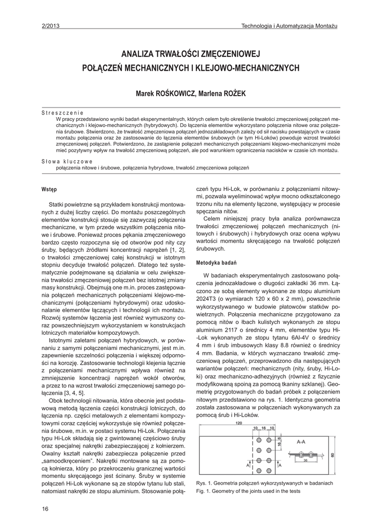 2/2013 Technologia i Automatyzacja Montażu ANALIZA TRWAŁOŚCI ZMĘCZENIOWEJ POŁĄCZEŃ MECHANICZNYCH I KLEJOWO-MECHANICZNYCH Marek ROŚKOWICZ, Marlena ROŻEK Streszczenie W pracy przedstawiono wyniki badań eksperymentalnych, których celem było określenie trwałości zmęczeniowej połączeń mechanicznych i klejowo-mechanicznych (hybrydowych). Do łączenia elementów wykorzystano połączenia nitowe oraz połączenia śrubowe. Stwierdzono, że trwałość zmęczeniowa połączeń jednozakładowych zależy od sił nacisku powstających w czasie montażu połączenia oraz że zastosowanie do łączenia elementów śrubowych (w tym Hi-Loków) powoduje wzrost trwałości zmęczeniowej połączeń. Potwierdzono, że zastąpienie połączeń mechanicznych połączeniami klejowo-mechanicznymi może mieć pozytywny wpływ na trwałość zmęczeniową połączeń, ale pod warunkiem ograniczenia nacisków w czasie ich montażu. Słowa kluczowe połączenia nitowe i śrubowe, połączenia hybrydowe, trwałość zmęczeniowa połączeń Wstęp Statki powietrzne są przykładem konstrukcji montowanych z dużej liczby części. Do montażu poszczególnych elementów konstrukcji stosuje się zazwyczaj połączenia mechaniczne, w tym przede wszystkim połączenia nitowe i śrubowe. Ponieważ proces pękania zmęczeniowego bardzo często rozpoczyna się od otworów pod nity czy śruby, będących źródłami koncentracji naprężeń [1, 2], o trwałości zmęczeniowej całej konstrukcji w istotnym stopniu decyduje trwałość połączeń. Dlatego też systematycznie podejmowane są działania w celu zwiększenia trwałości zmęczeniowej połączeń bez istotnej zmiany masy konstrukcji. Obejmują one m.in. proces zastępowania połączeń mechanicznych połączeniami klejowo-mechanicznymi (połączeniami hybrydowymi) oraz udoskonalanie elementów łączących i technologii ich montażu. Rozwój systemów łączenia jest również wymuszony coraz powszechniejszym wykorzystaniem w konstrukcjach lotniczych materiałów kompozytowych. Istotnymi zaletami połączeń hybrydowych, w porównaniu z samymi połączeniami mechanicznymi, jest m.in. zapewnienie szczelności połączenia i większej odporności na korozję. Zastosowanie technologii klejenia łącznie z połączeniami mechanicznymi wpływa również na zmniejszenie koncentracji naprężeń wokół otworów, a przez to na wzrost trwałości zmęczeniowej samego połączenia [3, 4, 5]. Obok technologii nitowania, która obecnie jest podstawową metodą łączenia części konstrukcji lotniczych, do łączenia np. części metalowych z elementami kompozytowymi coraz częściej wykorzystuje się również połączenia śrubowe, m.in. w postaci systemu Hi-Lok. Połączenia typu Hi-Lok składają się z gwintowanej częściowo śruby oraz specjalnej nakrętki zabezpieczającej z kołnierzem. Owalny kształt nakrętki zabezpiecza połączenie przed „samoodkręceniem”. Nakrętki montowane są za pomocą kołnierza, który po przekroczeniu granicznej wartości momentu skręcającego jest ścinany. Śruby w systemie połączeń Hi-Lok wykonane są ze stopów tytanu lub stali, natomiast nakrętki ze stopu aluminium. Stosowanie połą16 czeń typu Hi-Lok, w porównaniu z połączeniami nitowymi, pozwala wyeliminować wpływ mocno odkształconego trzonu nitu na elementy łączone, występujący w procesie spęczania nitów. Celem niniejszej pracy była analiza porównawcza trwałości zmęczeniowej połączeń mechanicznych (nitowych i śrubowych) i hybrydowych oraz ocena wpływu wartości momentu skręcającego na trwałość połączeń śrubowych. Metodyka badań W badaniach eksperymentalnych zastosowano połączenia jednozakładowe o długości zakładki 36 mm. Łączono ze sobą elementy wykonane ze stopu aluminium 2024T3 (o wymiarach 120 x 60 x 2 mm), powszechnie wykorzystywanego w budowie płatowców statków powietrznych. Połączenia mechaniczne przygotowano za pomocą nitów o łbach kulistych wykonanych ze stopu aluminium 2117 o średnicy 4 mm, elementów typu Hi-Lok wykonanych ze stopu tytanu 6Al-4V o średnicy 4 mm i śrub imbusowych klasy 8.8 również o średnicy 4 mm. Badania, w których wyznaczano trwałość zmęczeniową połączeń, przeprowadzono dla następujących wariantów połączeń: mechanicznych (nity, śruby, Hi-Loki) oraz mechaniczno-adhezyjnych (również z fizycznie modyfikowaną spoiną za pomocą tkaniny szklanej). Geometrię przygotowanych do badań próbek z połączeniem nitowym przedstawiono na rys. 1. Identyczna geometria została zastosowana w połączeniach wykonywanych za pomocą śrub i Hi-Loków. Rys. 1. Geometria połączeń wykorzystywanych w badaniach Fig. 1. Geometry of the joints used in the tests Technologia i Automatyzacja Montażu Do przygotowania próbek wykorzystano Hi-Loki typu HL 1012 oraz klucz dynamometryczny firmy BAHCO model IZO-DM-30 o zakresie pomiarowym 3 ÷ 30 Nm i dokładności ± 2%. Średnia wartość momentu obrotowego, przy której kołnierz nakrętki Hi-Lok był ścinany, wynosiła 2,8 ± 0,1 Nm. W celu zabezpieczenia nakrętek przed odkręcaniem się w czasie badań zmęczeniowych do ich montażu wykorzystano tworzywo adhezyjne firmy Loctite 275. Do wykonania połączenia adhezyjnego wykorzystano klej epoksydowy Epidian 57/Z1 utwardzany przez 24 godziny w temperaturze ok. 20°C, a następnie dotwardzany przez 6 godzin w temperaturze 80°C. Grubość spoiny klejowej wynosiła 0,1 mm. Do badań przygotowano również połączenia z modyfikowaną fizycznie spoiną. Modyfikacja polegała na wprowadzeniu do spoiny jednej warstwy tkaniny szklanej Synglass E86 o gramaturze 101 g/m2. Powierzchnie elementów klejonych przygotowano do tego procesu metodą piaskowania (wykorzystano ziarno elektrokorundu o granulacji F40). Przed piaskowaniem i po piaskowaniu powierzchnie do klejenia przemyto acetonem. Połączenia mechaniczne wykonywano natychmiast po klejeniu (przed utwardzeniem kleju). Przygo