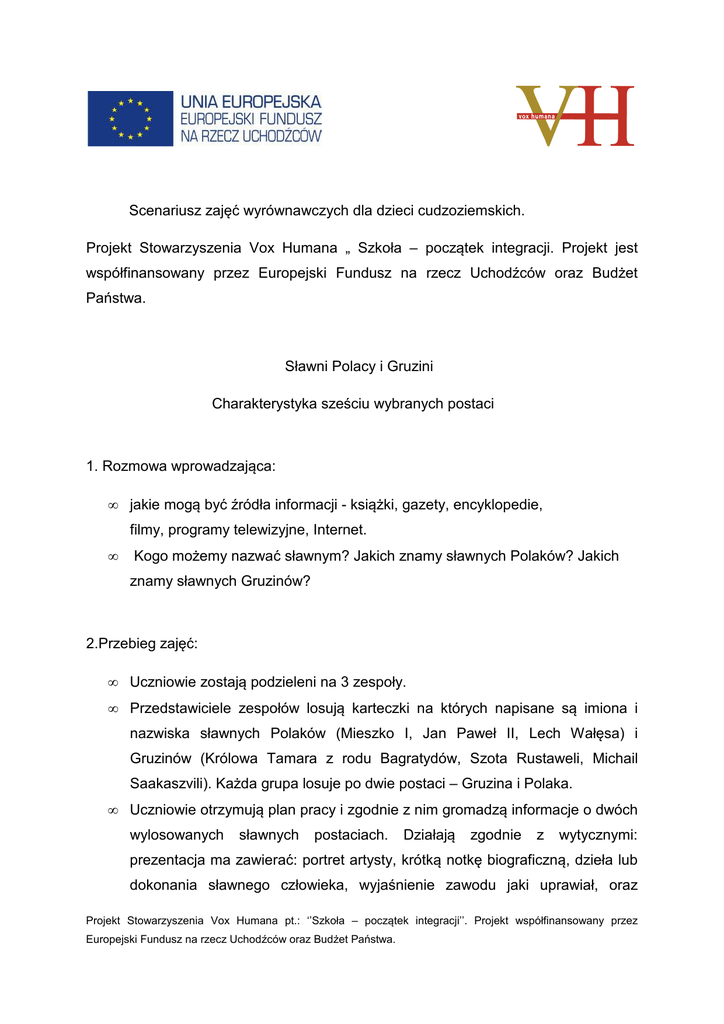 Scenariusz zajęć wyrównawczych dla dzieci cudzoziemskich. Projekt Stowarzyszenia Vox Humana „ Szkoła – początek integracji. Projekt jest współfinansowany przez Europejski Fundusz na rzecz Uchodźców oraz Budżet Państwa. Sławni Polacy i Gruzini Charakterystyka sześciu wybranych postaci 1. Rozmowa wprowadzająca: • jakie mogą być źródła informacji - książki, gazety, encyklopedie, filmy, programy telewizyjne, Internet. • Kogo możemy nazwać sławnym? Jakich znamy sławnych Polaków? Jakich znamy sławnych Gruzinów? 2.Przebieg zajęć: • Uczniowie zostają podzieleni na 3 zespoły. • Przedstawiciele zespołów losują karteczki na których napisane są imiona i nazwiska sławnych Polaków (Mieszko I, Jan Paweł II, Lech Wałęsa) i Gruzinów (Królowa Tamara z rodu Bagratydów, Szota Rustaweli, Michail Saakaszvili). Każda grupa losuje po dwie postaci – Gruzina i Polaka. • Uczniowie otrzymują plan pracy i zgodnie z nim gromadzą informacje o dwóch wylosowanych sławnych postaciach. Działają zgodnie z wytycznymi: prezentacja ma zawierać: portret artysty, krótką notkę biograficzną, dzieła lub dokonania sławnego człowieka, wyjaśnienie zawodu jaki uprawiał, oraz Projekt Stowarzyszenia Vox Humana pt.: ‘’Szkoła – początek integracji’’. Projekt współfinansowany przez Europejski Fundusz na rzecz Uchodźców oraz Budżet Państwa. przemyślenia grupy na temat znaczenia przedstawianej postaci dla narodu lub świata. • Uczniowie z pomocą prowadzącego przygotowują krótką prezentację o sławnym człowieku. • Uczniowie w grupach wychodzą kolejno na środek klasy i opowiadają o wybranych postaciach (po polsku; tworząc grupy pamiętamy o tym, aby dobierać dzieci ze względu na stopień znajomości języka). Na tablicy zamieszczają zdjęcia przedstawiające sławne osoby oraz najciekawsze fakty z życia sławnej osoby, jej dokonania, itd. • Po zakończeniu wszystkich prezentacji następuje losowanie i dzieci otrzymują nowe zadanie polegające na sprawdzeniu nabytej w czasie lekcji wiedzy: • grupa prezentująca królową Tamarę z rodu Bagratydów i Mieszka I losuje teraz pomiędzy dwoma możliwościami: Jan Paweł II/Szota Rustaweli, a Lech Wałęsa/ Michail Saakaszvili; • Z rozsypanki wyrazowej przygotowanej wcześniej przez prowadzącego dzieci tworzą zdania charakteryzujące wybraną postać; • Uczestnicy otrzymują do rozwiązania krzyżówkę – rozwiązanie stanowi nazwisko sławnej osoby, a hasła to terminy związane z jego życiem działalnością; • Dzieci rozwiązują mini test z wiedzy na temat wybranych postaci; • Dzieci układają puzzle przedstawiające portrety omawianych sławnych ludzi. Projekt Stowarzyszenia Vox Humana pt.: ‘’Szkoła – początek integracji’’. Projekt współfinansowany przez Europejski Fundusz na rzecz Uchodźców oraz Budżet Państwa. Cele: Przybliżenie wiadomości o wybranych przez prowadzącego sławnych Polakach i Gruzinach, przybliżenie polskiej i gruzińskiej kultury i tradycji, historii i religii, zdobycie nowych wiadomości, poszerzenie wiadomości z zakresu słownictwa polskiego. Cele szczegółowe: Uczniowie potrafią: • samodzielnie korzystać z różnych źródeł informacji, • współpracować w grupie, • formułować i zapisywać wnioski wynikające z dyskusji, • wypowiadać się w czasie dyskusji na opracowany przez grupę temat, • dokonywać wyboru najistotniejszych informacji • wyrażać się poprzez plastyczne ilustrowanie najciekawszych wydarzeń z życia wybranej sławnej osoby Projekt Stowarzyszenia Vox Humana pt.: ‘’Szkoła – początek integracji’’. Projekt współfinansowany przez Europejski Fundusz na rzecz Uchodźców oraz Budżet Państwa.