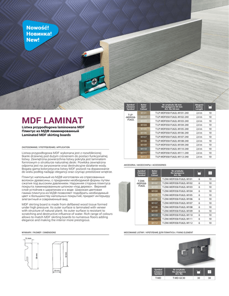 Nowość! Новинка! New! MDF LAMINAT Listwa przypodłogowa laminowana MDF Плинтус из МДФ ламинированный Laminated MDF skirting boards ZASTOSOWANIE / УПОТРЕБЛЕНИЕ / APPLICATION Listwa przypodłogowa MDF wykonana jest z rozwłóknionej tkanki drzewnej pod dużym ciśnieniem do postaci funkcjonalnej listwy. Zewnętrzna powierzchnia listwy pokryta jest laminatem fornirowym o strukturze naturalnej deski. Powłoka zewnętrzna odporna jest na zarysowanie oraz destrukcyjne działanie wody. Bogata gama kolorystyczna listwy MDF pozwoli na dopasowanie do wielu podłóg nadając elegancji oraz czyniąc prestiżowe wnętrze. Плинтус напольный из МДФ изготовлен из спресованных волокон древесины, с приданием необходимой формы путем сжатия под высоким давлением. Наружняя сторона плинтуса покрыта ламинированным шпоном «под дерево». Верхний слой устойчив к царапинам и к воде. Широкая цветовая гамма плинтуса из МДФ позволяет подобрать необходимый цвет к большинству напольных покрытий, придает интерьеру элегантный и современный вид. MDF skirting board is made from defibered wood tissue formed under high pressure. Its outer surface is laminated with veneer with structure of natural plank. Its outer surface is resistant to scratching and destructive influence of water. Rich range of colours allows to match MDF skirting boards to numerous floors adding elegance and making the interior more prestigious. Kolor Цвет Colour Nr artykułu 58 mm No продукта 58 mm Art. No 58 mm Długość Длина Length T-LP-MDF058-FU62L M101 T-LP-MDF058-FU62L-M101-240 2,4 m 10 M102 T-LP-MDF058-FU62L-M102-240 2,4 m 10 M103 T-LP-MDF058-FU62L-M103-240 2,4 m 10 M104 T-LP-MDF058-FU62L-M104-240 2,4 m 10 M105 T-LP-MDF058-FU62L-M105-240 2,4 m 10 M106 T-LP-MDF058-FU62L-M106-240 2,4 m 10 M107 T-LP-MDF058-FU62L-M107-240 2,4 m 10 M108 T-LP-MDF058-FU62L-M108-240 2,4 m 10 M109 T-LP-MDF058-FU62L-M109-240 2,4 m 10 M110 T-LP-MDF058-FU62L-M110-240 2,4 m 10 M111 T-LP-MDF058-FU62L-M111-240 2,4 m 10 M112 T-LP-MDF058-FU62L-M112-240 2,4 m 10 AKCESORIA / AКСЕССУАРЫ / ACCESSORIES Symbol Символ Symbol T-ZAK-MDF058-FU62L Kolor Цвет Colour Nr artykułu No продукта Art. No M101 T-ZAK-MDF058-FU62L-M101 6 10 M102 T-ZAK-MDF058-FU62L-M102 6 10 M103 T-ZAK-MDF058-FU62L-M103 6 10 M104 T-ZAK-MDF058-FU62L-M104 6 10 M105 T-ZAK-MDF058-FU62L-M105 6 10 M106 T-ZAK-MDF058-FU62L-M106 6 10 M107 T-ZAK-MDF058-FU62L-M107 6 10 M108 T-ZAK-MDF058-FU62L-M108 6 10 M109 T-ZAK-MDF058-FU62L-M109 6 10 M110 T-ZAK-MDF058-FU62L-M110 6 10 M111 T-ZAK-MDF058-FU62L-M111 6 10 M112 T-ZAK-MDF058-FU62L-M112 6 10 30 30 MOCOWANIE LISTWY / КРЕПЛЕНИЕ ДЛЯ ПЛИНТУСА / FIXING ELEMENT 62 mm WYMIARY / РАЗМЕР / DIMENSIONS Symbol Символ Symbol 18 mm Symbol Символ Symbol Nr artykułu No продукта Art. No T-MD T-MD-GC30
