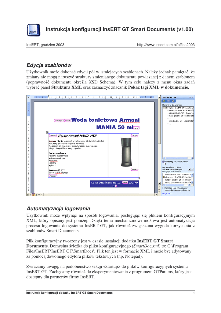 Instrukcja konfiguracji InsERT GT Smart Documents (v1.00) InsERT, grudzie 2003 http://www.insert.com.pl/office2003 Edycja szablonów U ytkownik mo e dokona edycji pól w istniej cych szablonach. Nale y jednak pami ta , e zmiany nie mog naruszy struktury zmienianego dokumentu powi zanej z danym szablonem (poprawno dokumentu okre la XSD Schema). W tym celu nale y z menu okna zada wybra panel Struktura XML oraz zaznaczy znacznik Poka tagi XML w dokumencie. Automatyzacja logowania U ytkownik mo e wpłyn na sposób logowania, posługuj c si plikiem konfiguracyjnym XML, który opisany jest poni ej. Dzi ki temu mechanizmowi mo liwa jest automatyzacja procesu logowania do systemu InsERT GT, jak równie zwi kszona wygoda korzystania z szablonów Smart Documents. Plik konfiguracyjny tworzony jest w czasie instalacji dodatku InsERT GT Smart Documents. Domy lna cie ka do pliku konfiguracyjnego (SmartDoc.xml) to: C:\Program Files\InsERT\InsERT GT\SmartDocs\. Plik ten jest w formacie XML i mo e by edytowany za pomoc dowolnego edytora plików tekstowych (np. Notepad). Zwracamy uwag , na podobie stwo sekcji <startup> do plików konfiguracyjnych systemu InsERT GT. Zach camy równie do eksperymentowania z programem GTParams, który jest dost pny dla partnerów firmy InsERT. Instrukcja konfiguracji dodatku InsERT GT Smart Documents 1 Przykładowy plik konfiguracyjny smartdoc.xml: <?xml version="1.0" encoding="windows-1250" ?> <cfg> <startup> <sql_server>(LOCAL)\InsERT GT</sql_server> <auth_mode>MIXED</auth_mode> <sql_login encrypted='0'>sa</sql_login> <database/> <login encrypted='0' /> </startup> <errorlog>C:\SmartDocErrorLog.xml</errorlog> <smartletter> <errorlog>C:\SmartDocErrorLog.xml</errorlog> </smartletter> <smartestimate> <errorlog>C:\SmartDocErrorLog.xml</errorlog> </smartestimate> <smartoffer> <errorlog>C:\SmartDocErrorLog.xml</errorlog> </smartoffer> </cfg> Sekcja <startup> jest dokładnie opisana w instrukcji instalacji systemu InsERT GT i odpowiada za logowanie do systemu InsERT GT. Wszystkie elementy <errorlog> s opcjonalne, pozwalaj one na ledzenie działania szablonów InsERT GT Smart Documents w razie wyst pienia problemów. Element <errorlog> w sekcji głównej <cfg> wskazuje plik, gdzie zapisywane s wyj tki zgłaszane przez wspólne komponenty wszystkich szablonów. Ka dy szablon w InsERT GT Smart Documents pozwala na wyszczególnienie pliku, gdzie b d zapisane wyj tki specyficzne dla tego szablonu – cie ka do tego pliku jest okre lona w elemencie <errorlog> przypisanej do odpowiedniego szablonu. Edycja zawarto ci listów Zaawansowan czynno ci jest równie przygotowanie zawarto ci listów, które b dzie mo na wykorzysta w szablonie List. Zawarto listu zapisuje si w formacie DDF, którego opis znajduje si poni ej: Pliki DDF s standardowymi plikami XML o okre lonej strukturze. Kodowanie powinno by ustawione na UTF-8. Poni ej znajduje si opis struktury pliku. Instrukcja konfiguracji dodatku InsERT GT Smart Documents 2 <?xml version="1.0" encoding="utf-8" ?> <root> <title>Tytuł</title> <description>Opis</description> <content>Tre fragmentu dokumentu</content> </root> Mo e wyst pi tylko jeden element główny root. Musi on zawiera trzy elementy: • title – tytuł fragmentu dokumentu, który b dzie wy wietlany w panelu „Akcje dokumentu” podczas korzystania z szablonu InsERT GT – Szablon listu • description – krótki opis tre ci pozwalaj cy na zorientowanie si u ytkownika w przeznaczeniu danego fragmentu listu • content – tre dokumentu jaka zostanie wstawiona do edytowanego listu, je li u ytkownik wybierze ten fragment. Ka dy z ww. elementów mo e wyst pi tylko jeden raz. Pliki DDF znajduj si w podfolderze widocznym w folderze [katalog u ytkownika] \ Ustawienia lokalne \ Dane aplikacji \ Microsoft \ Schemas \ SmartLetter, czyli na przykład: C:\Documents and Settings\Agnieszka\Ustawienia lokalne\Dane aplikacji\Microsoft\Schemas\SmartLetter\ W tym folderze nale y odnale podfolder z plikami DDF. S to pliki w formacie XML, ale z rozszerzeniem DDF. Mo na je edytowa ka dym edytorem tekstów obsługuj cym kodowanie UTF-8, np. Notepad. Koniec. Instrukcja konfiguracji dodatku InsERT GT Smart Documents 3